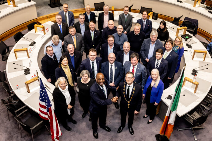 During the signing, Mayor John Moran, Cllr Dan McSweeney, and Council director general Dr Pat Daly welcomed a delegation from Savannah, including Mayor Van R Johnson II and Savannah World Trade Center president Marty Hogan.