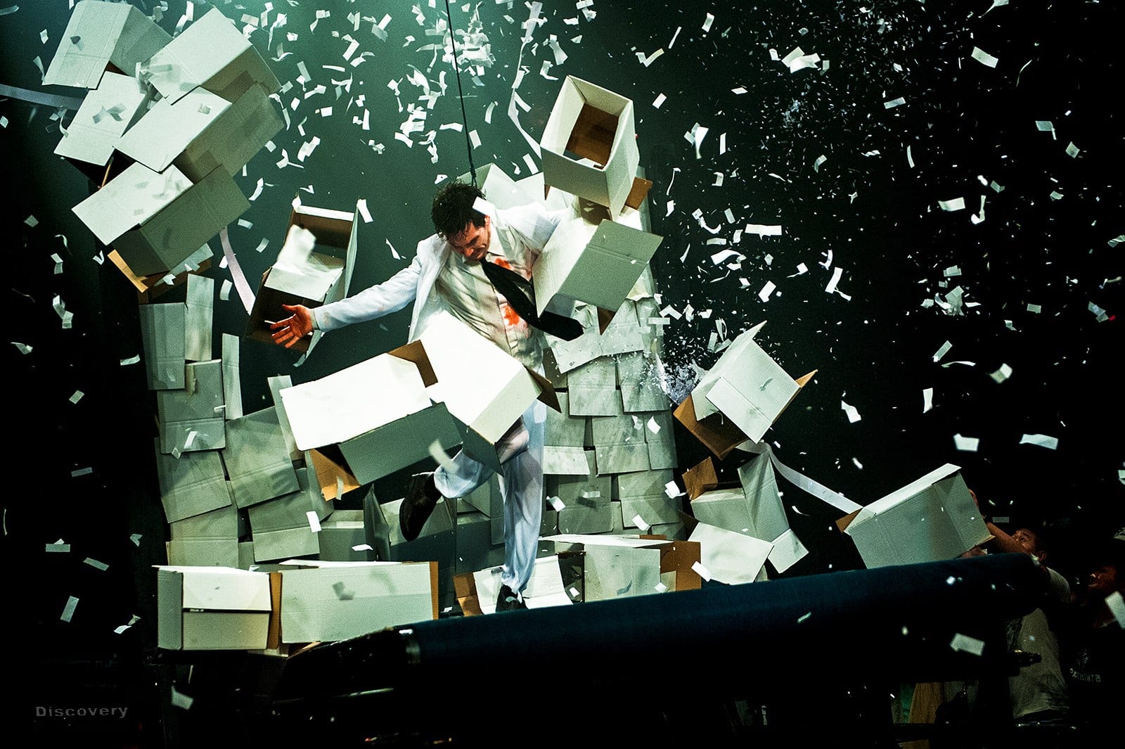 Yet there was fear with the frolics. This is a roller coaster of high-wire acts, ‘running man’ shot through the heart, polysterene walls breaking over heads and shrieking dervishes who scale pneumatic walls.