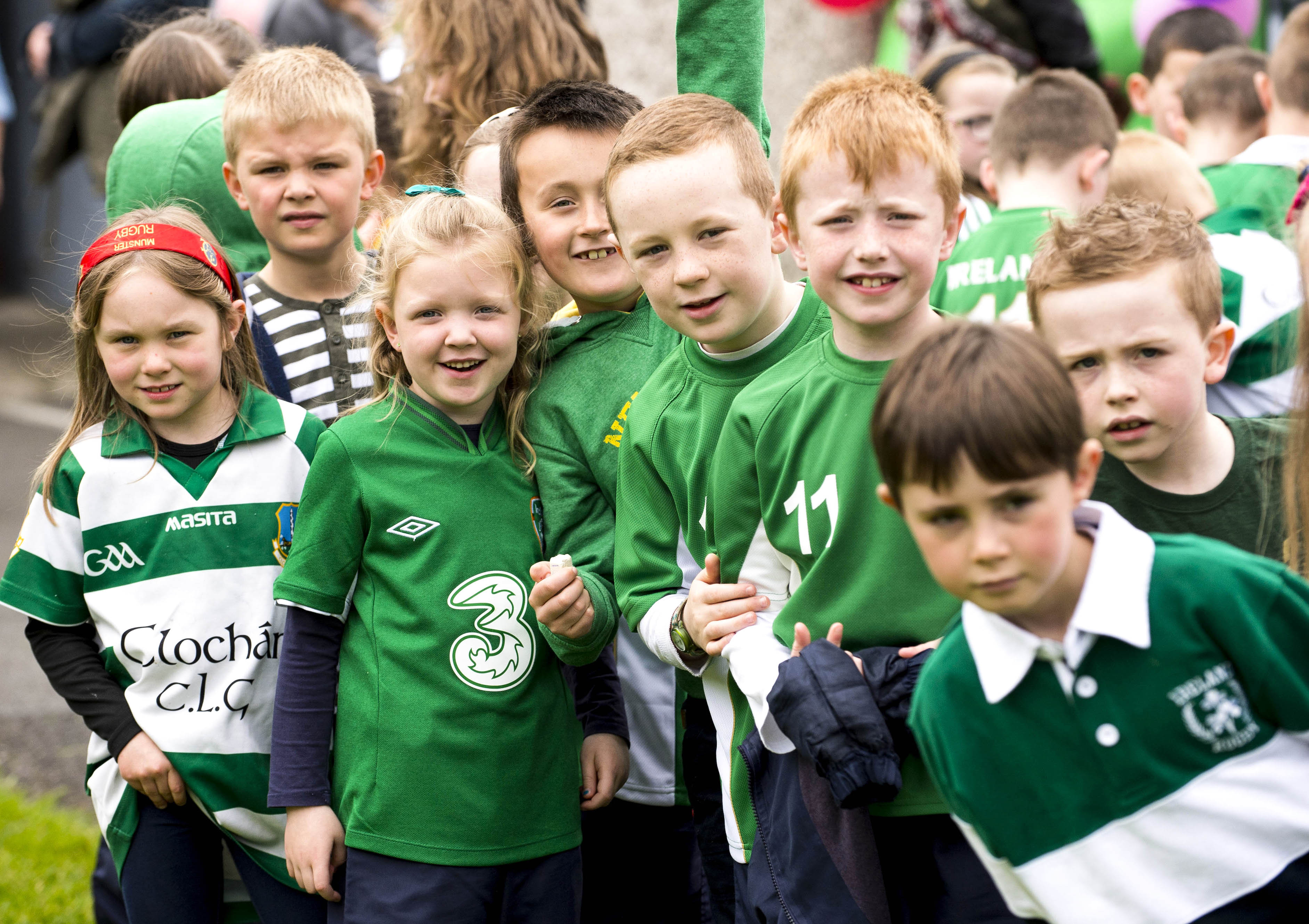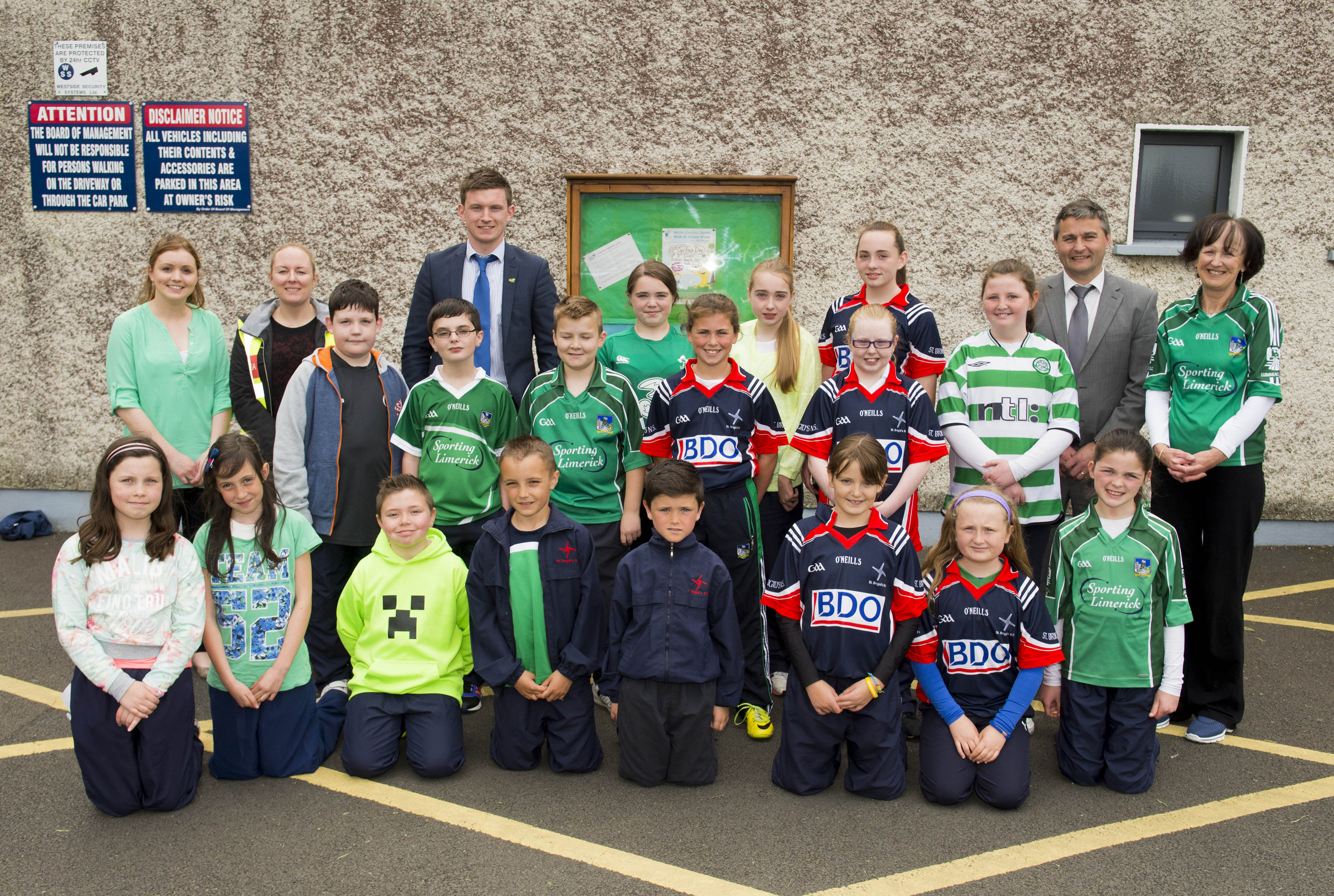 St Brigid’s NS were awarded their 5th Green Flag and Limerick manager TJ Ryan and Limerick hurler Kevin Downes were on hand to help the students raise the flag. Awaiting the arrival of TJ Ryan and Kevin Downes.are 1st class students, from left to right, Madison O’Neill, Oisin Mulhall, Lucy Kelly, Jamie Enright, Danny Sheedy, Gavin Murphy, Luke Lawlor, and Joshua Askin.