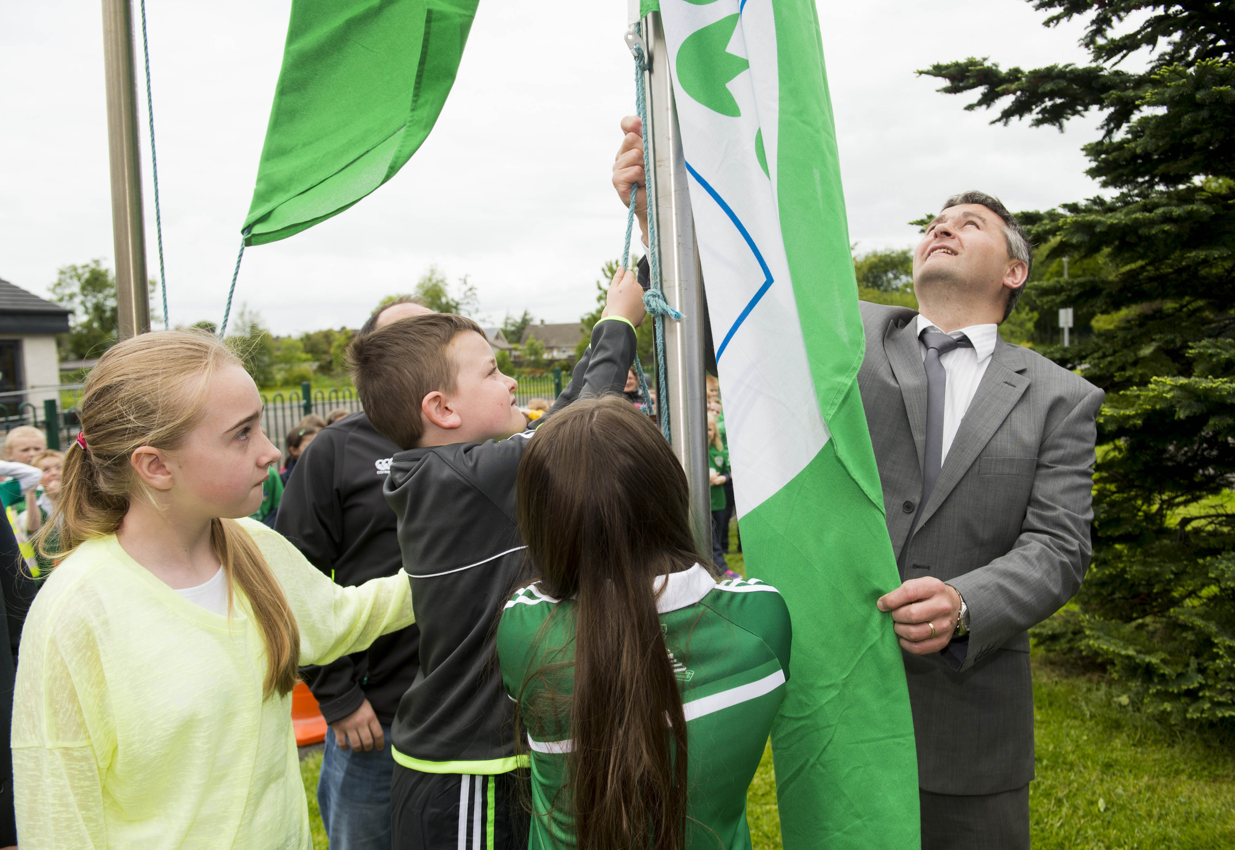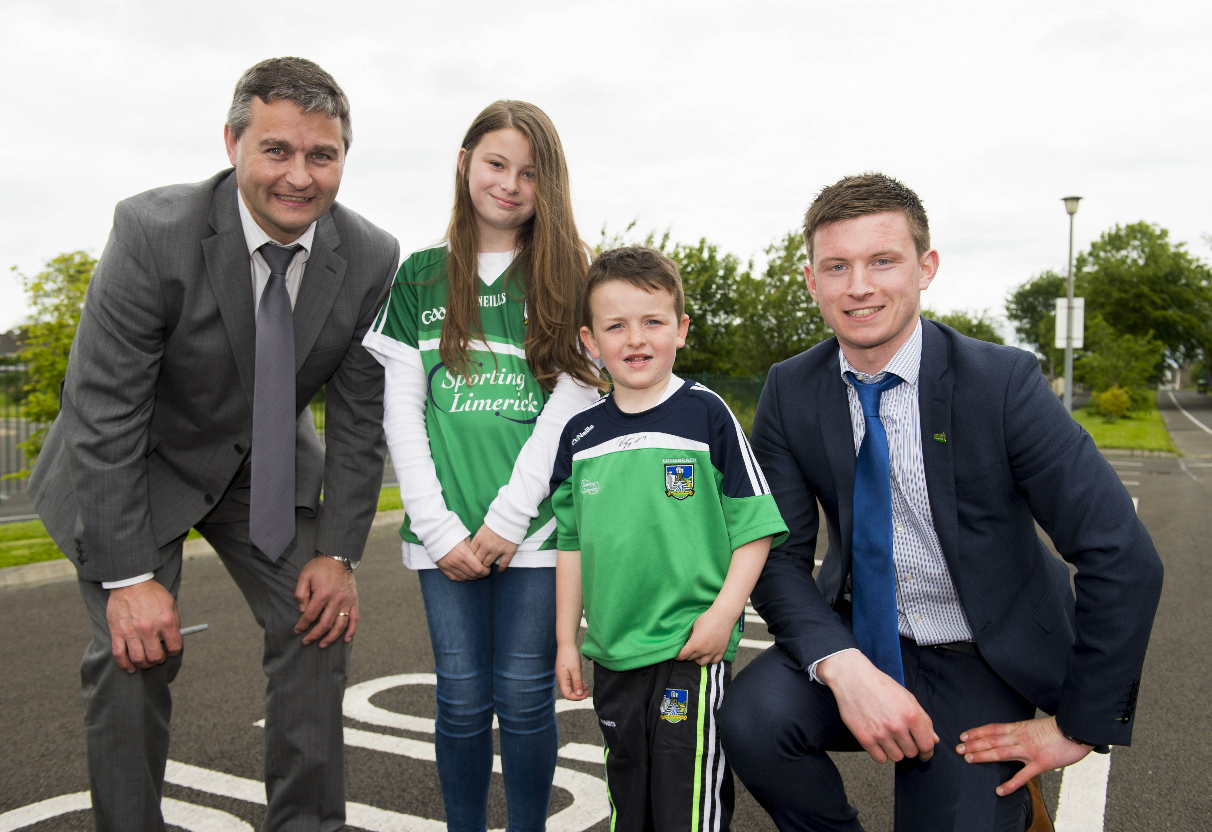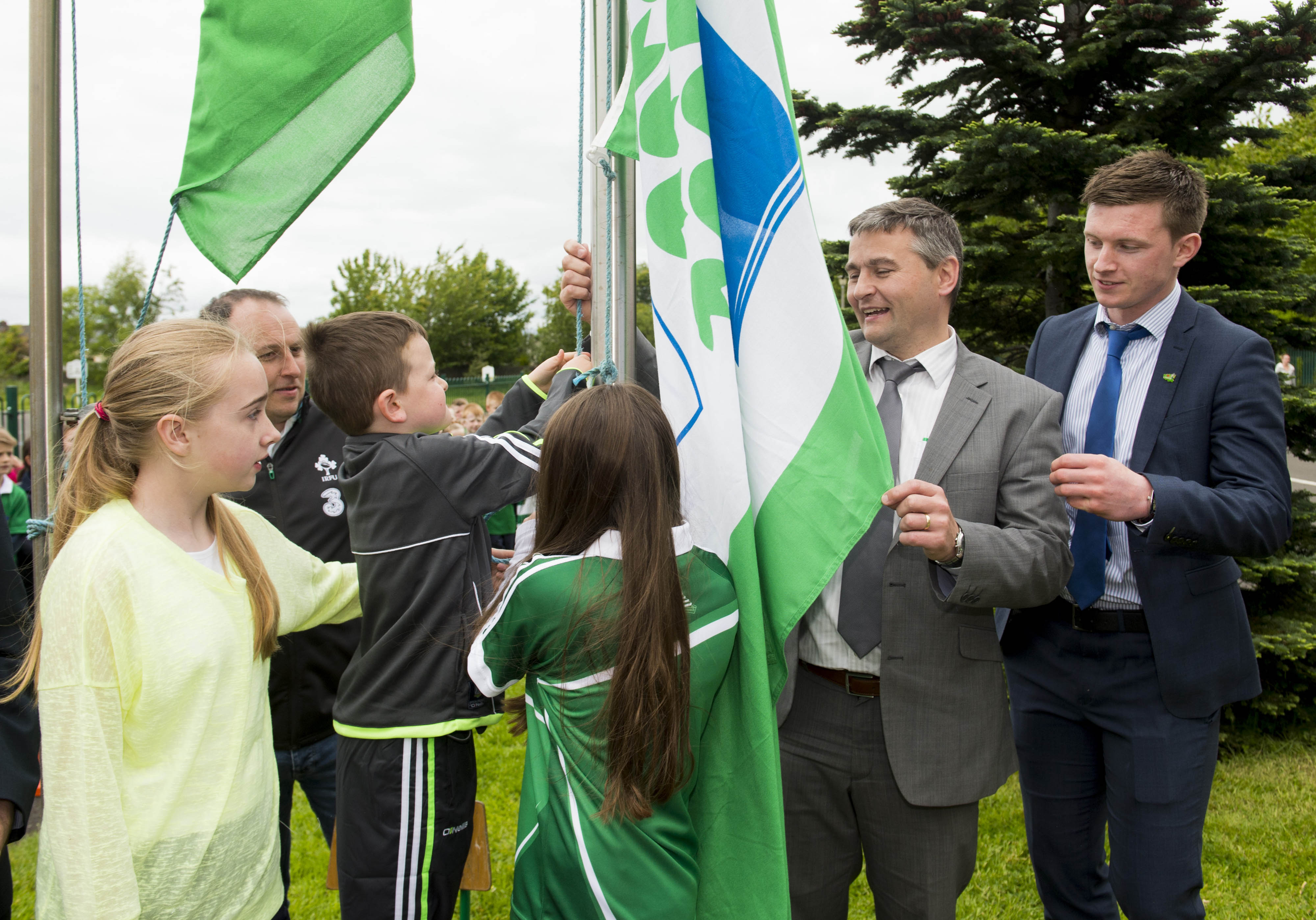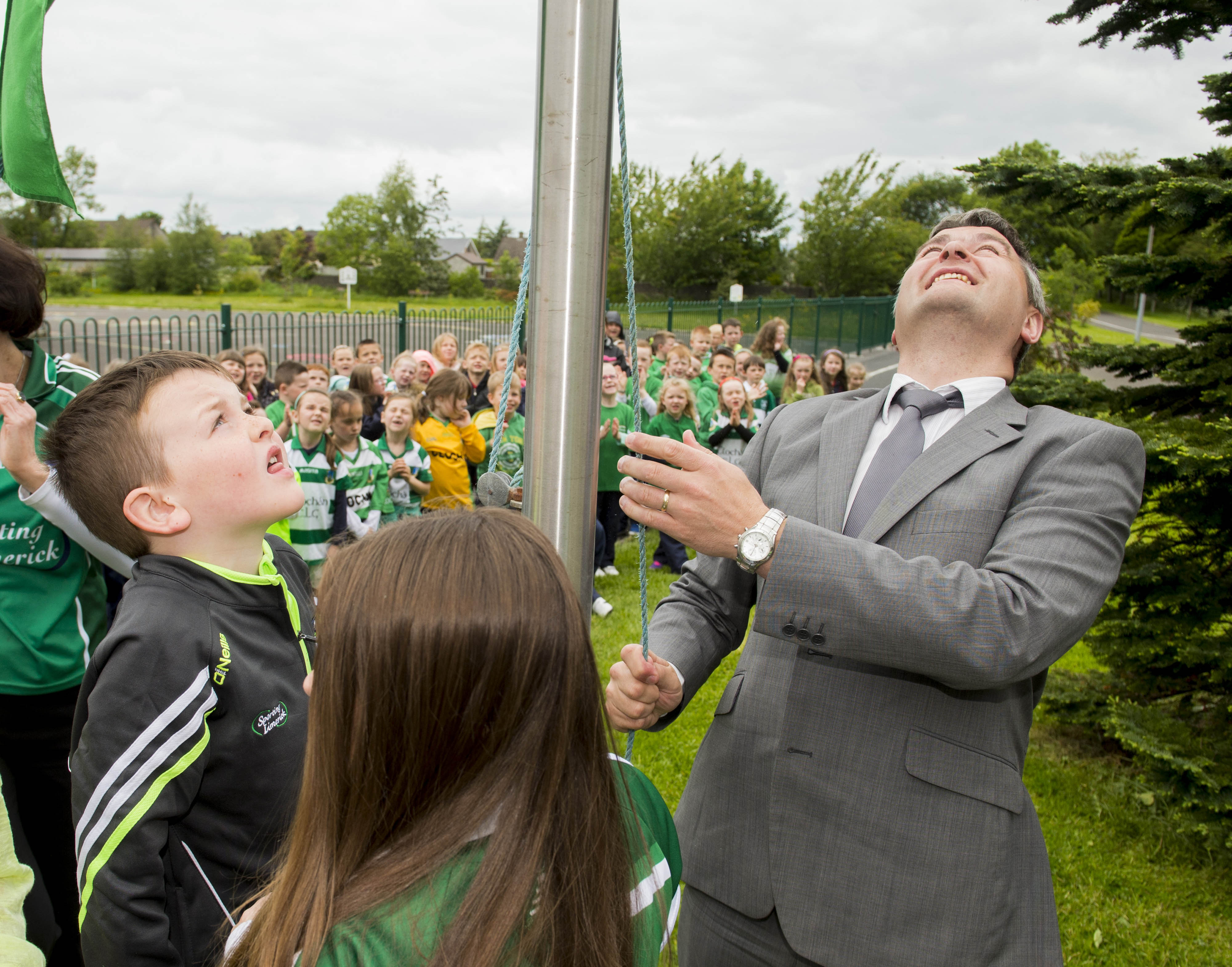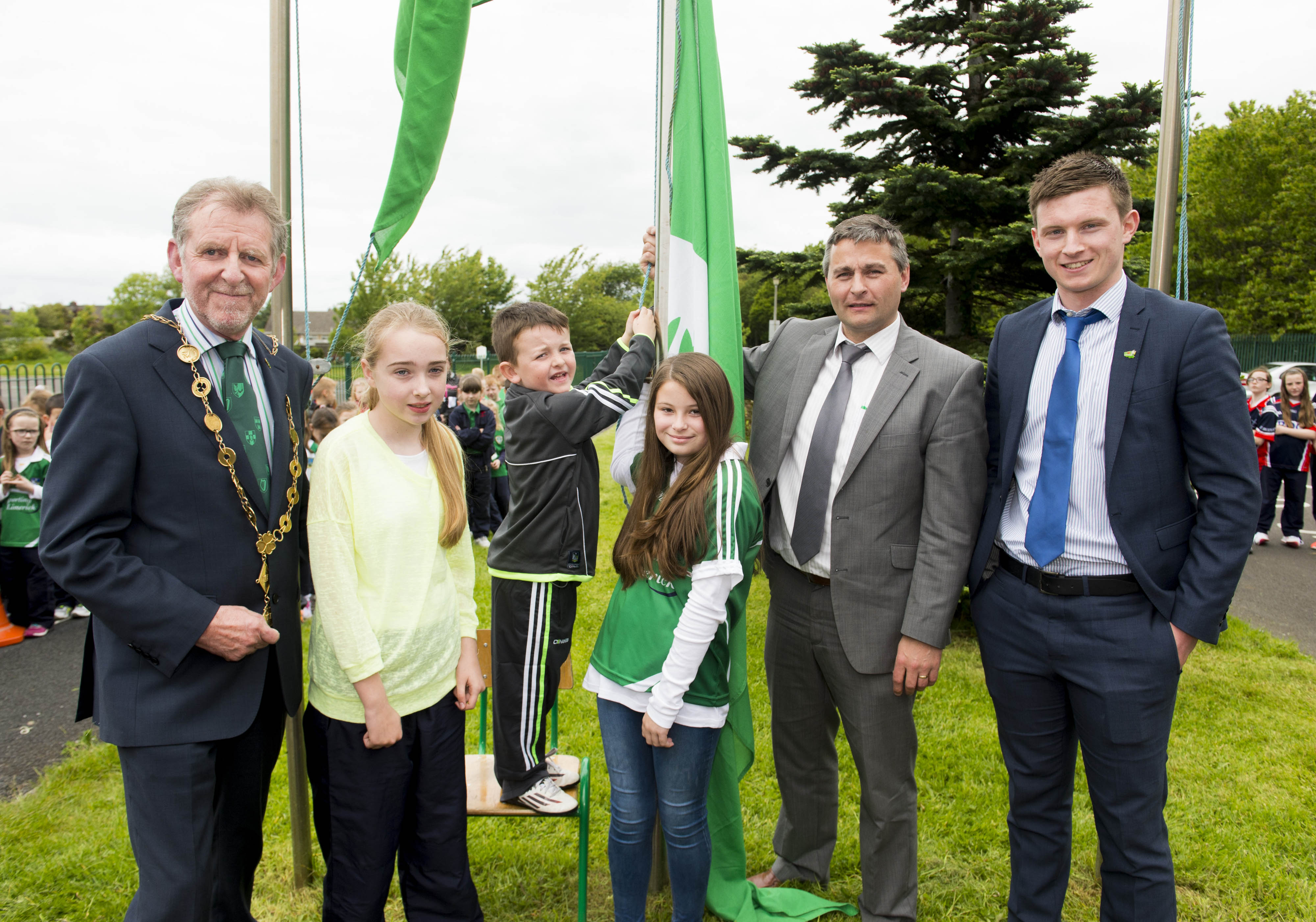 St Brigid’s NS were awarded their 5th Green Flag and Limerick manager TJ Ryan and Limerick hurler Kevin Downes were on hand to help the students raise the flag.