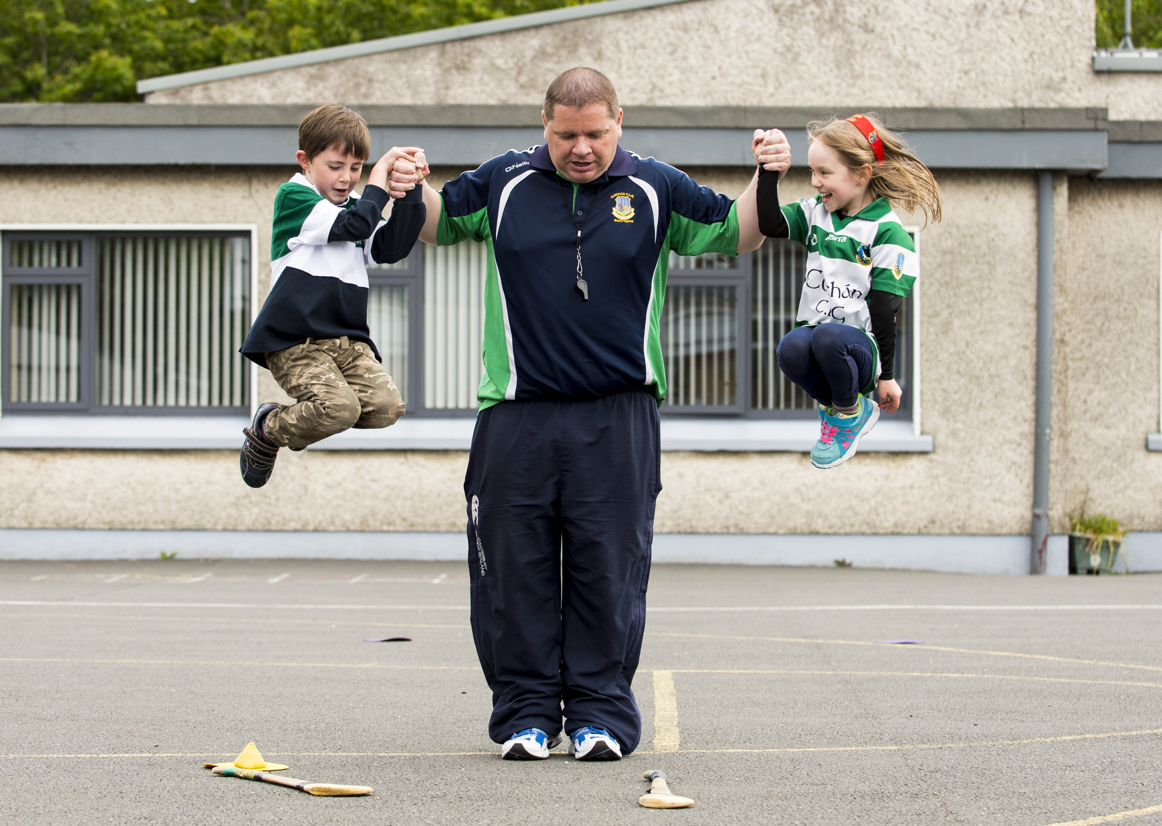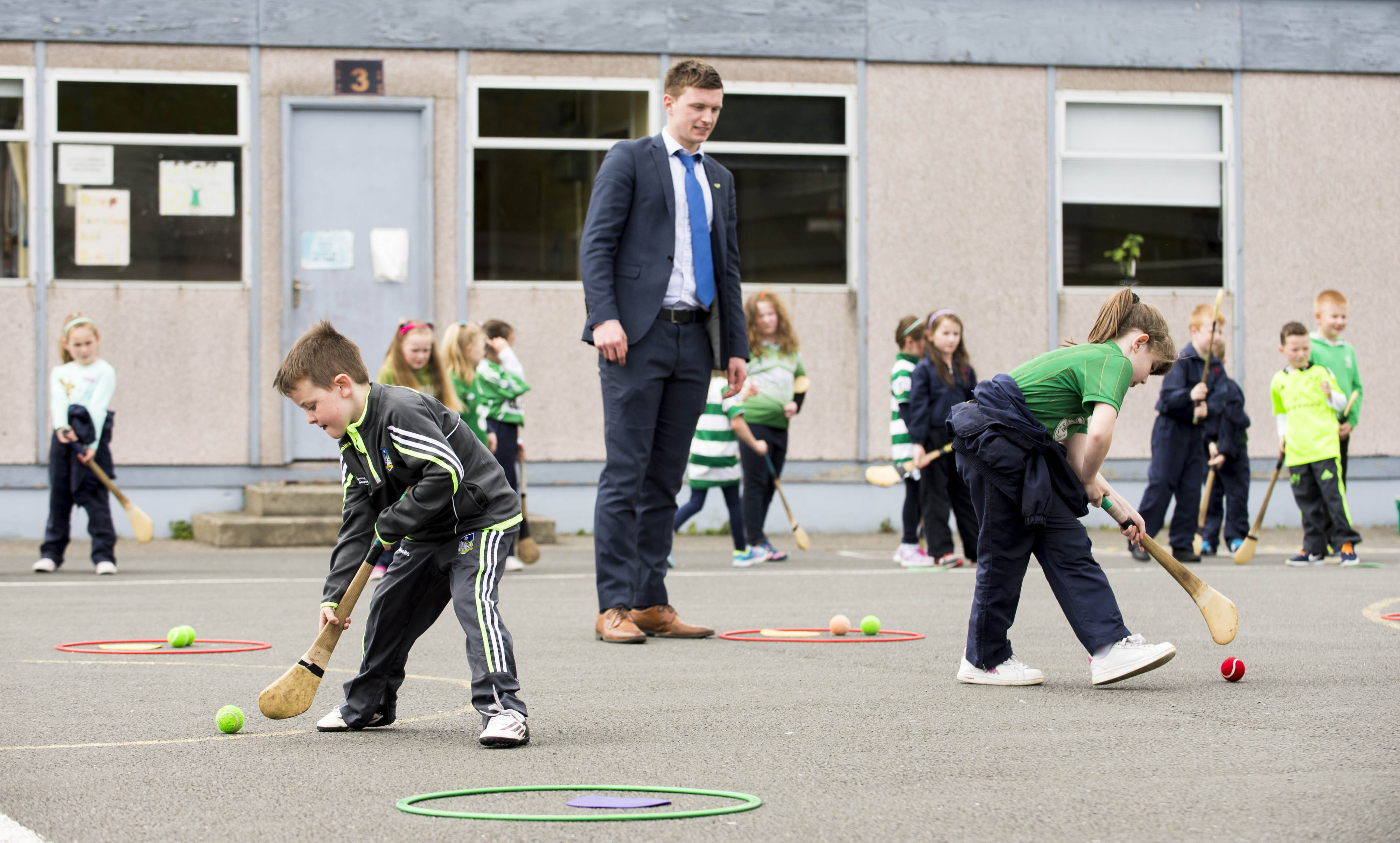 Pictured during a hurling training session are 1st class students Luke Lawlor, left, and Madison O’Neill along with hurling coach Mike Power, Claughaun GAA club.