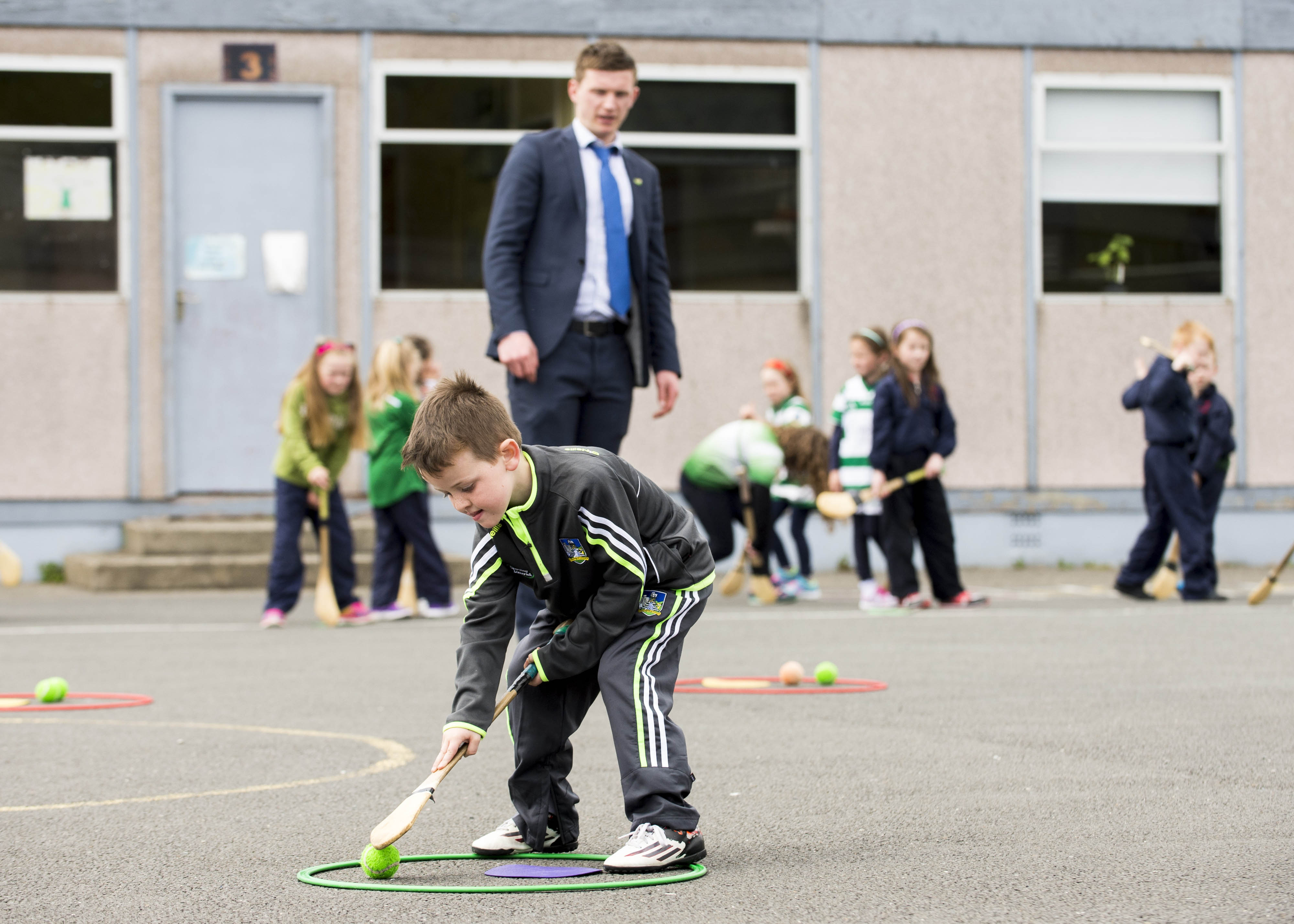 Pictured during a hurling training session is Darragh Whelan, 1st class, watched closely by Limerick hurler Kevin Downes.