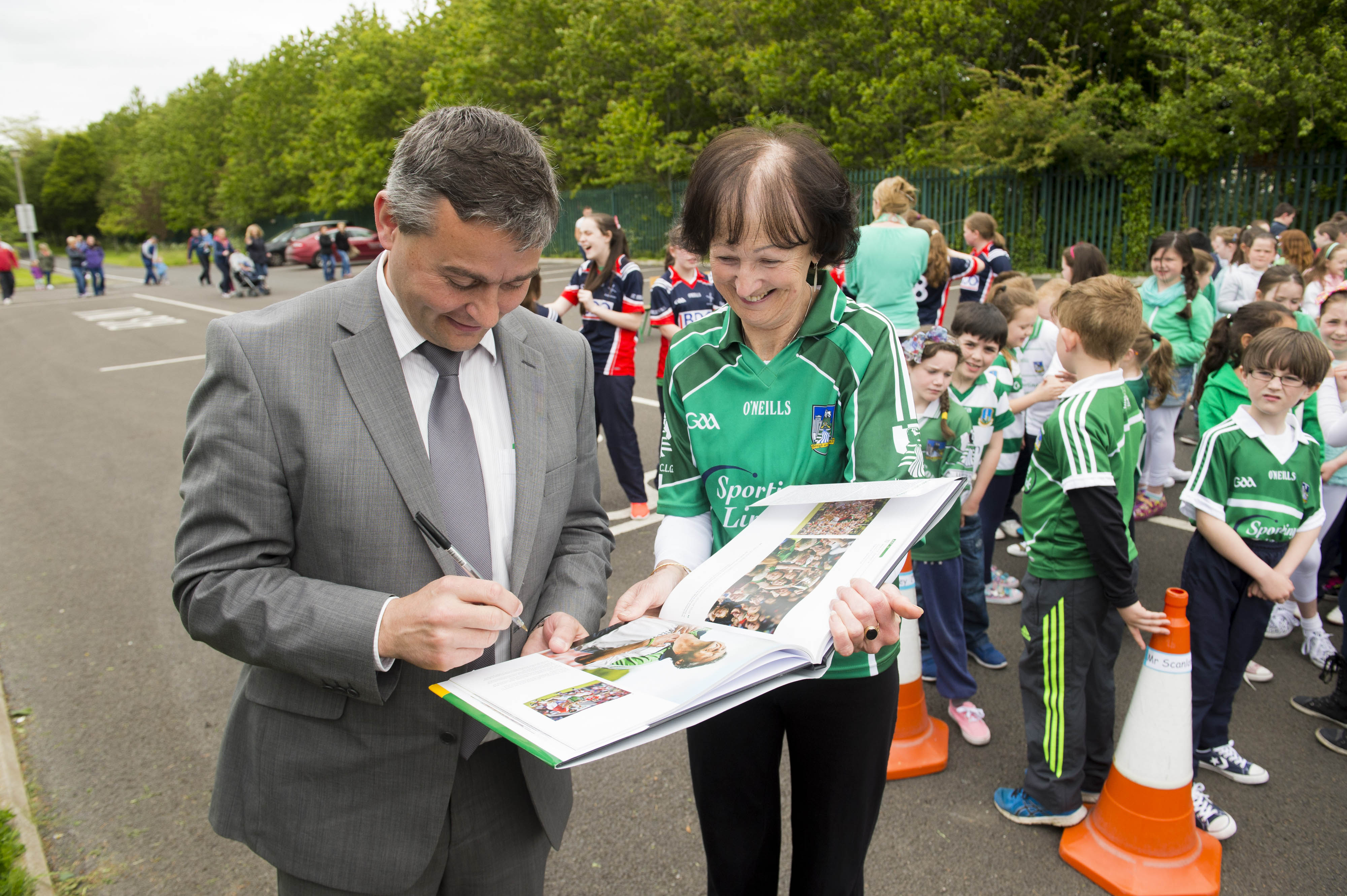 St Brigid’s NS were awarded their 5th Green Flag and Limerick manager TJ Ryan and Limerick hurler Kevin Downes were on hand to help the students raise the flag. Pictured is Limerick hurling manager TJ Ryan signing a photograph of himself from Sportsfile’s “A Season of Sundays” book alongside vice-principal Linda O’Reilly.