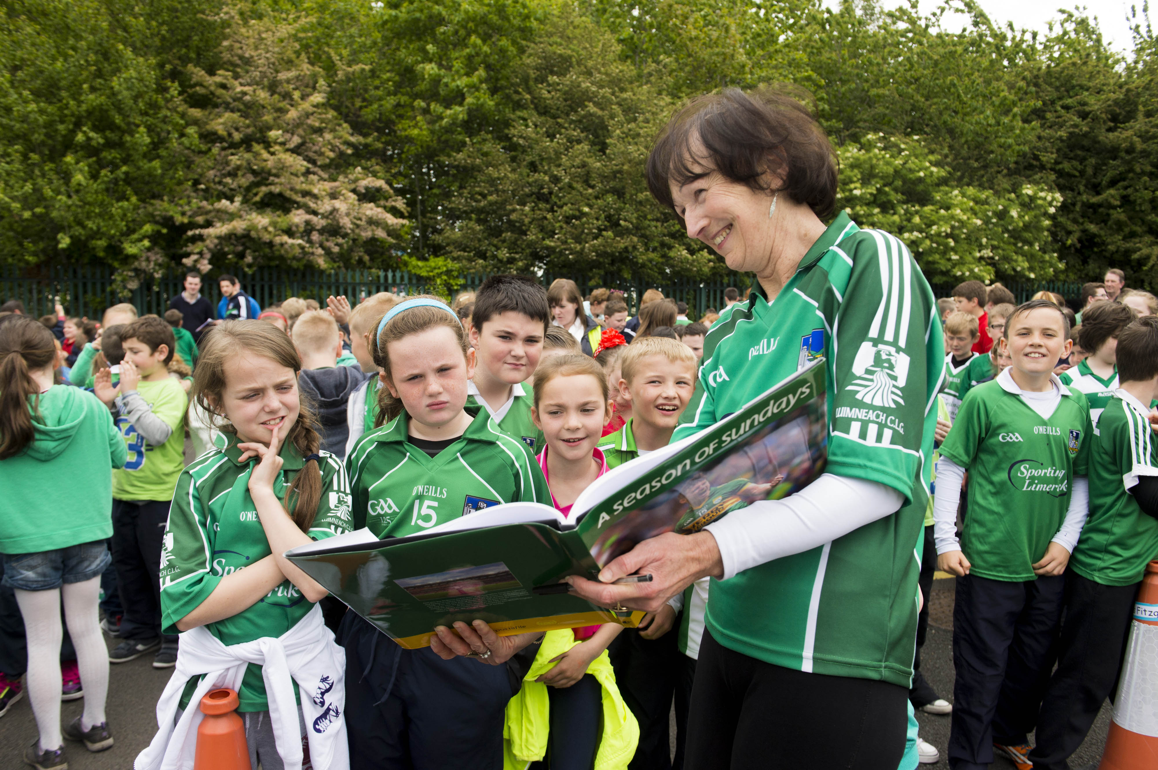 St Brigid’s NS were awarded their 5th Green Flag and Limerick manager TJ Ryan and Limerick hurler Kevin Downes were on hand to help the students raise the flag. Looking at a picture of Limerick manager TJ Ryan in Sportsfile’s “A Season of Sundays” are 3rd class students Katie Clohessy, Libby Costelloe, Jodie Griffin, and Ben Moloney, along with vice-principal Linda O’Reilly.