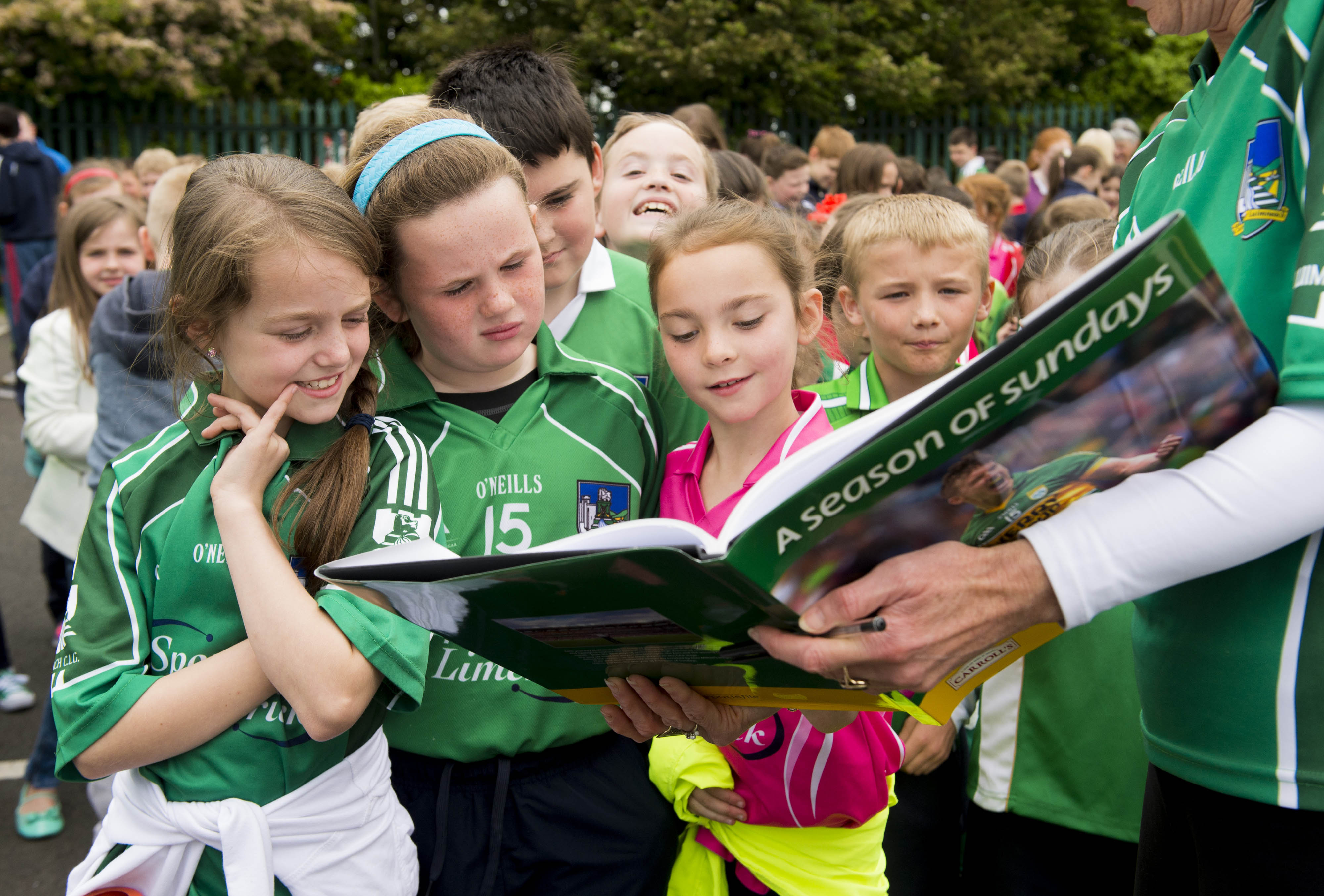 St Brigid’s NS were awarded their 5th Green Flag and Limerick manager TJ Ryan and Limerick hurler Kevin Downes were on hand to help the students raise the flag. Looking at a picture of Limerick manager TJ Ryan in Sportsfile’s “A Season of Sundays” are 3rd class students Katie Clohessy, Libby Costelloe, Jodie Griffin, and Ben Moloney.