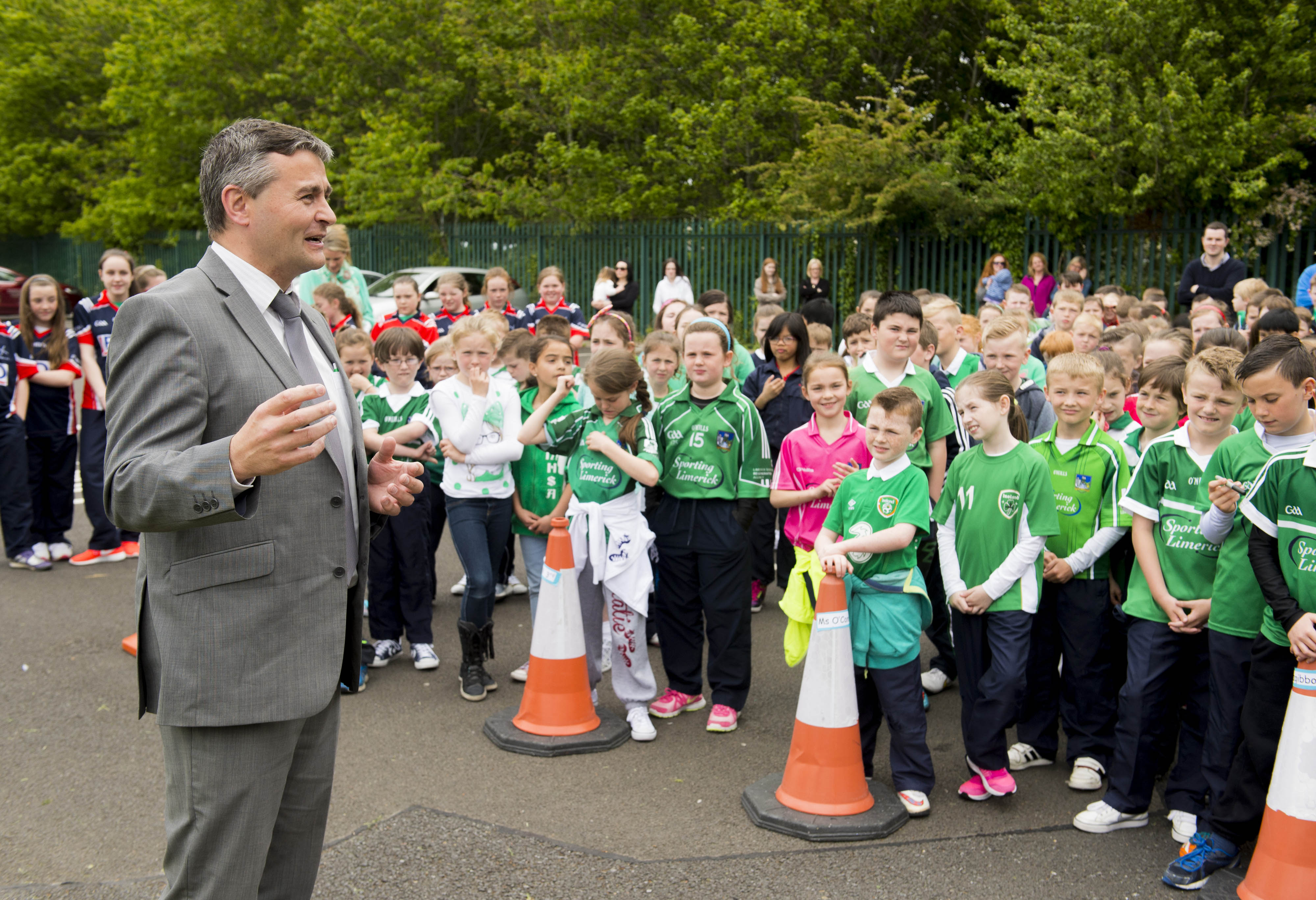 St Brigid’s NS were awarded their 5th Green Flag and Limerick manager TJ Ryan and Limerick hurler Kevin Downes were on hand to help the students raise the flag. Pictured is Limerick senior hurling manager TJ Ryan addressing the students before the raising of their fifth green flag.