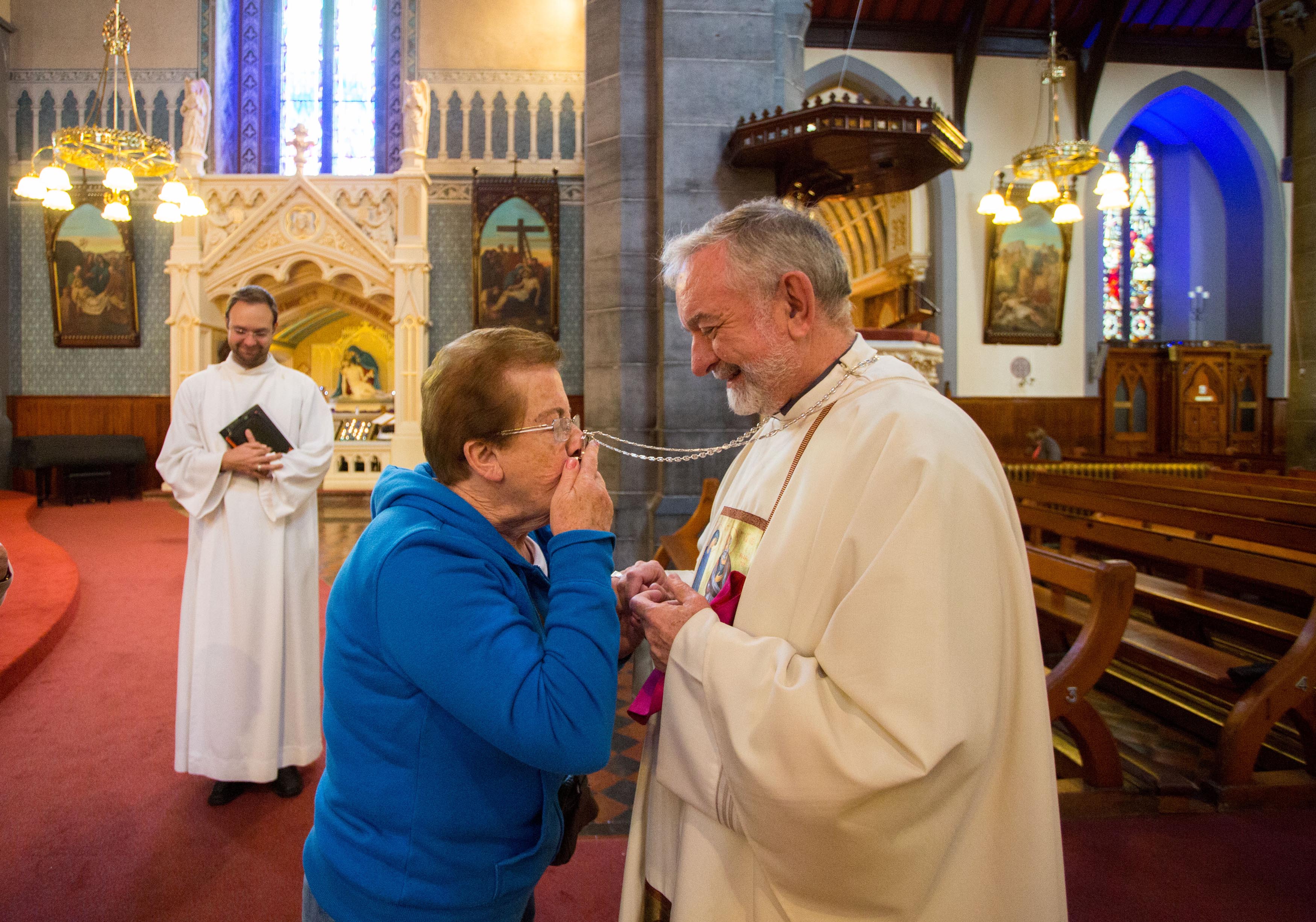 Kathleen Mulch, Lee Estate, Limerick receives a blessing from Father Keiran O’Reilly, Archbishop to Cashel and Emily after Novena mass. Picture: Alan Place/FusionShooters.