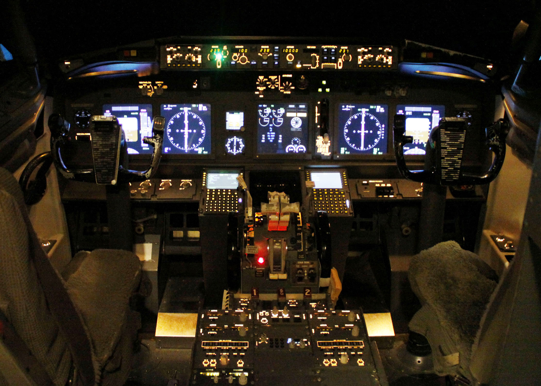 I find myself sitting in the captain’s seat of a Boeing 737 cockpit, equipped with original instrumentation. Lights, buttons, levers and knobs surround me from head to toe and each one is operating through a computer with a huge curved screen acting as our view outside.