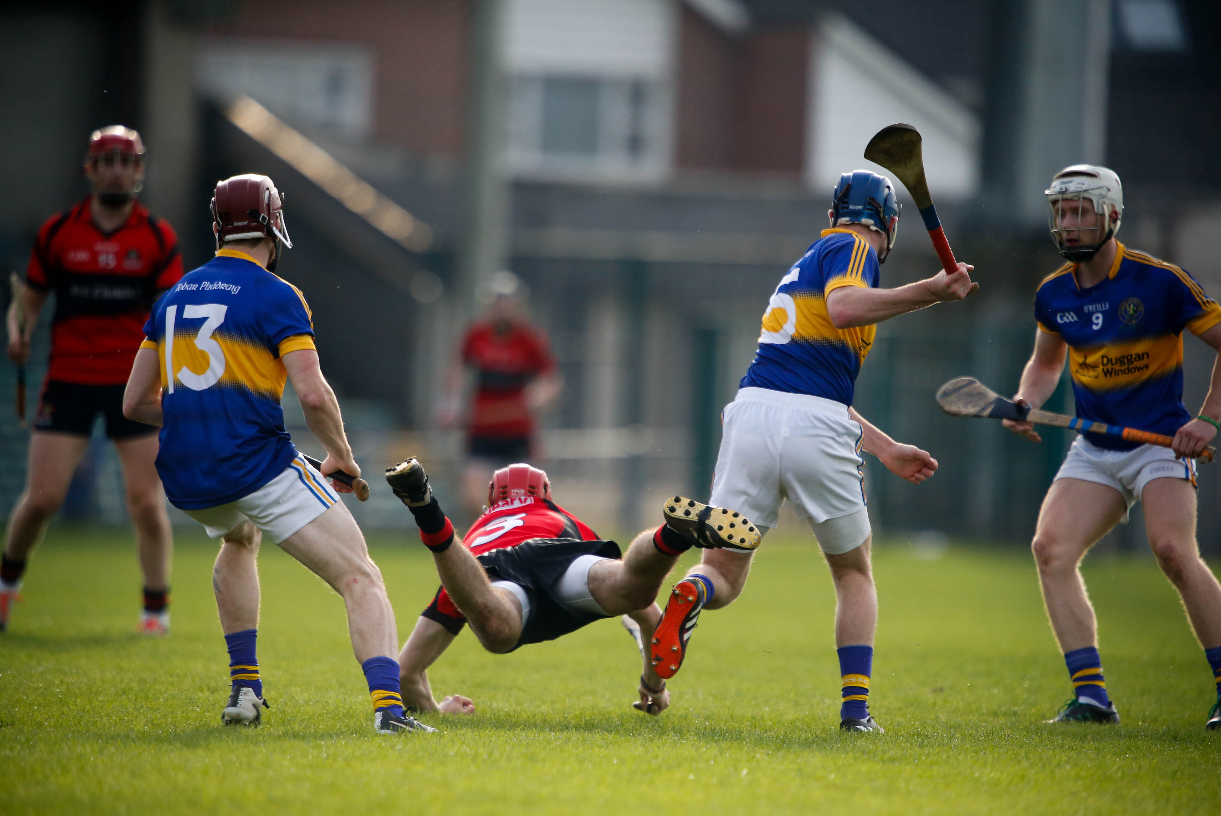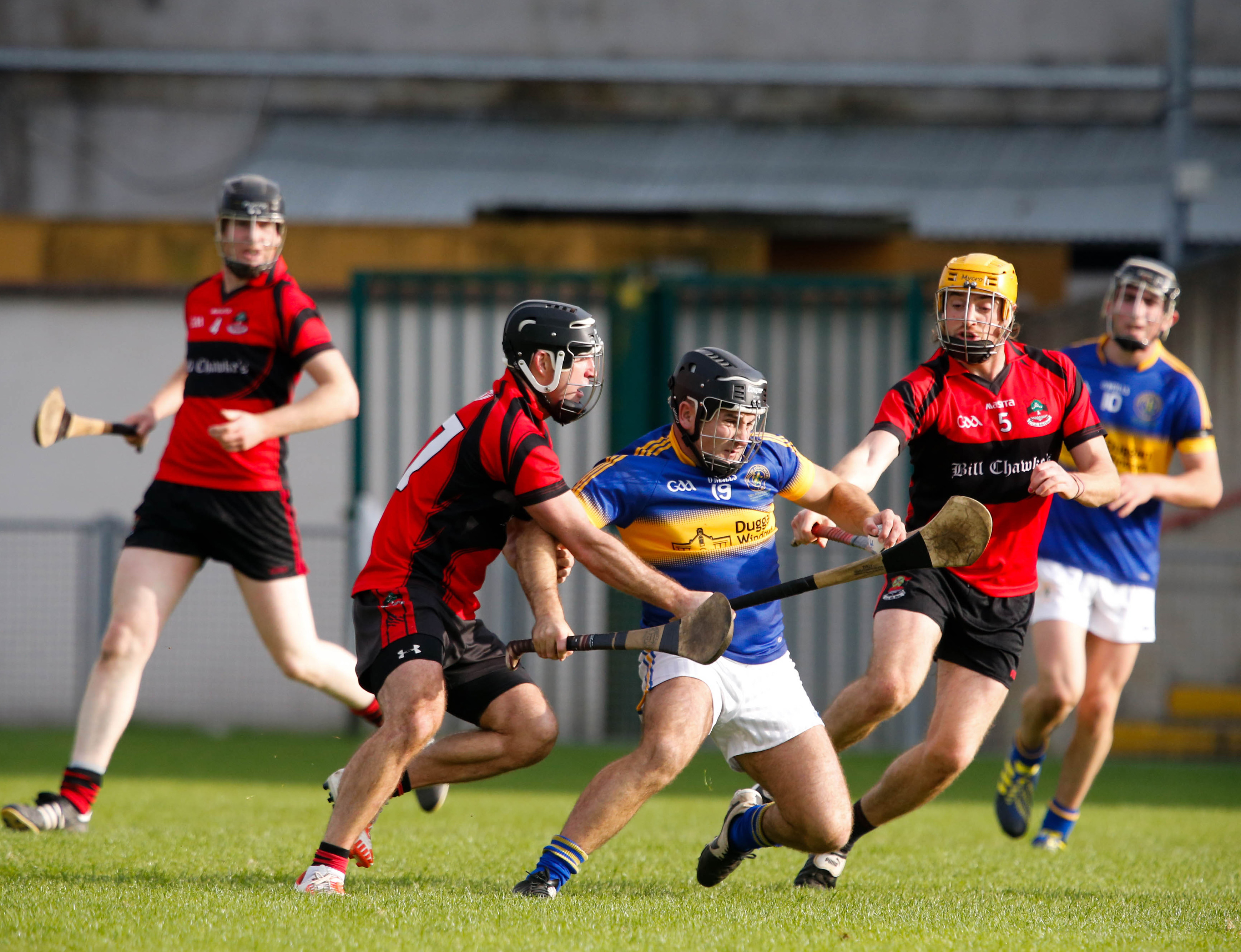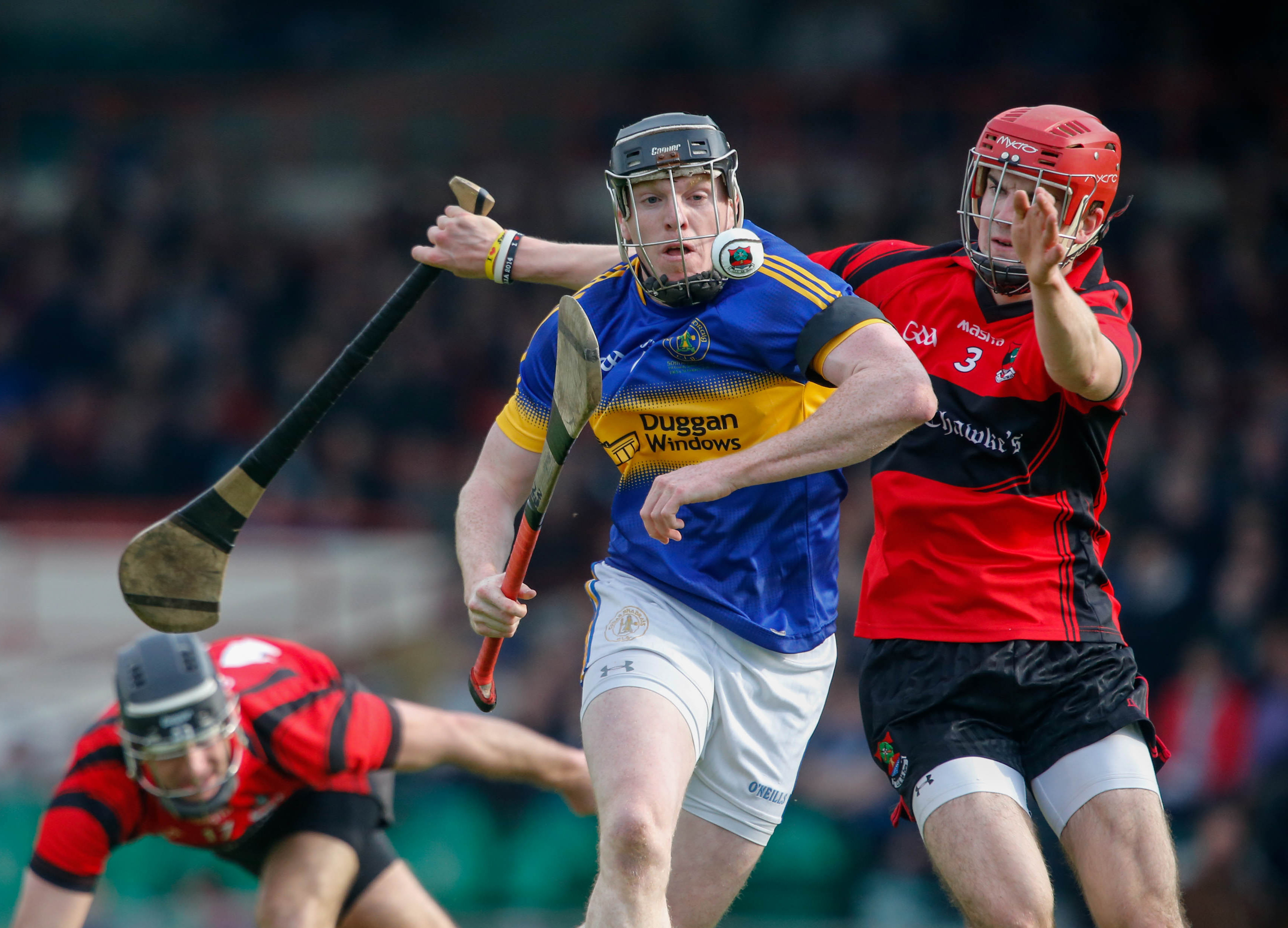 Peter Harty, Patrickswell under pressure from James Gahan and Diarmuid Sexton, Adare.
