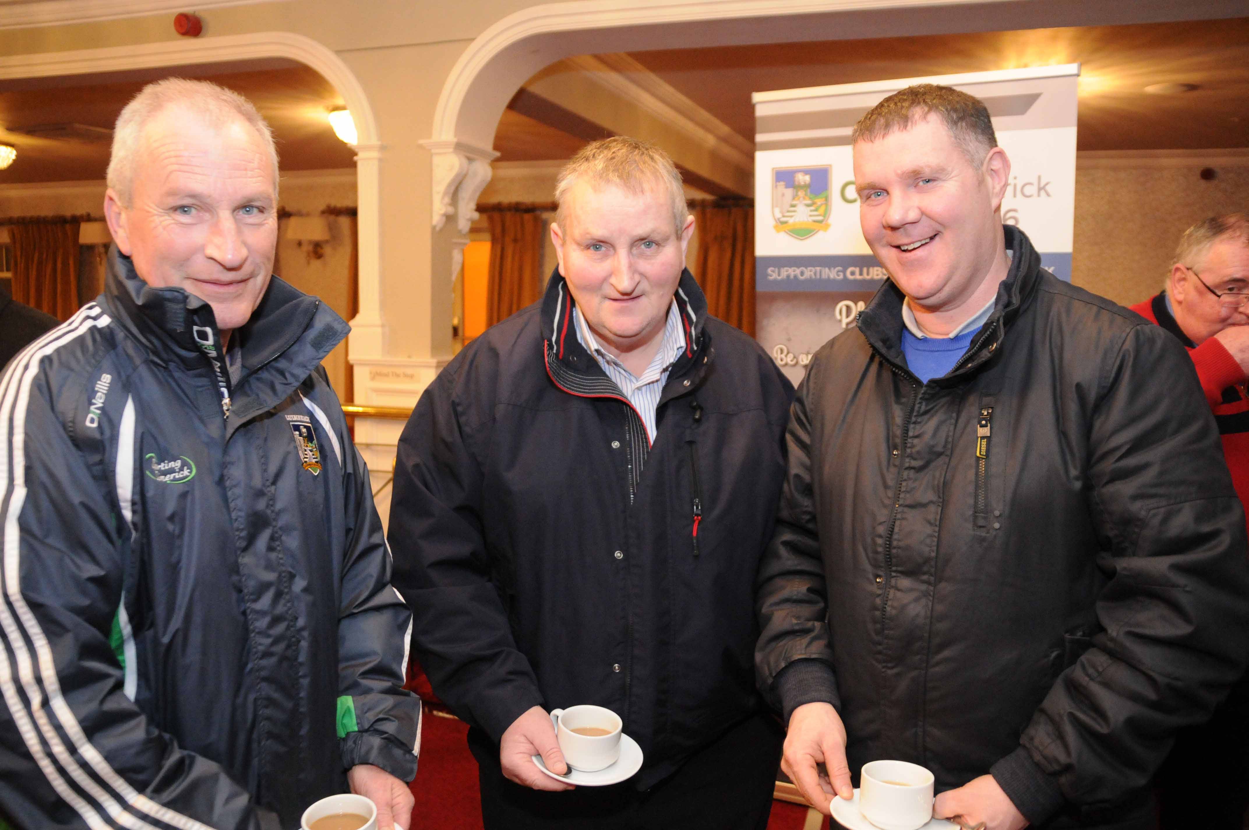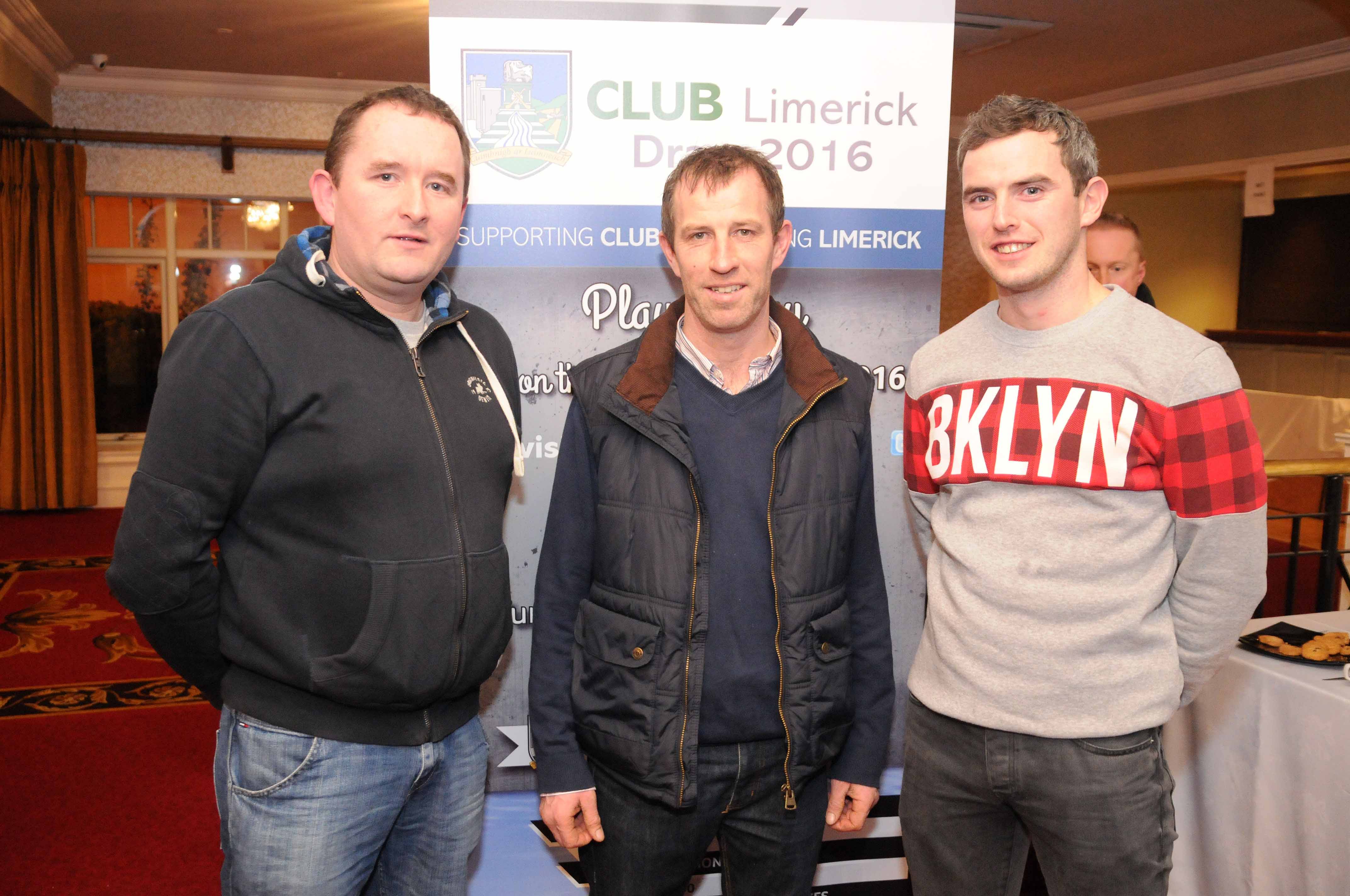 At the launch of the Limerick GAA club draw 2016 in the Woodlands hotel Adare was Dennis Carroll Board Na Nog with Jim Flynn and Stephen Connery Killmallock GAA