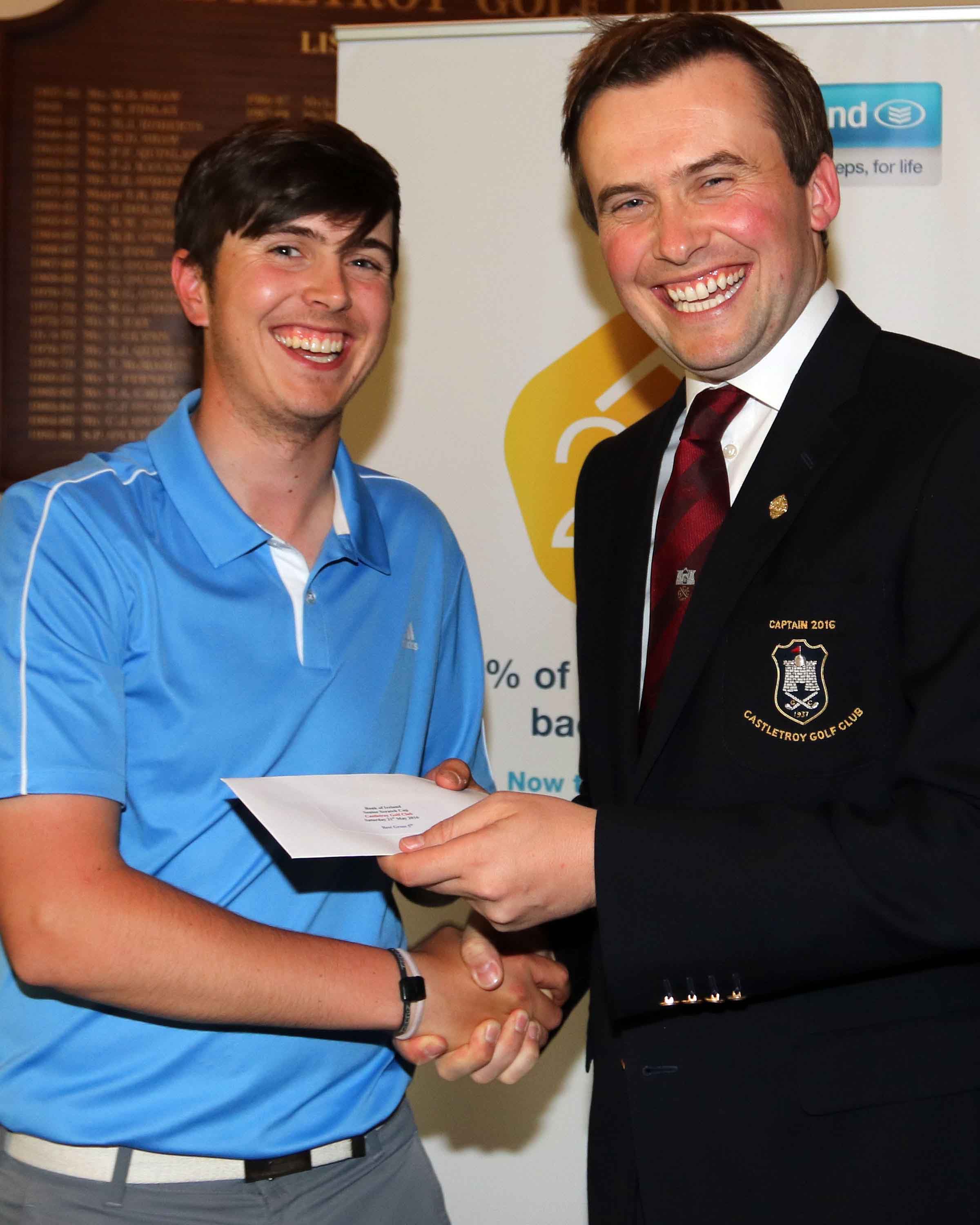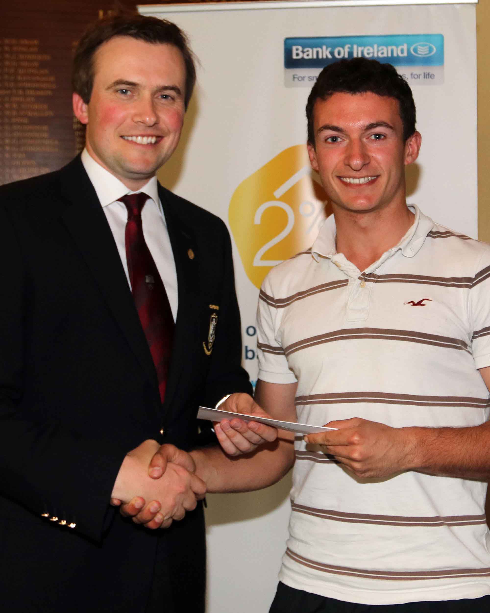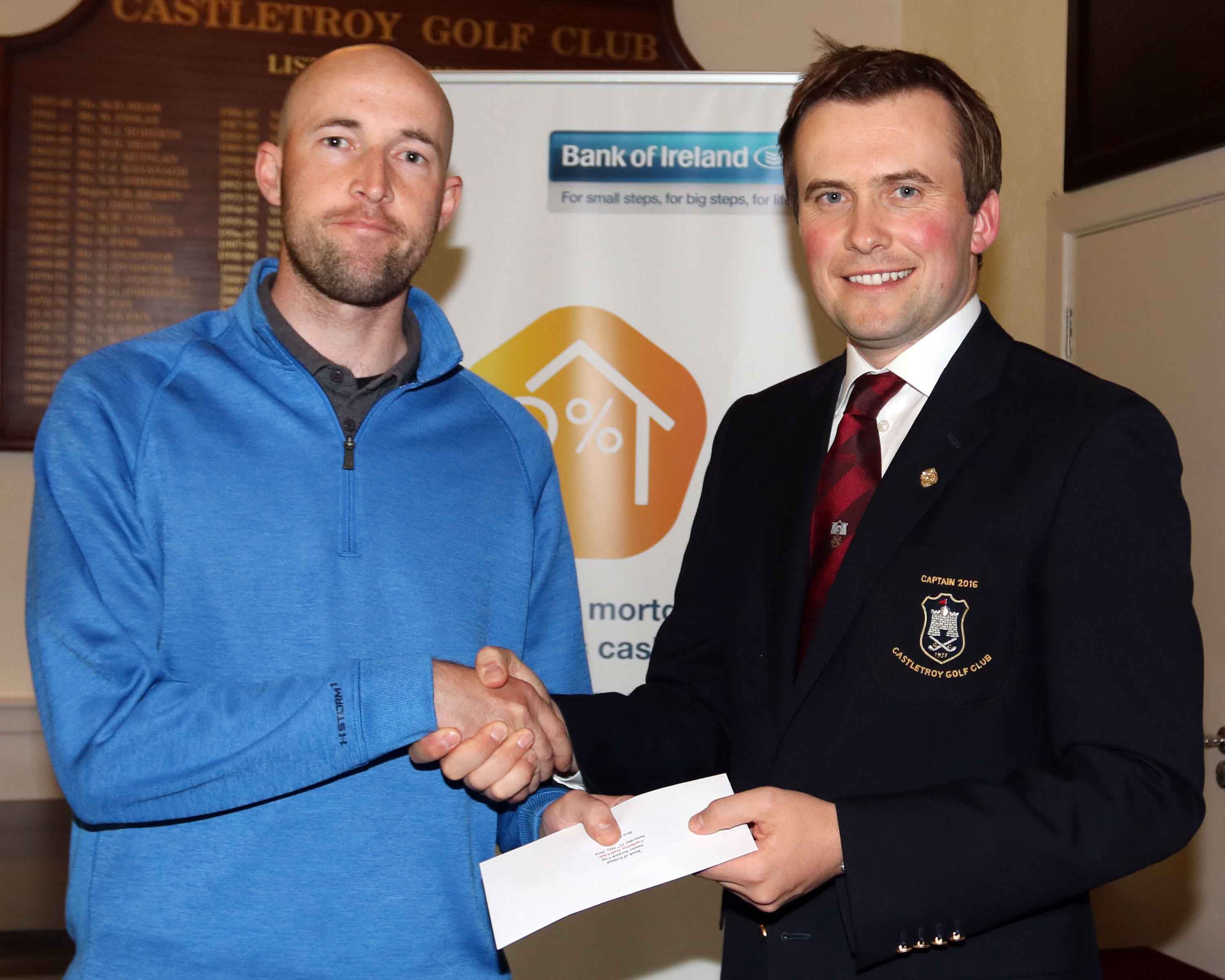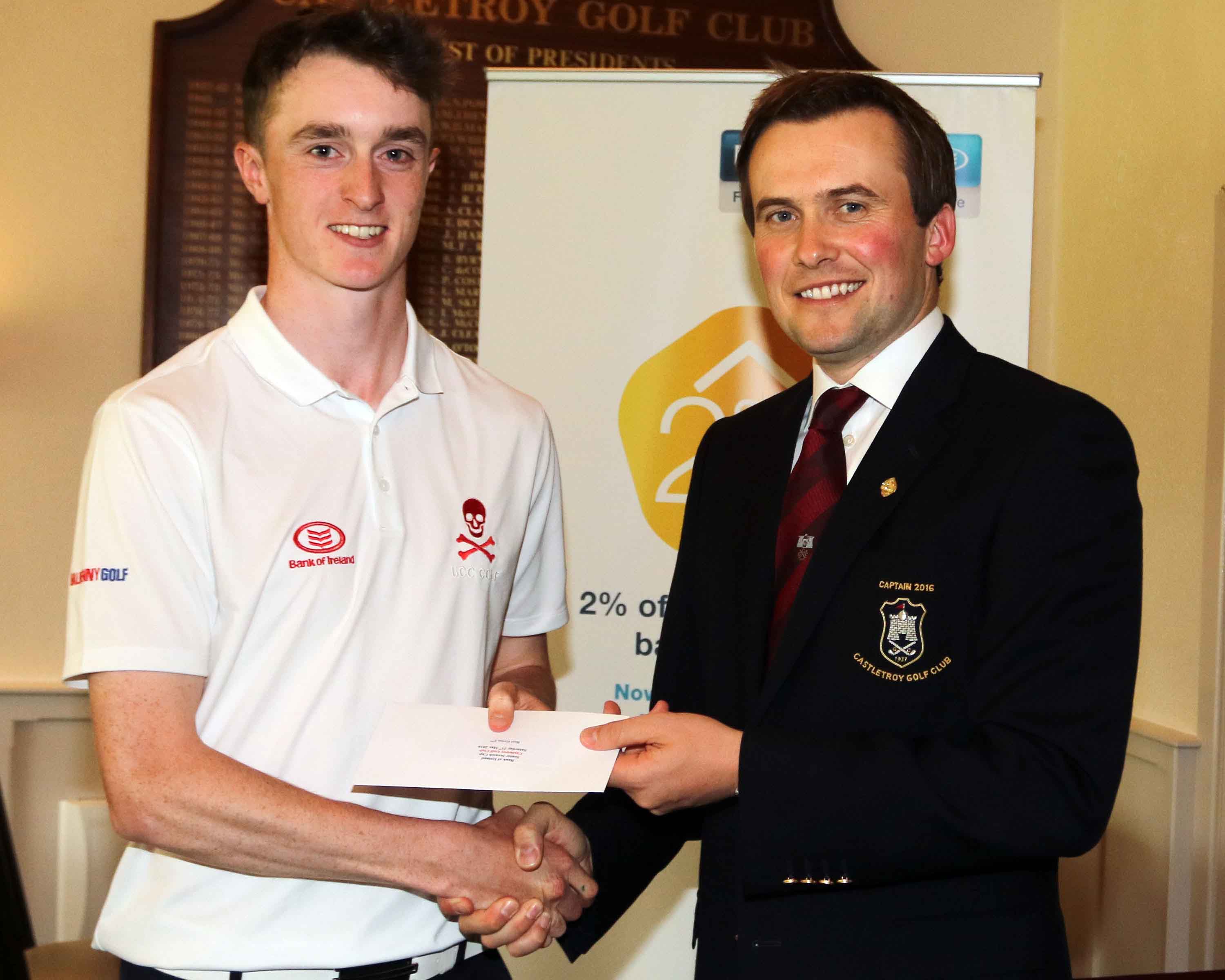 Fergal Costelloe , Captain of Castletroy Golf Club presents Jonathan McDonnell, Castletroy GC with First Overall Nett at the Bank of Ireland Senior Scratch Cup at Castletroy Golf Club .