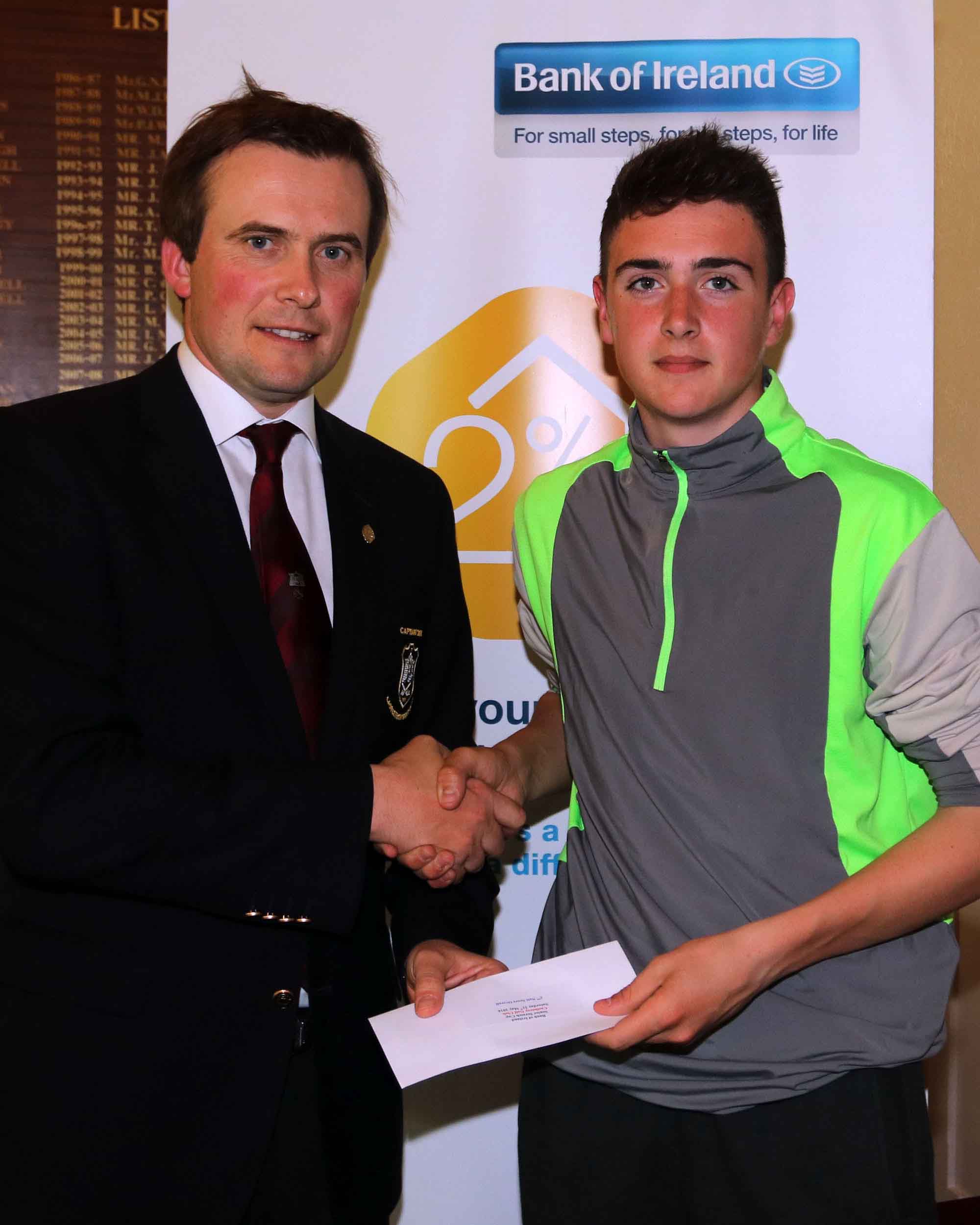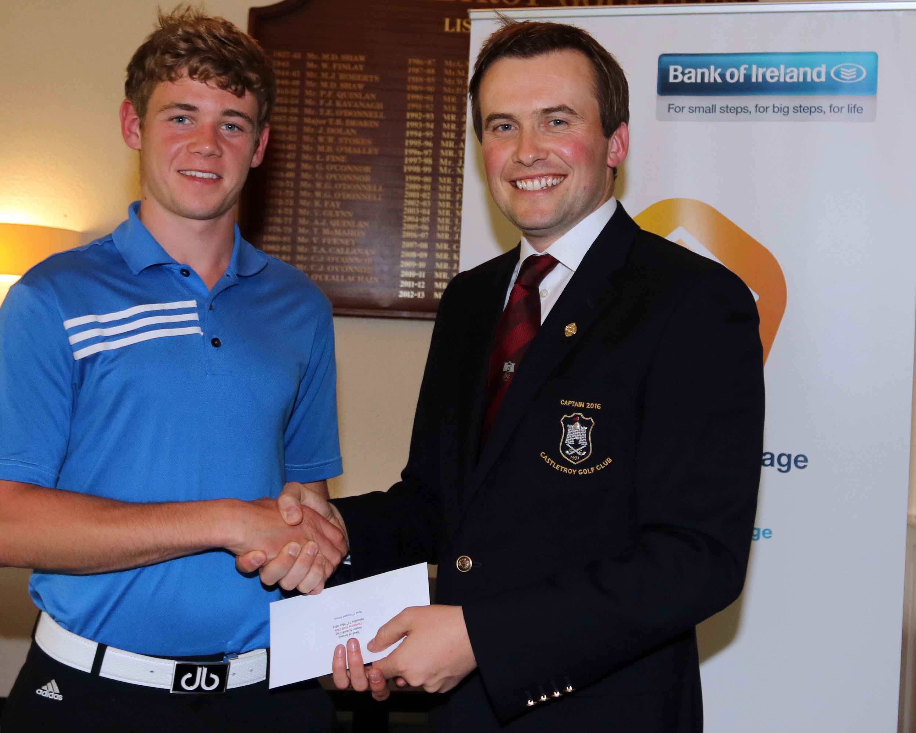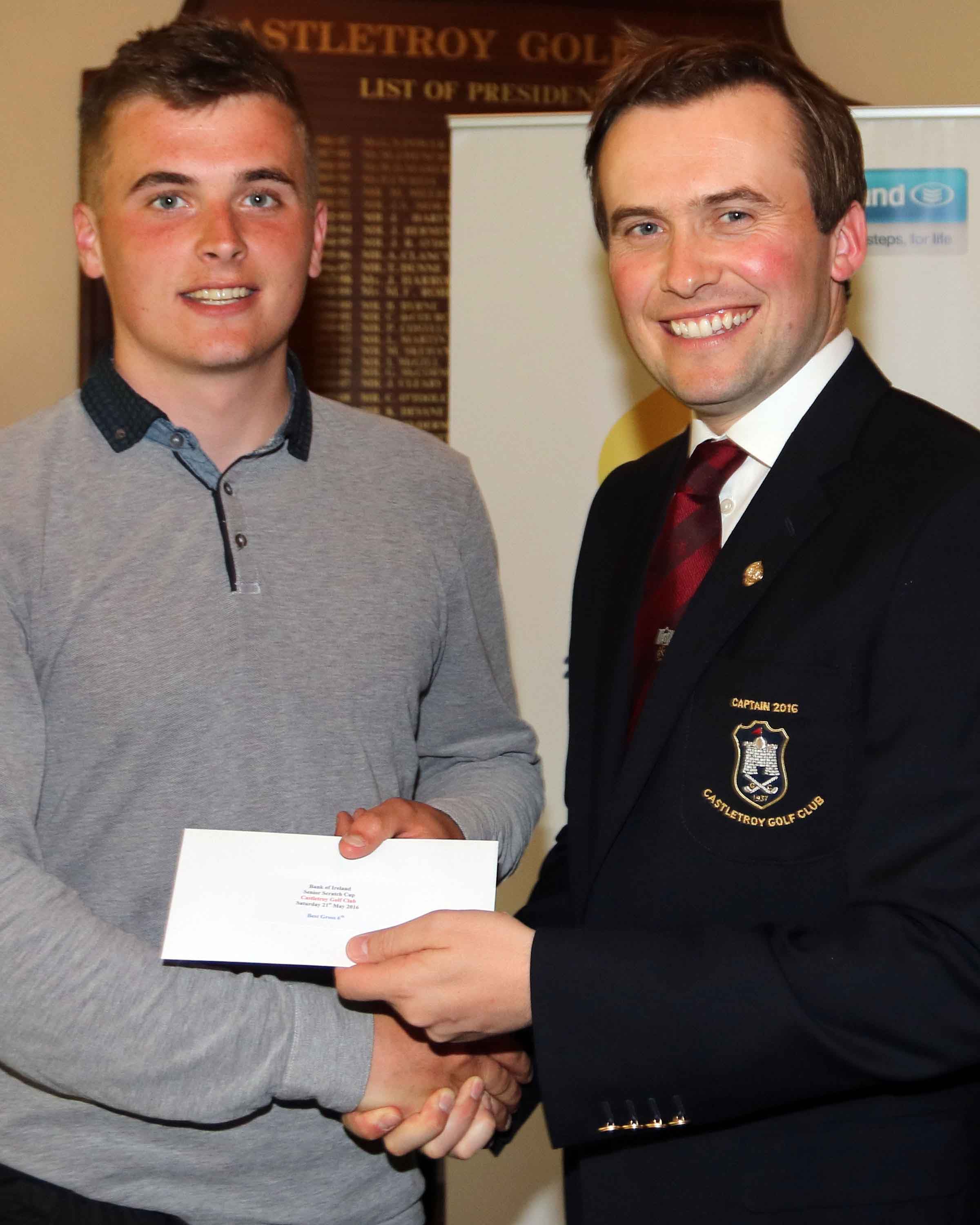 Fergal Costelloe, Captain, Castletroy Golf Club presents Cathal Noonan, Best Gross First Round at the Bank of Ireland Senior Scratch Cup at Castletroy Golf Club .