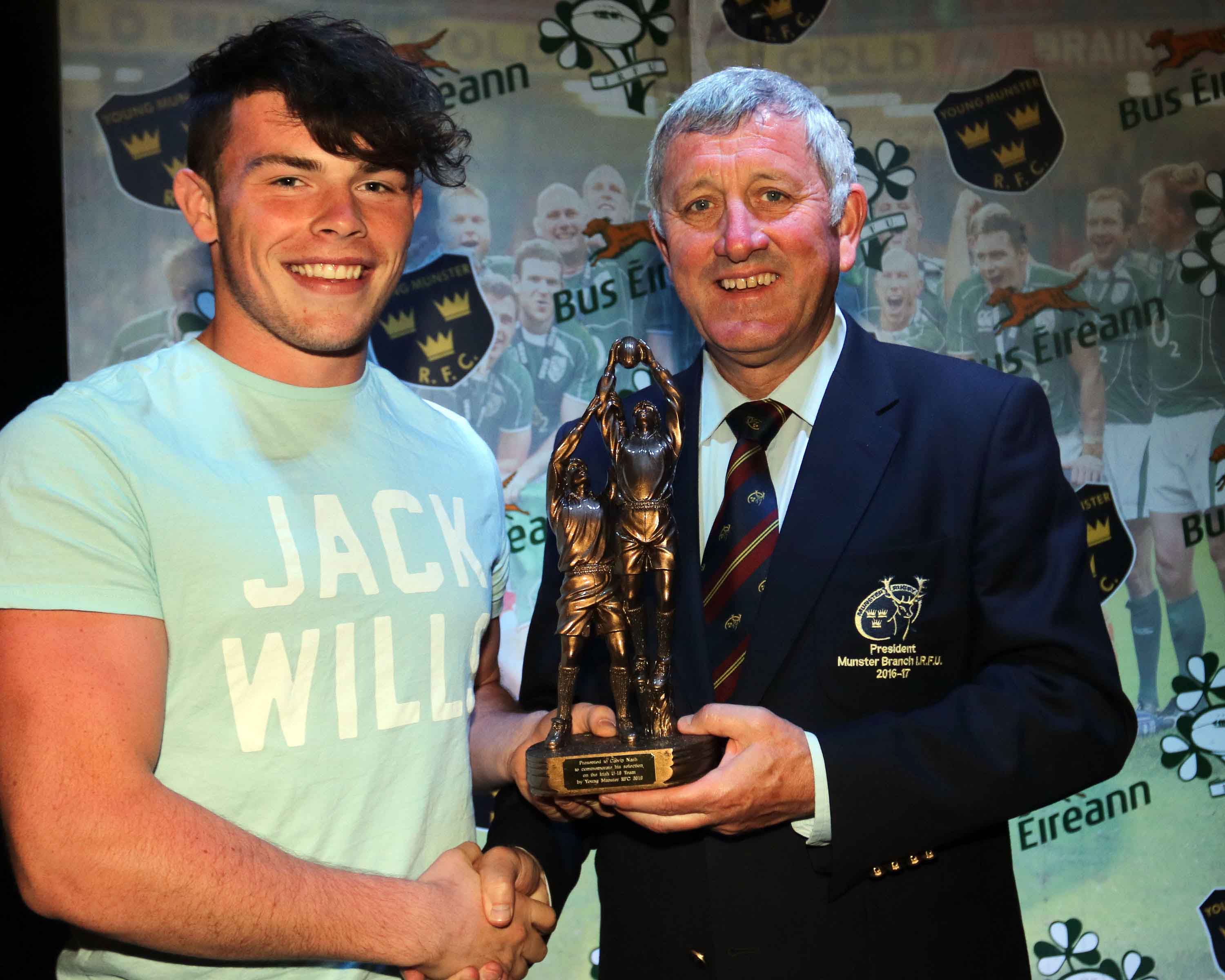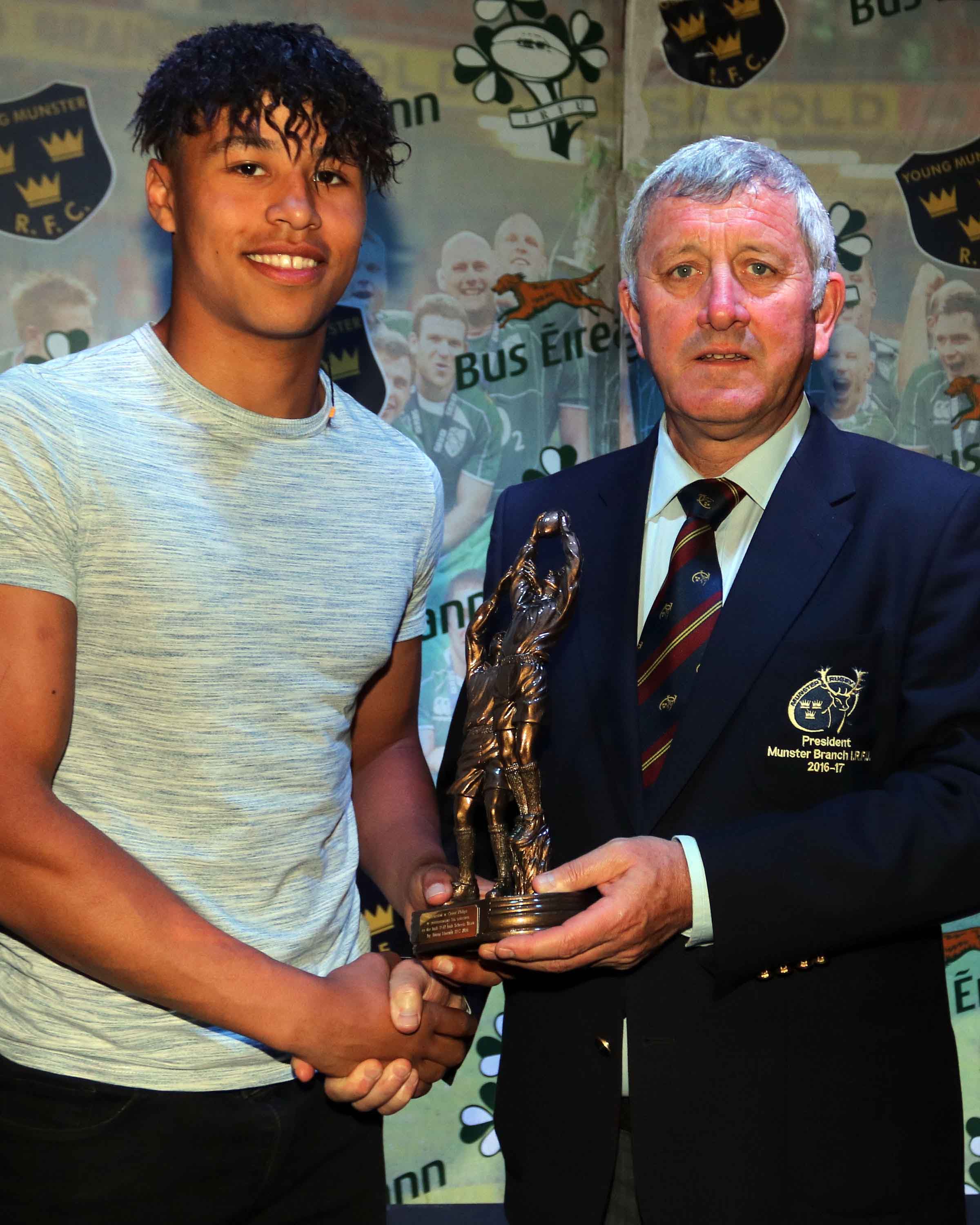 Gerry O’Shea, President of the Munster Branch IRFU presents Jack Lyons, with his Trophy for representing Ireland at Under 19 Level at the Young Munsters RFC end of Year Presentations at the Library Bar.