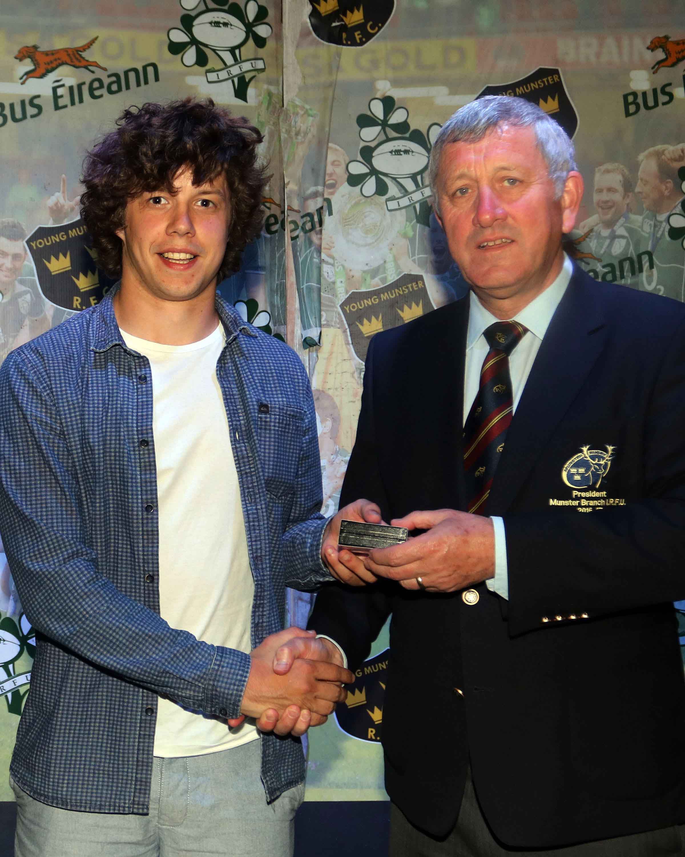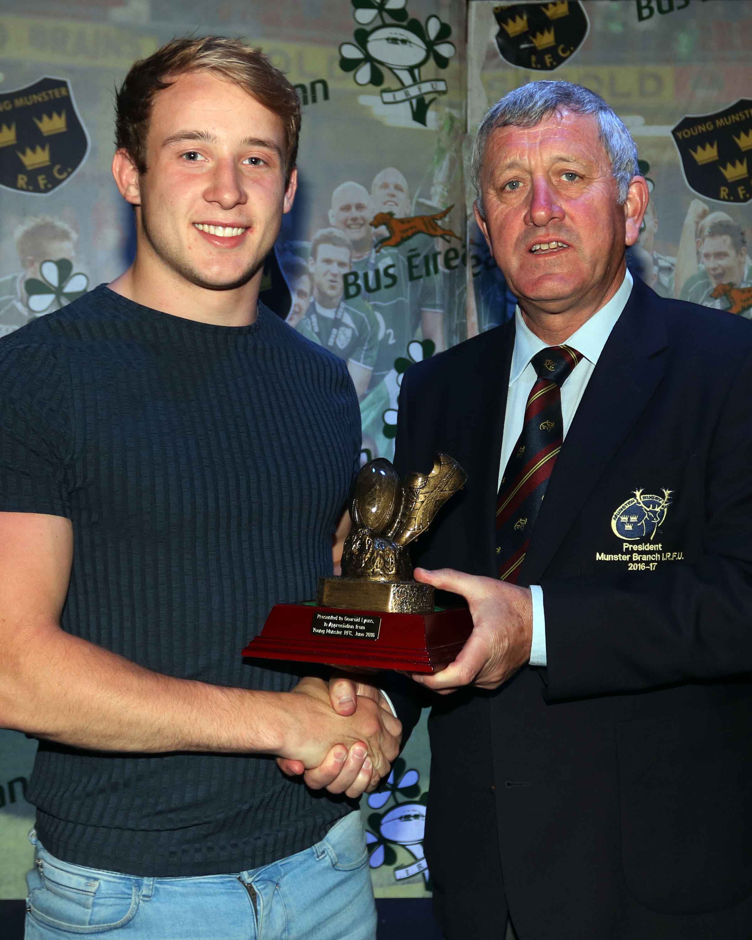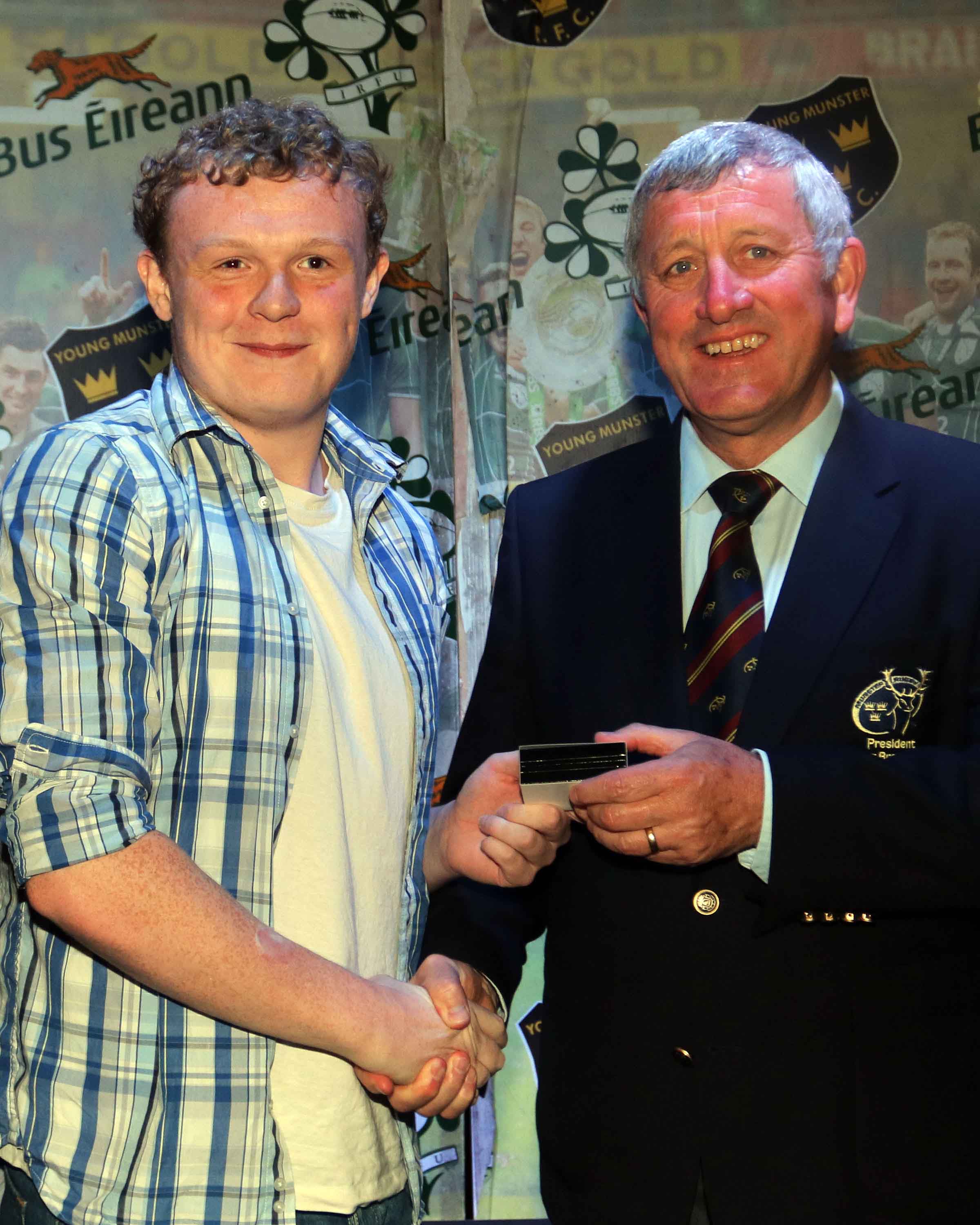Gerry O’Shea, President of the Munster Branch IRFU presents Geroid Lyons with his Trophy at the Young Munsters RFC end of Year Presentations at the Library Bar.