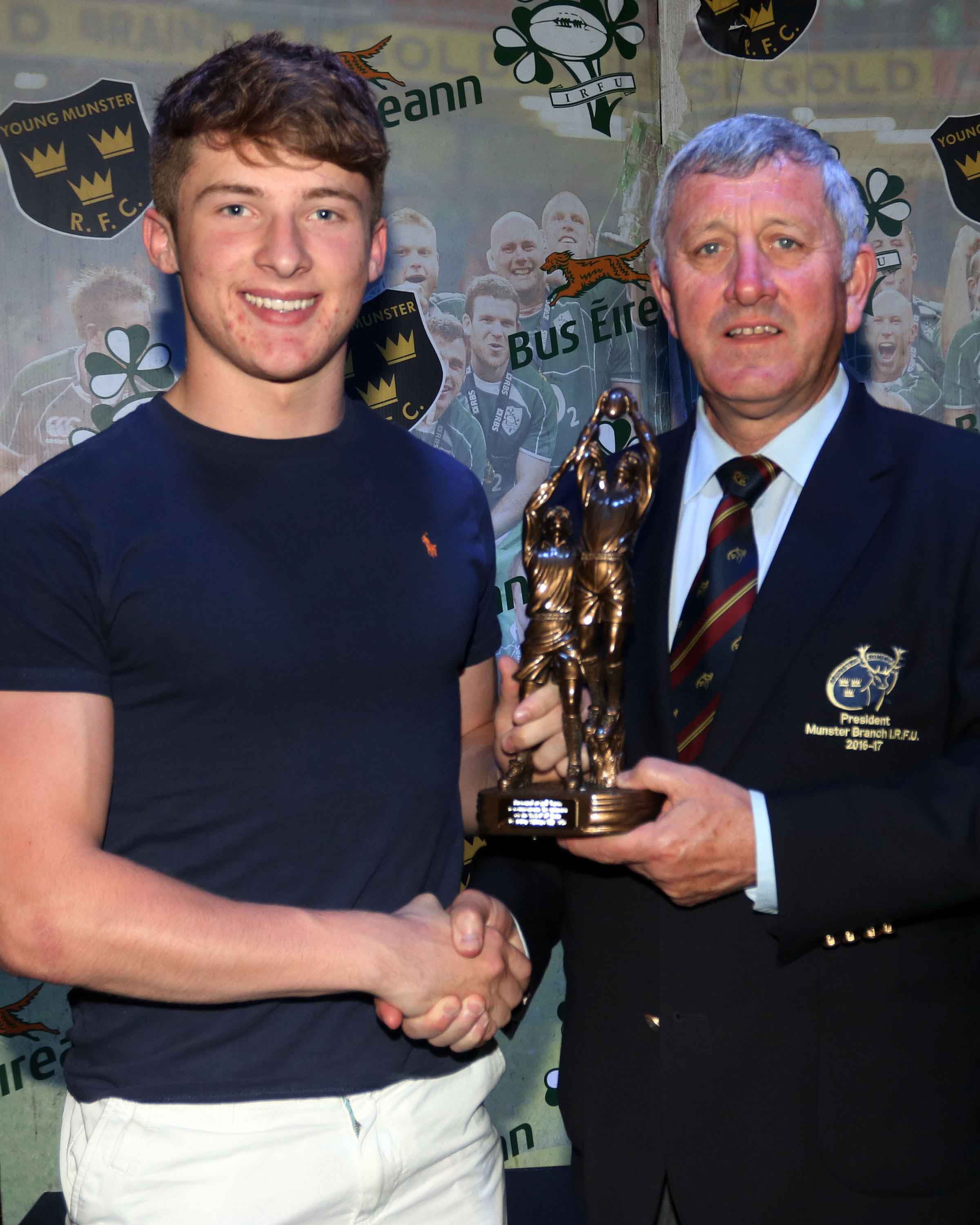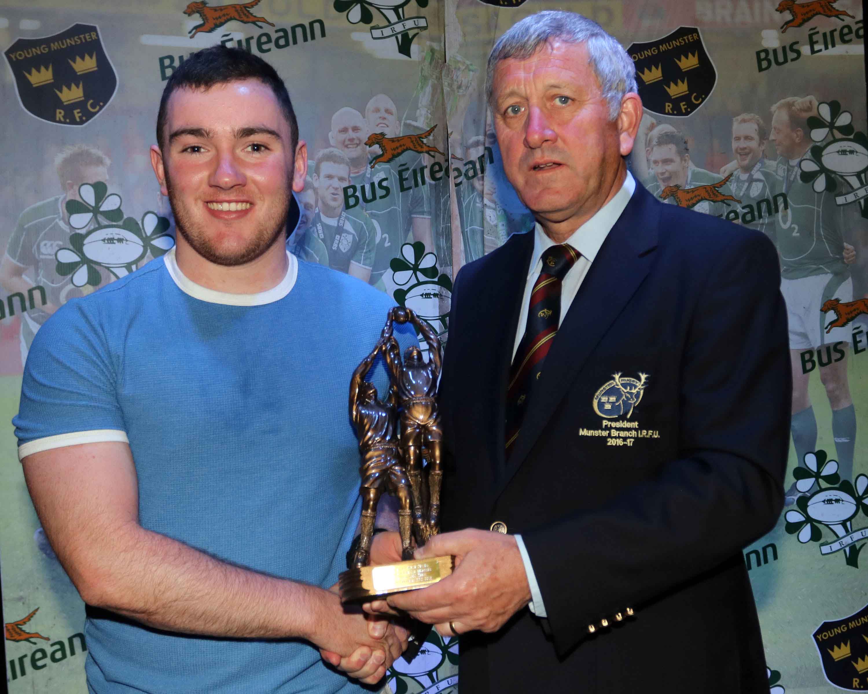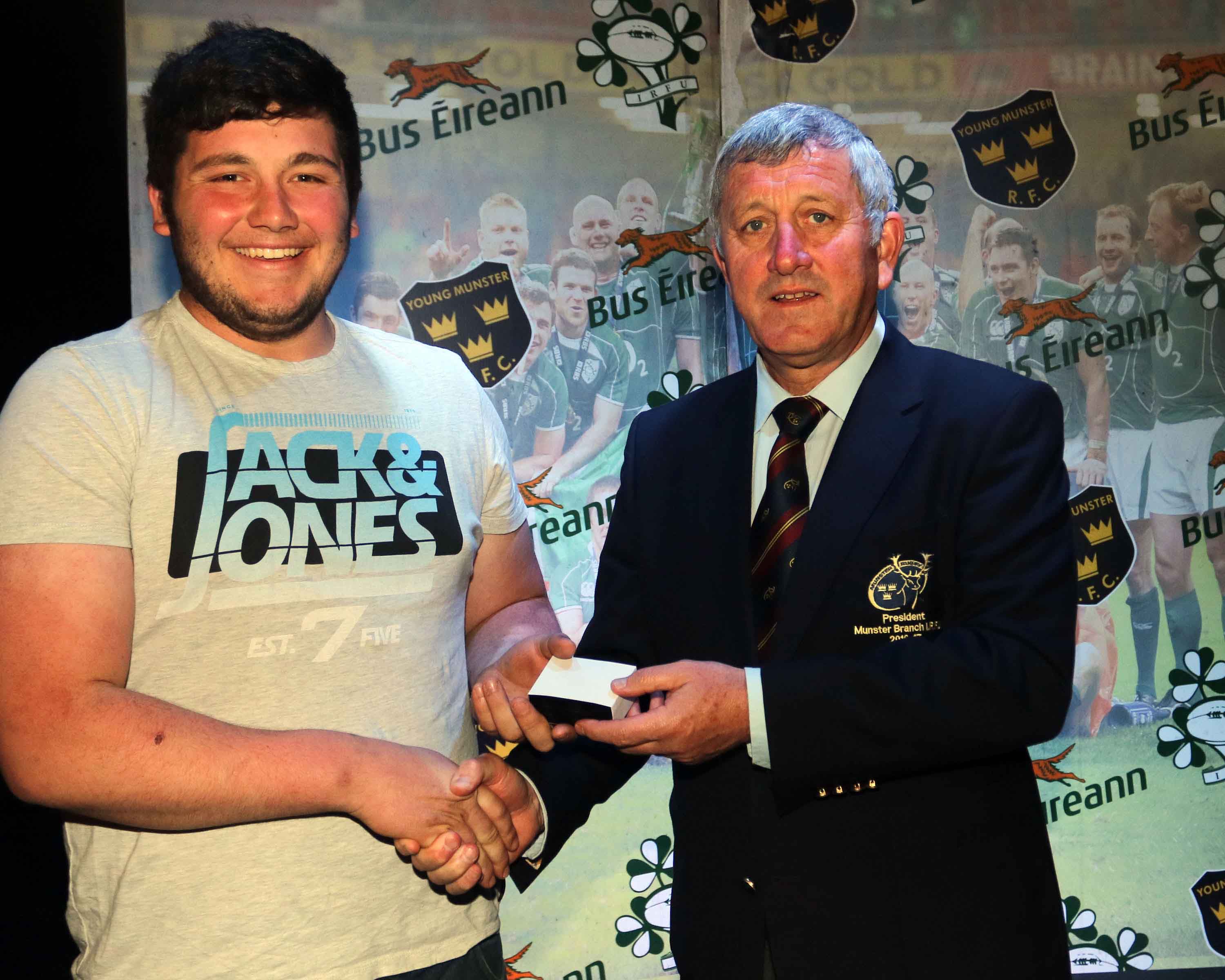 Gerry O’Shea, President of the Munster Branch IRFU presents Geroid Lyons with his Trophy at the Young Munsters RFC end of Year Presentations at the Library Bar.