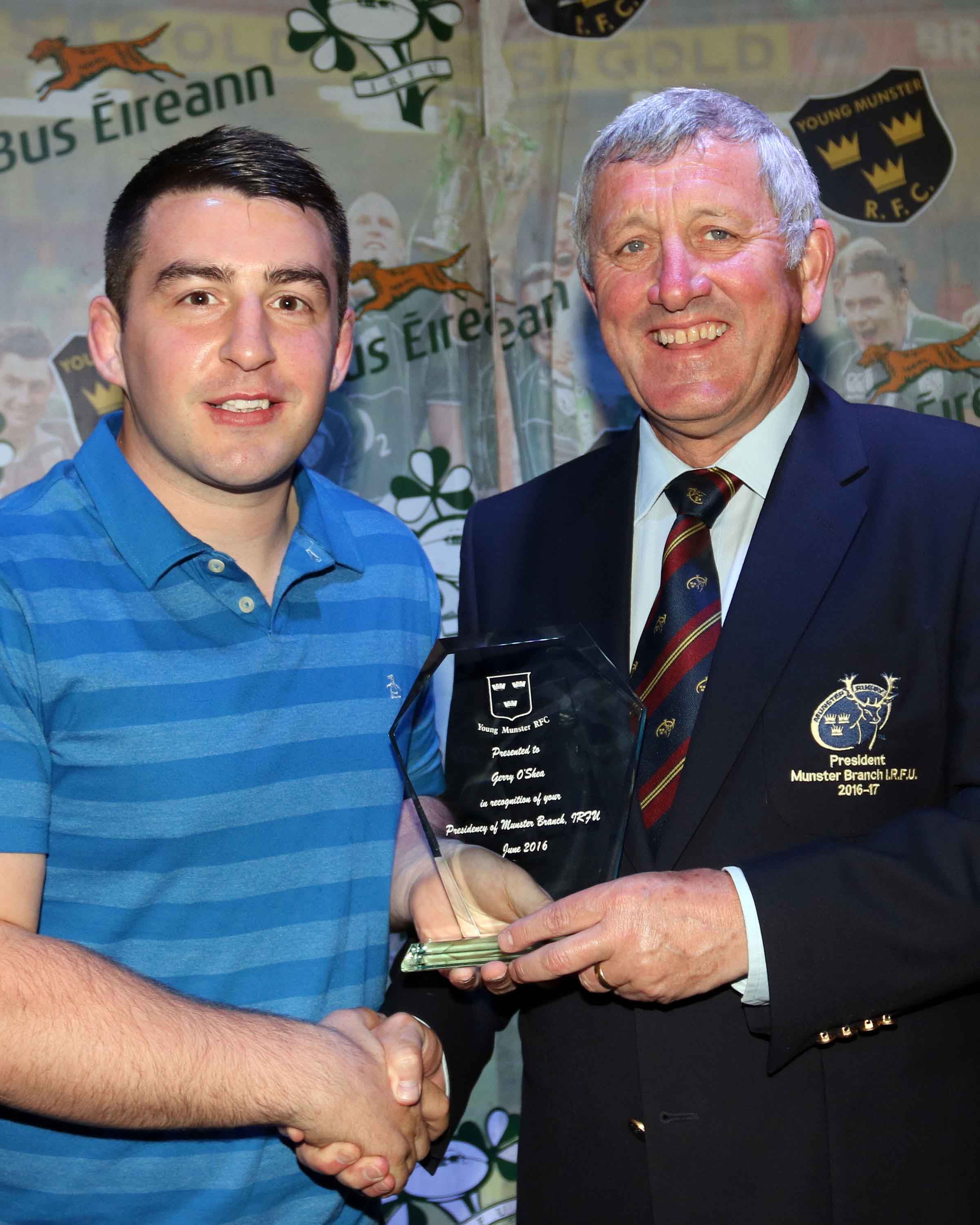Gerry O’Shea, President of the Munster Branch IRFU presents Geroid Lyons with his Trophy at