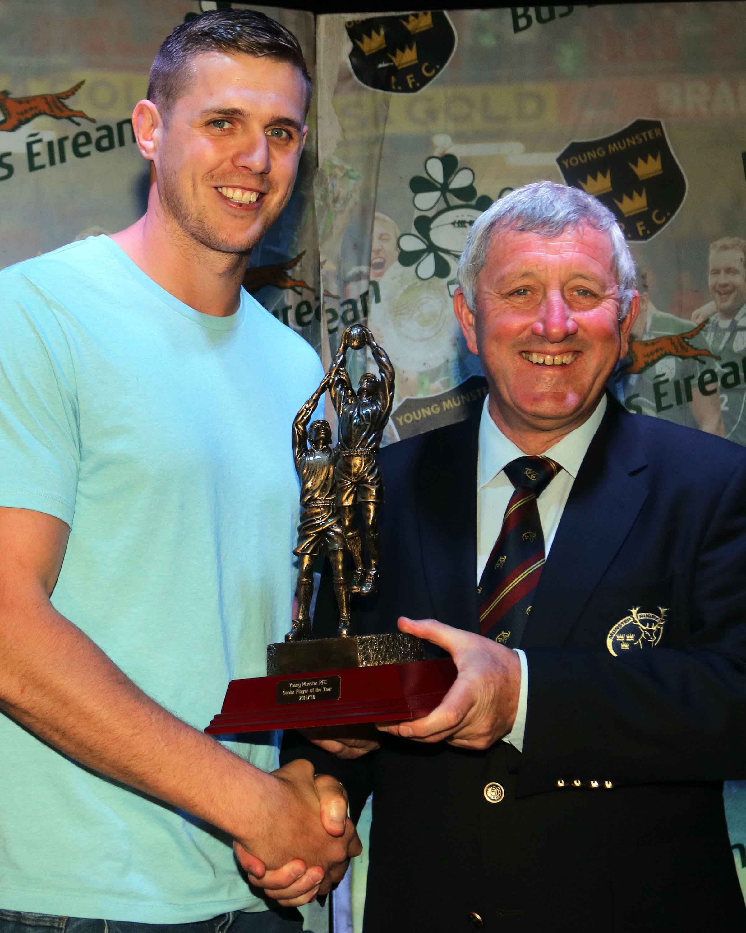 Gerry O’Shea, President of the Munster Branch IRFU presents Shane Fenton with his trophy after representing Ireland at Under 20 Level at the Young Munsters RFC end of Year Presentations at the Library Bar