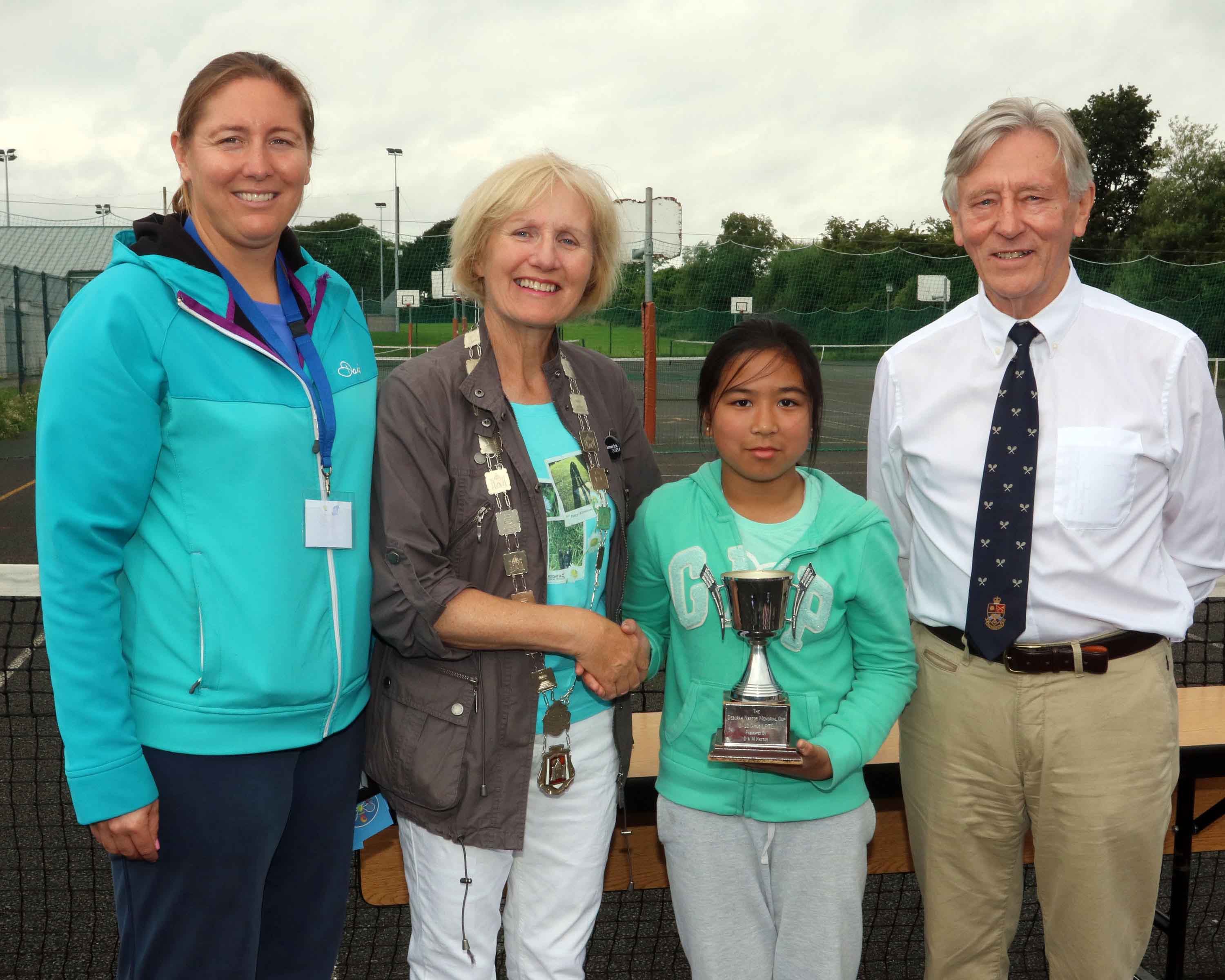 Deputy Mayor, Marian Hurley prresents Angelica Docusin with the Deborah Nestor Cup with Lena P’Connor and Jim Upton at the Maxol Tennis Camps at Castletroy College.