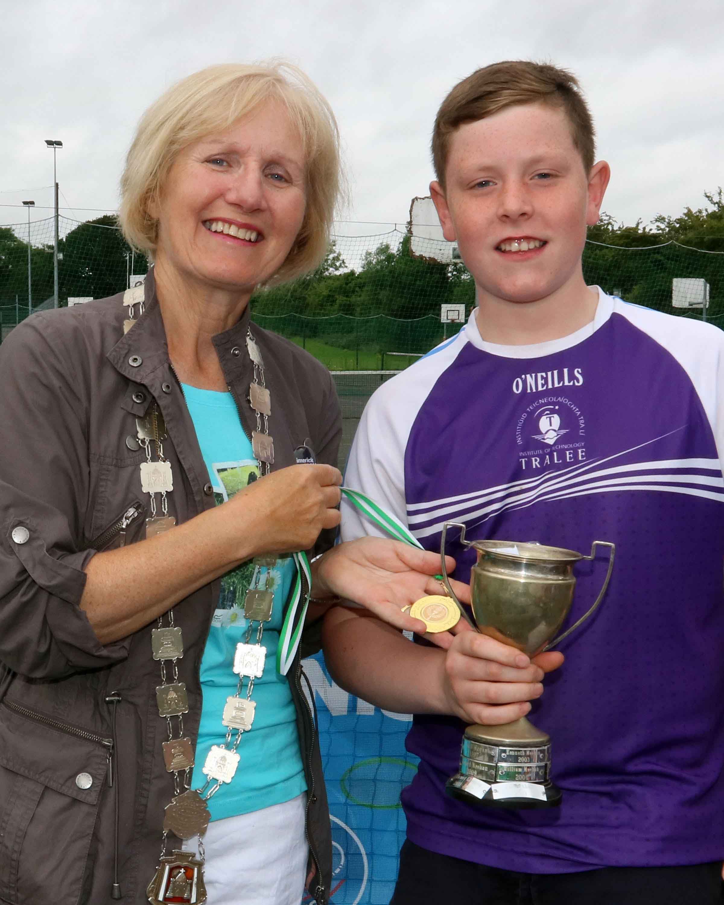 Harry Mulllane been presented with his Trophy and medal by Deputy Mayor Marian Hurley at the Maxol Tennis Camps at Castletroy College.