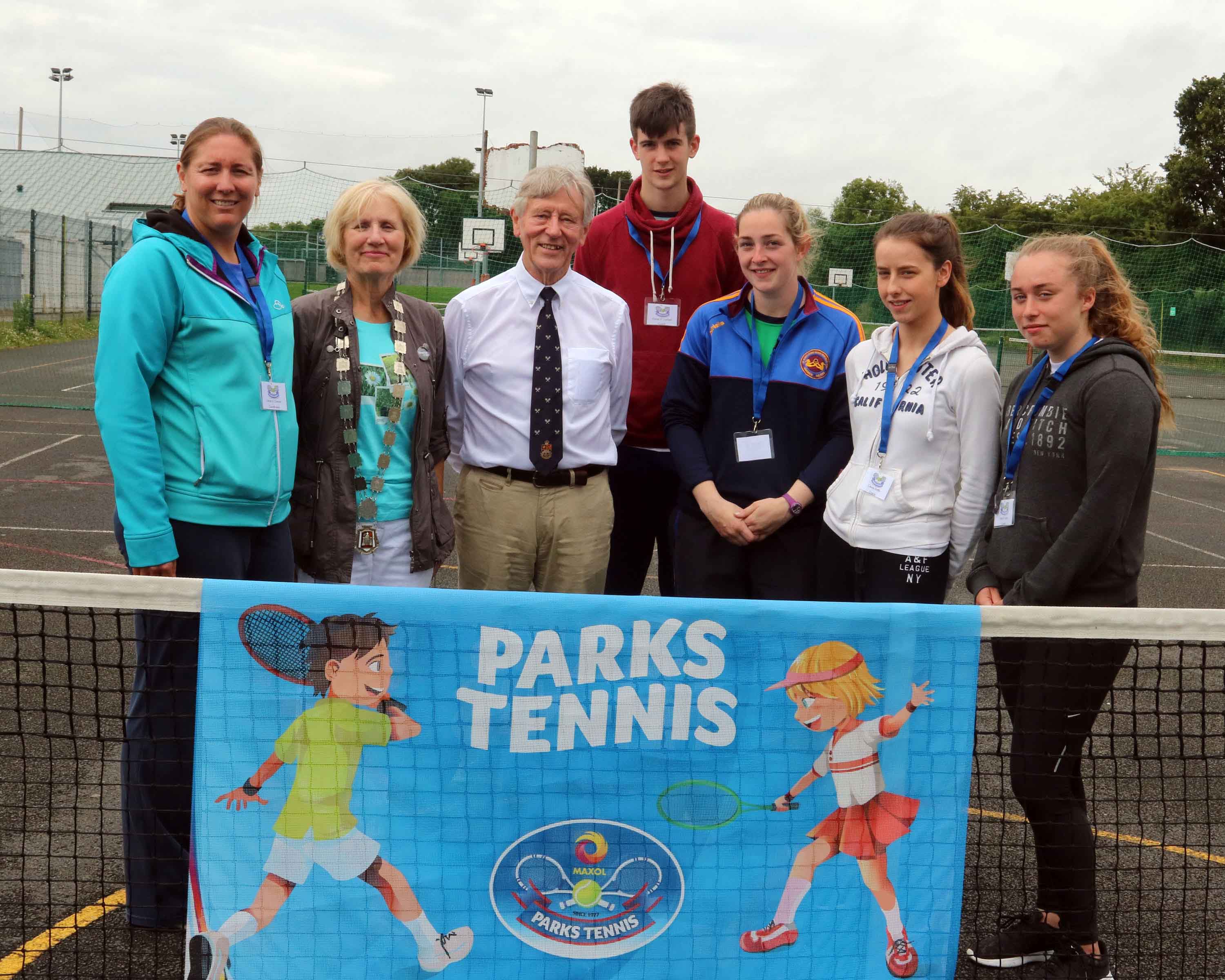Lena O’Connor, Deputy Mayor, Marian Hurley, Jim Upton and Coaches, Doanl O’Connell, Ingrid Laffan, Laura Griffin and Sarah Carey, at the Maxol Tennis Camps at Castletroy College.