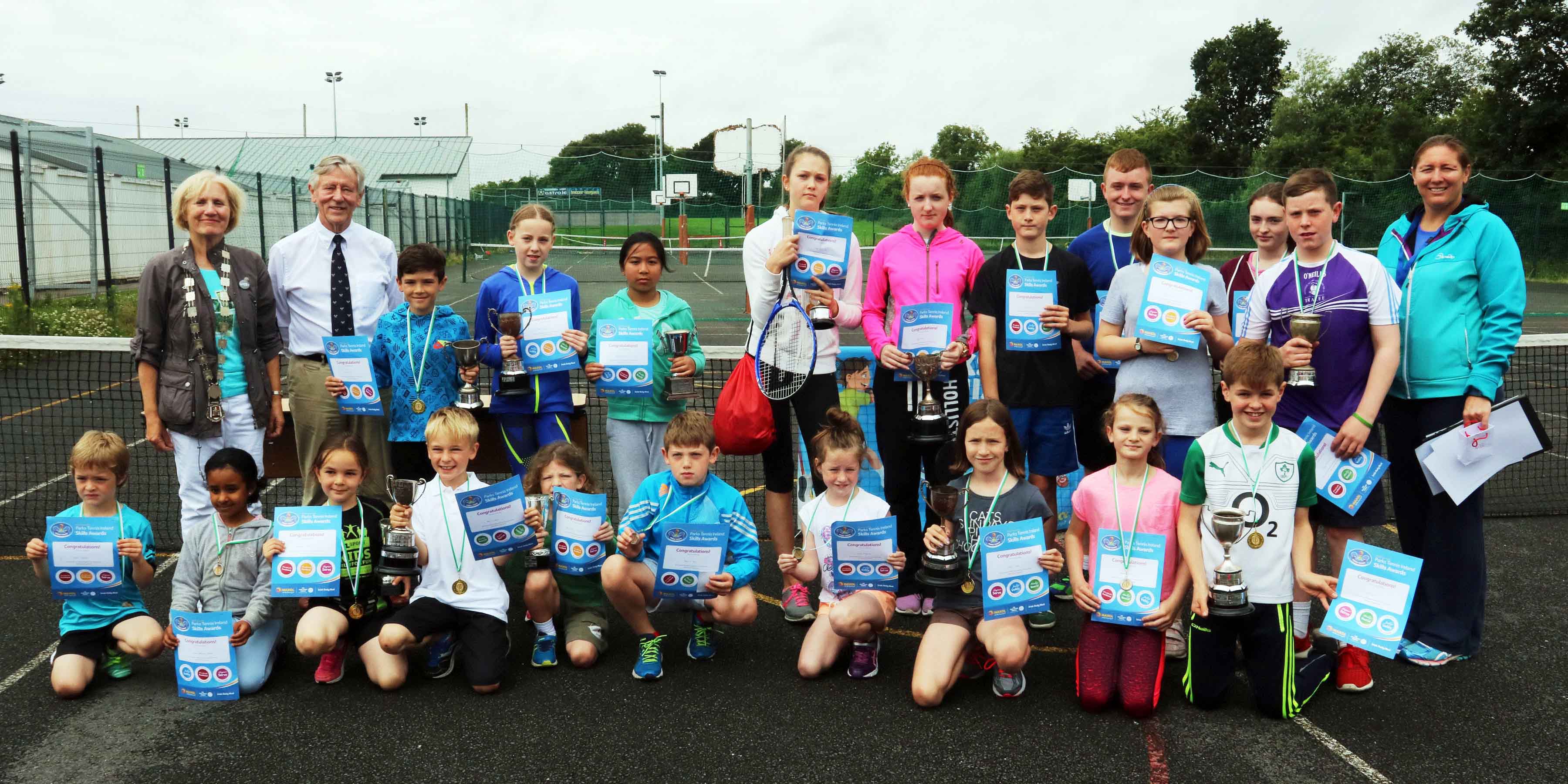 The Deputy Mayor, Marian Hurley with Jim Upton and Lena O’Connor, with the Winners Under 8, 10, 12, 15 and 17 of the Maxol Tennis Camps at Castletroy College.