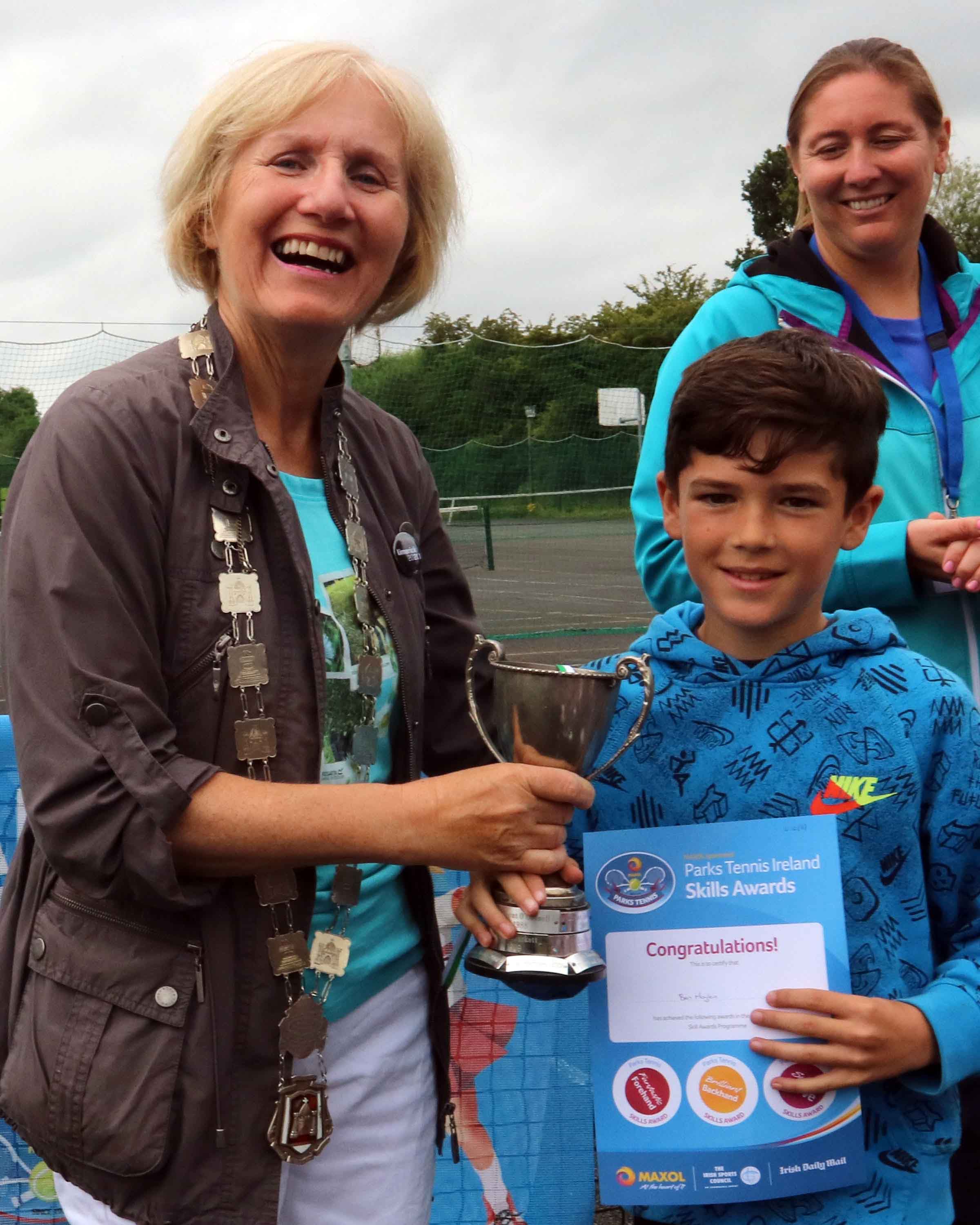 Deputy Mayor Marian Hurley presents Ben Moylan with his Trophy and Medal at the Maxol Tennis Camps at Castletroy College.