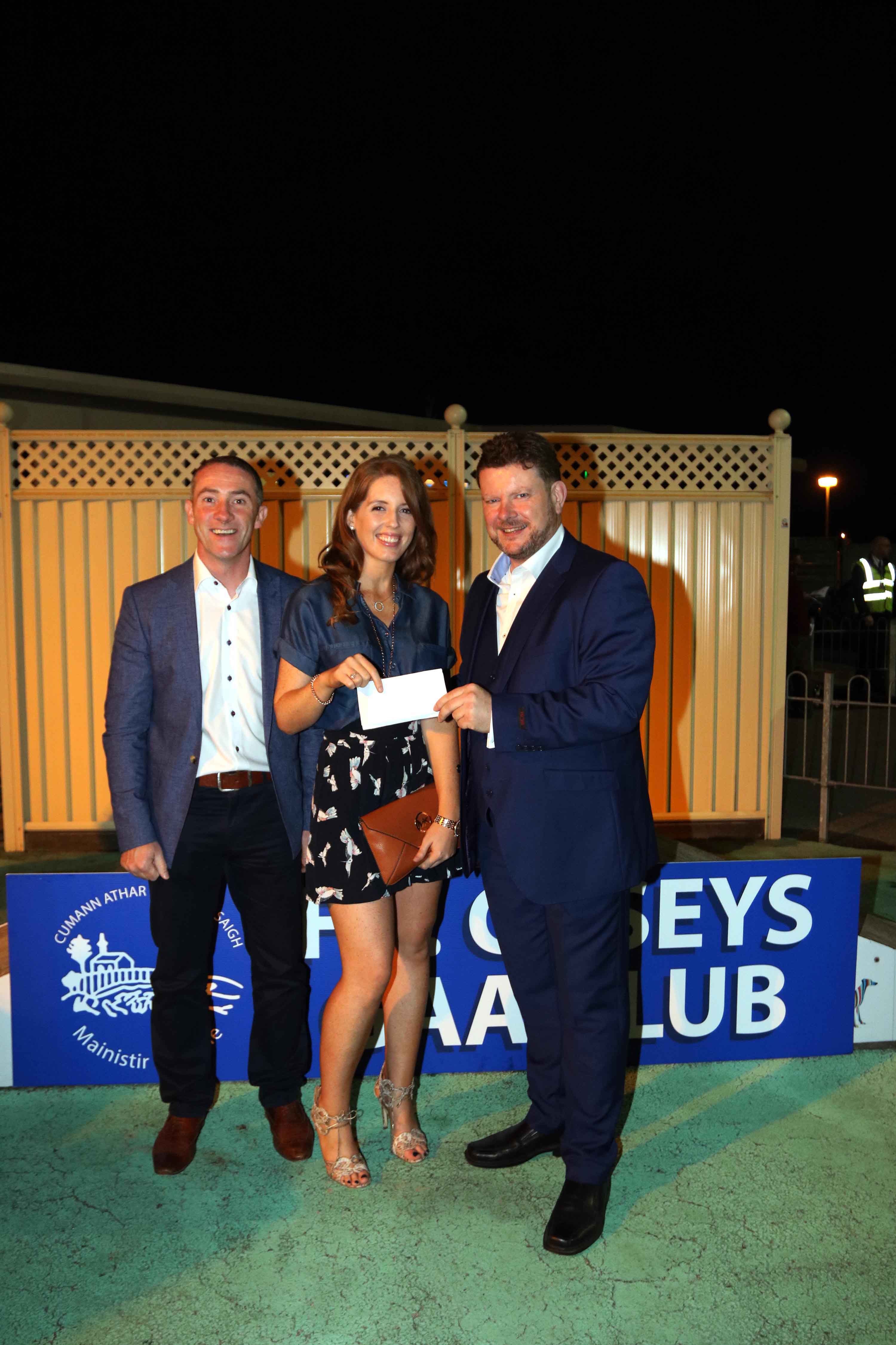 Maurice O’Connell presents Ciara Crowley with Best Dressed Lady at the Fr Casey’s Greyhound Night with Gerard O’Connell, at Limerick Greyhound Stadium.