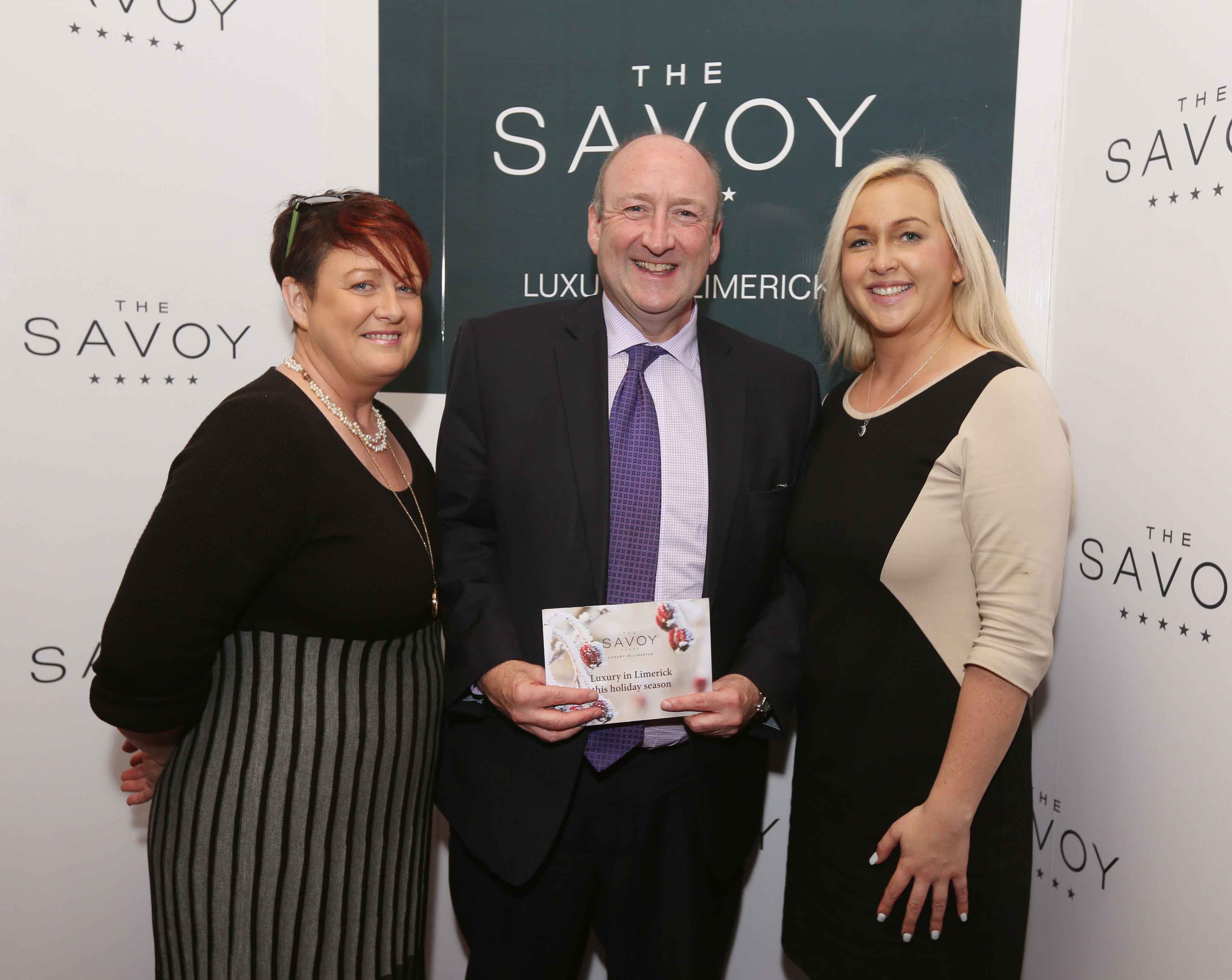 15/9/2016. With Compliments. The Savoy Hotel hosted a coffee morning funds raising event in aid of Milford Hospice recently. Attending the event were Ann Murray and PetrinaHayes from the Savoy Hotel with Pat Daly, Limerick City & Co Council.