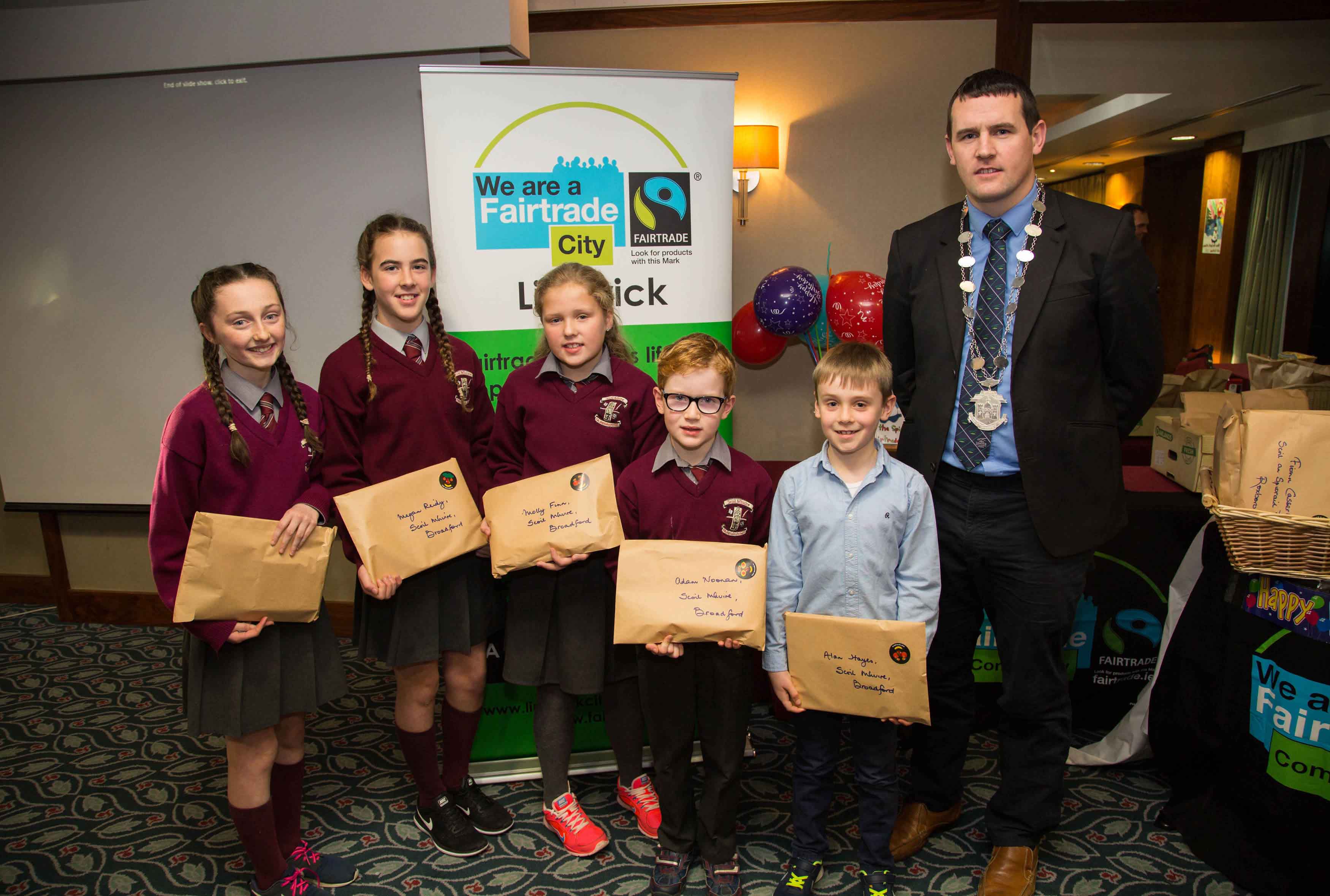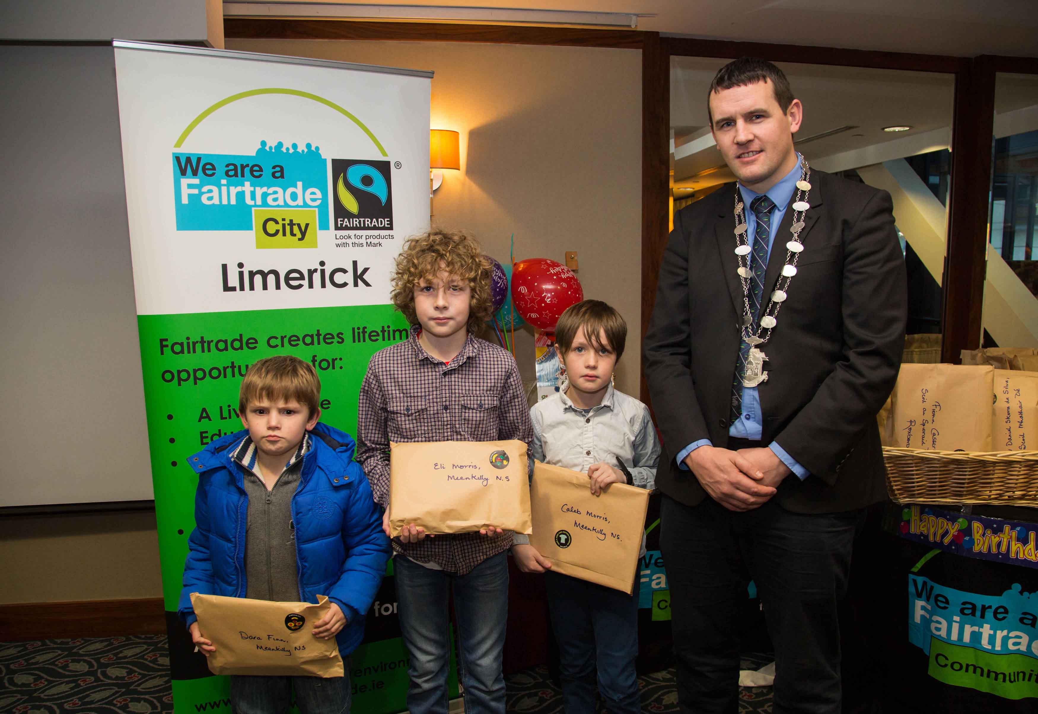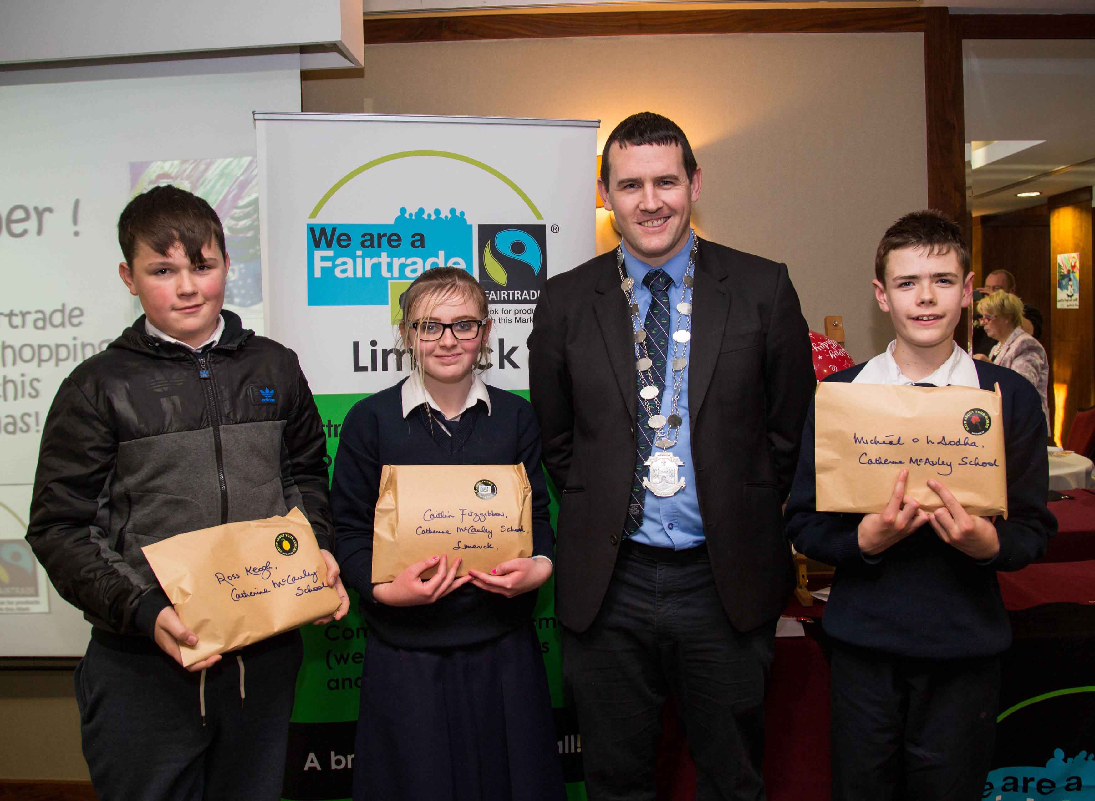 Pictured at the ceremony were, Sr. Delia O’Connor, Fair-trade, Deputy Mayor Cllr. Frankie Daly, fifth class pupil Paul Reddan from Corpus Christi Primary School in Moyross and Jessica Griffin, a first year student at John the Baptist Community School in Hospital. Picture: Alan Place