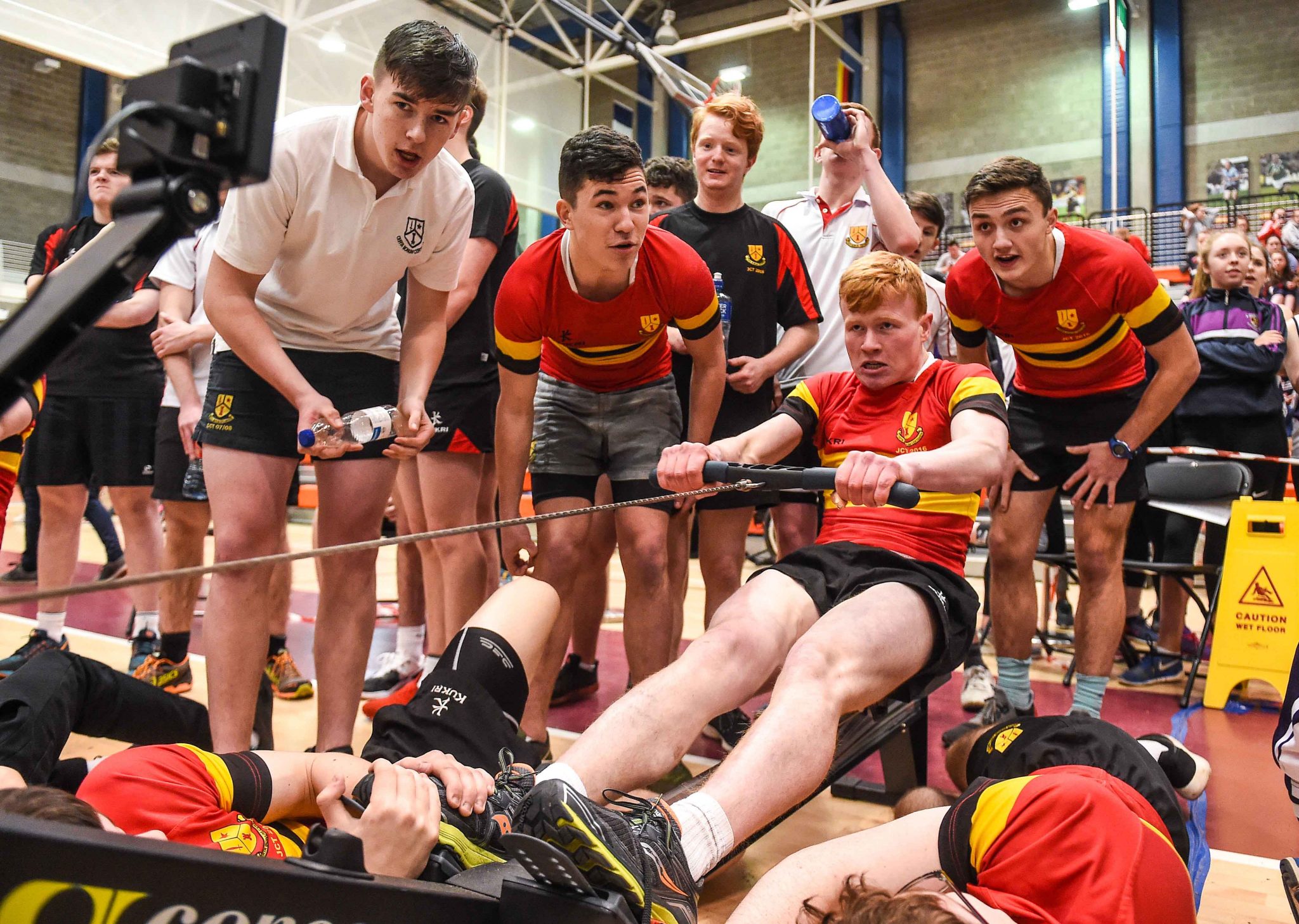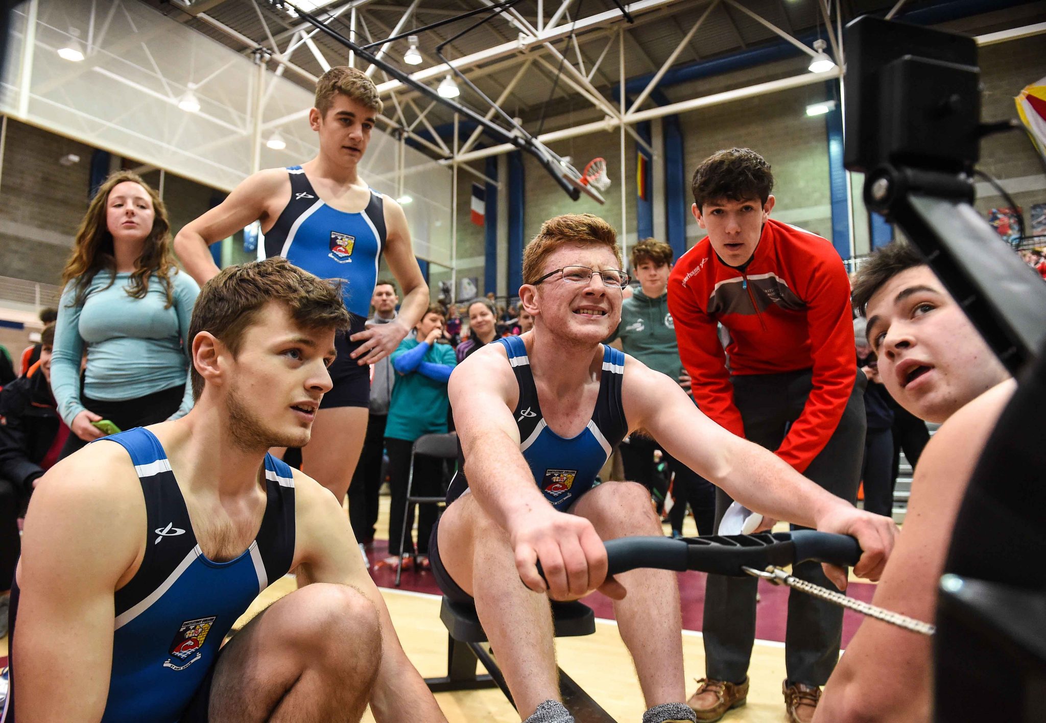 Castletroy College students Ben O’Brien Christie, Rory O’Neill, rower James Desmond, James Quinlan and Ronan Murtagh in action during the Limerick Sports Partnership / Rowing Ireland inaugural indoor rowing blitz at the University of Limerick, Limerick.