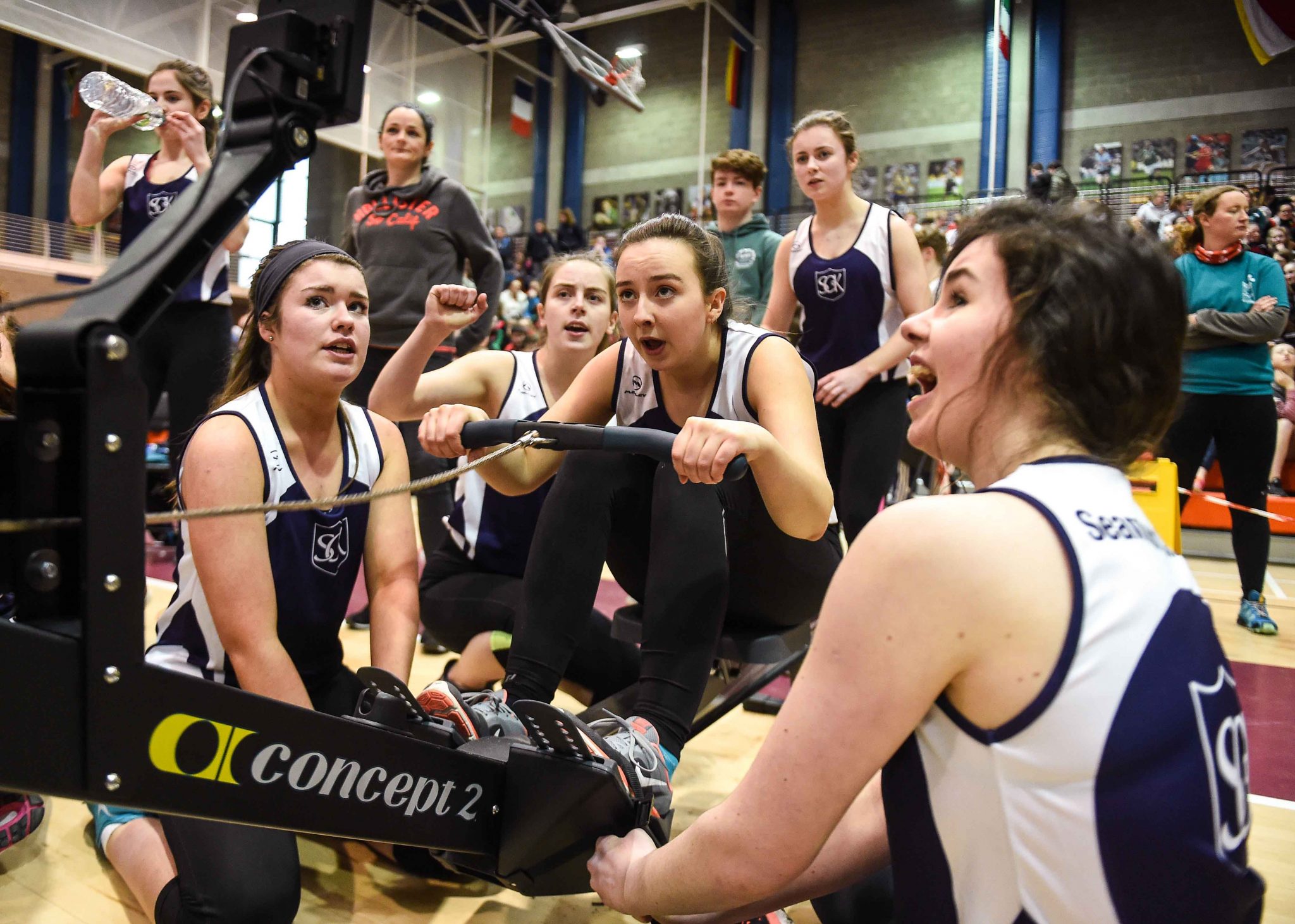 Alison Coffey of Salesian College, Pallaskenry, Co. Limerick, is encouraged by her team-mates, from left to right, Ailsing McGuinness, Michelle O’Keeffe, Orlaith Maher, and Megan Browne during the Limerick Sports Partnership / Rowing Ireland inaugural indoor rowing blitz at the University of Limerick, Limerick.