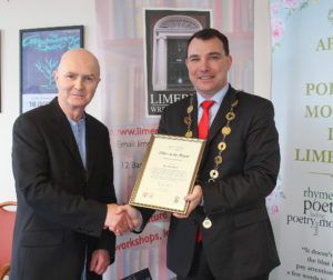 This year’s Ollamh is Kenmare based poet John W. Sexton who received his seal of office from the Mayor James Collins last week. Over the course of the month An tOllamh will visit schools in the city and county, giving them the experience of seeing poetry as a living art form that anyone, no matter what age, can take part in.