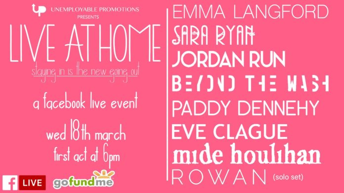 MEDIA company Unemployable Promotions are streaming an online live event this Wednesday March 18 from 6pm. The lineup features some of Ireland’s finest music talent, Emma Langford, Paddy Dennehy, Sara Ryan and Jordan Run.