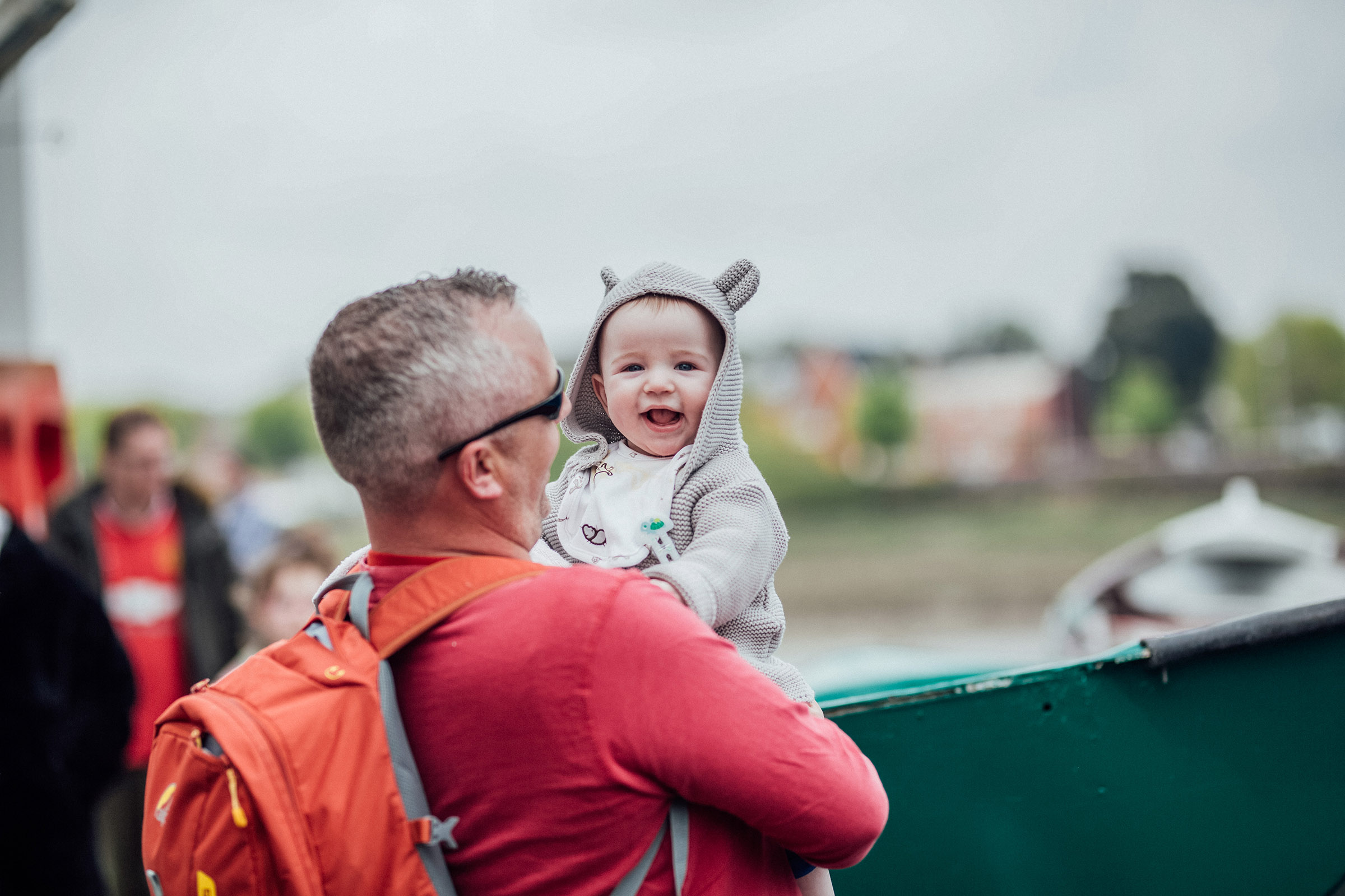 Kieran Mulcahy provides some shade for Martin and Clara Mulcahy as they concentrate on the messages from social media at Riverfest.