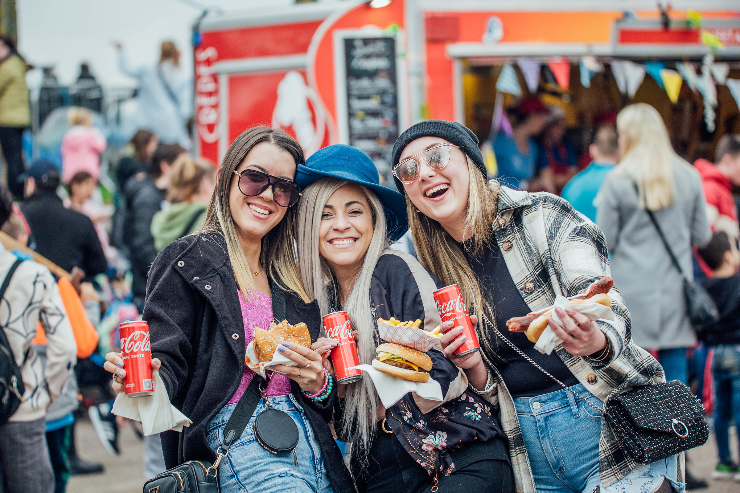 Aline Nunes, Bruna Cacciaguerra and Marinaria Borges sample the fare at the Riverfest Village.