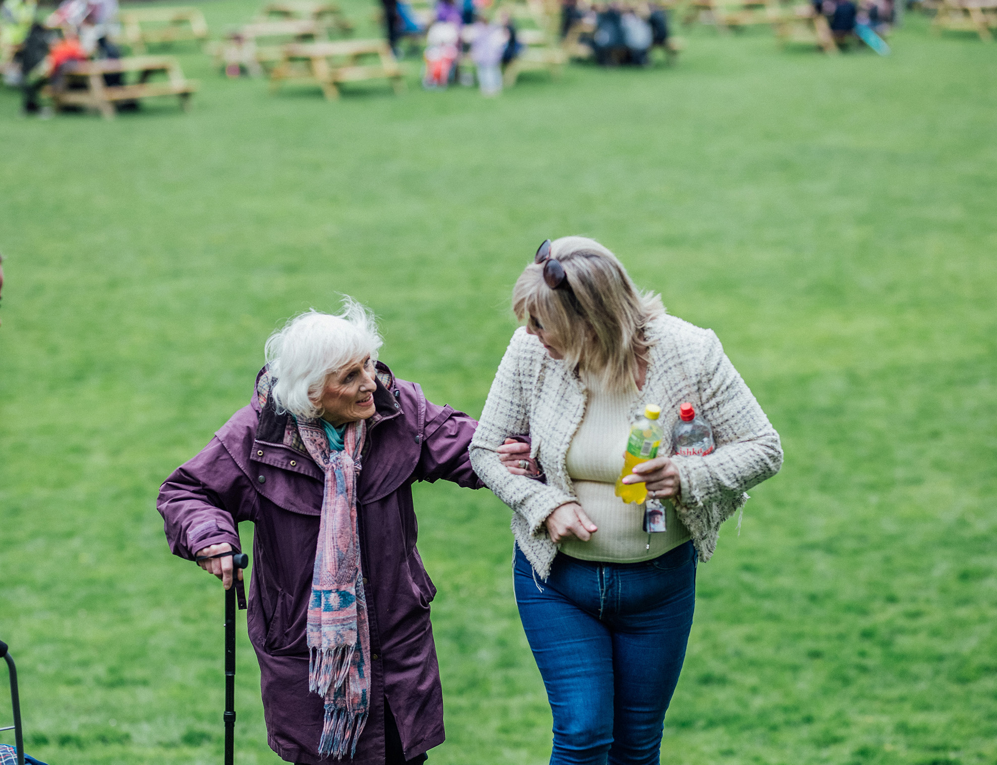 Caroline Kelly helps Barbara Hanley reach the Riverfest Party in the Park on Sunday.