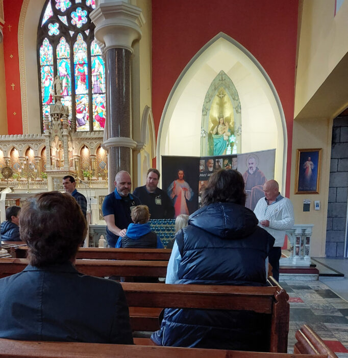 This marks the call to confession. As the sacrament gets underway, Philip Scanlon takes to the pulpit to pray with us before the blessing with the holy Padre Pio relic begins.