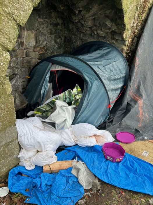 A tent and blankets left by a wall not far from the city centre was a grim reminder of the homeless crisis.