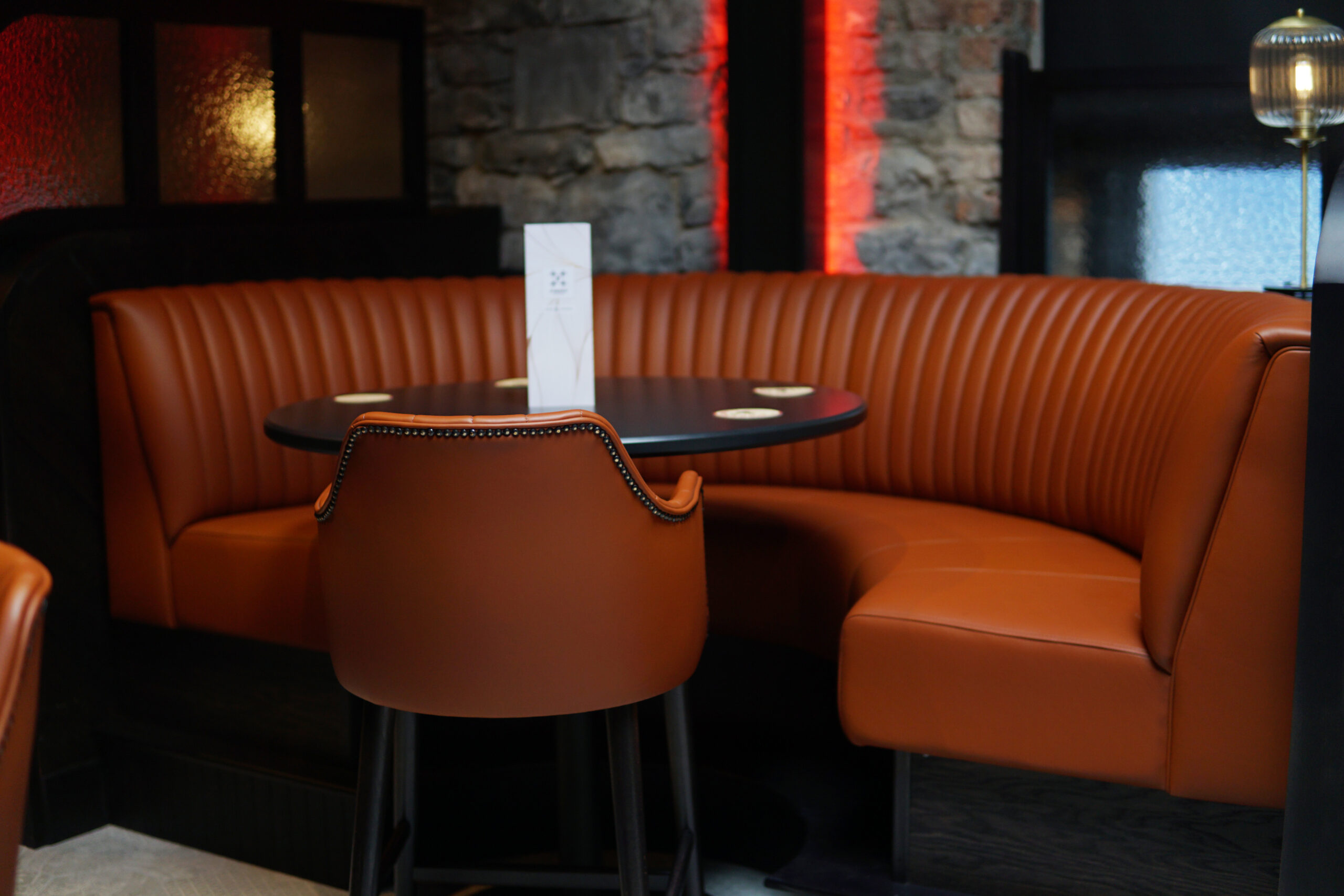 The interior reflects the same thoughtful blend of influences, with exposed stone and brick, rich dark wood, and soft ambient lighting that captures the intimacy of a rustic trattoria and the edge of a contemporary urban bar.
