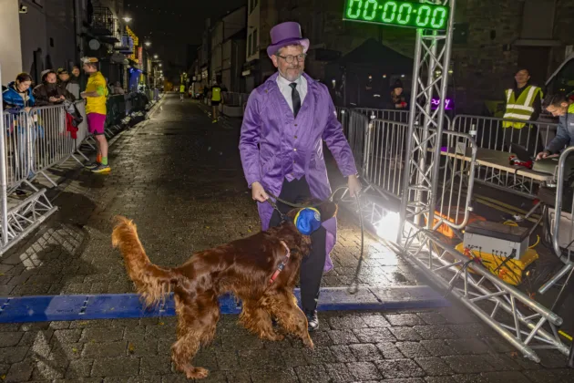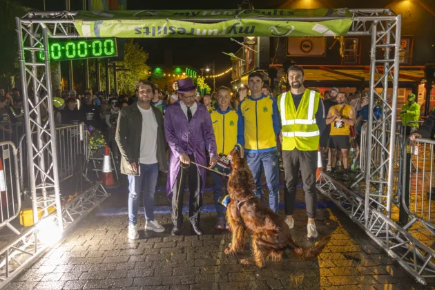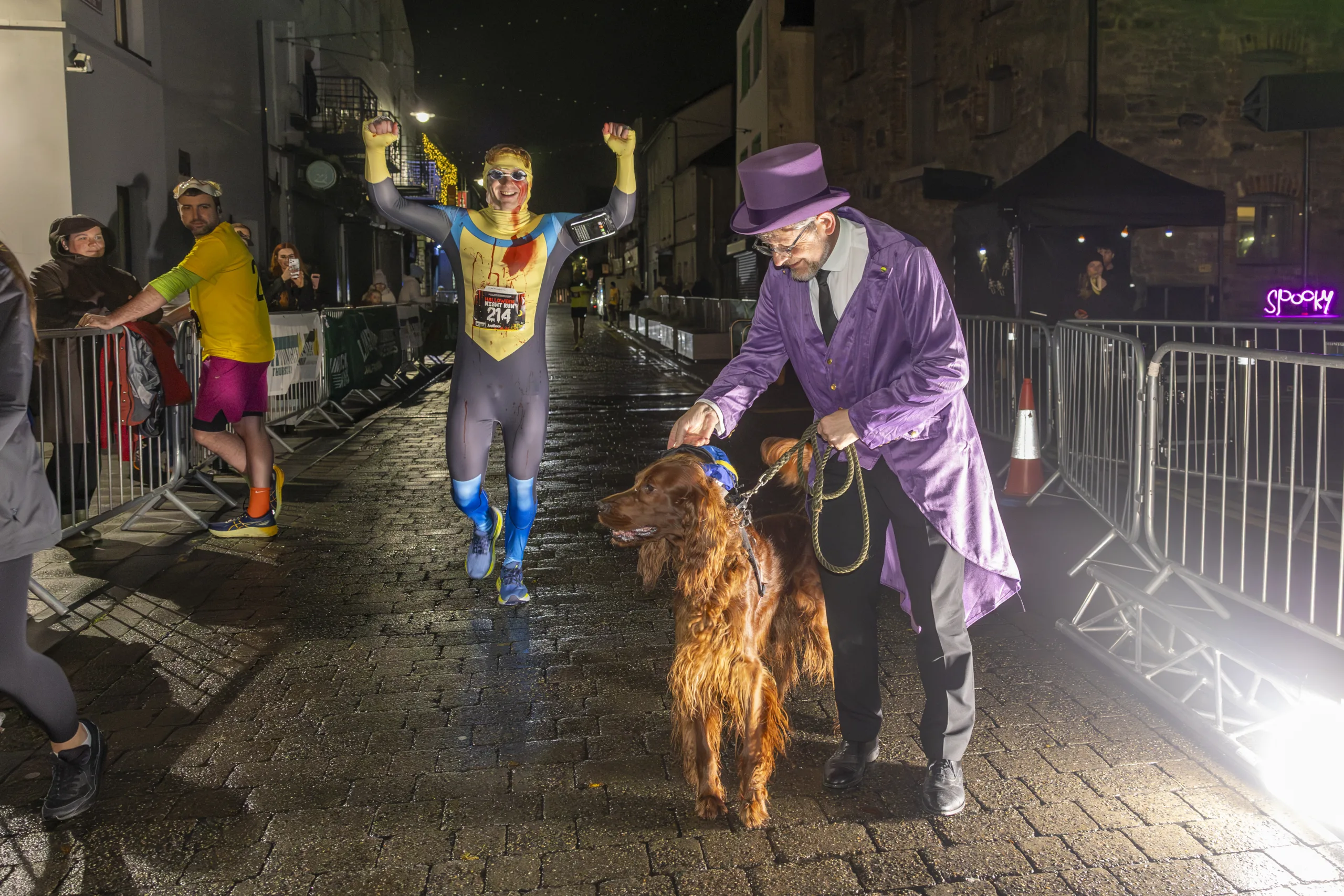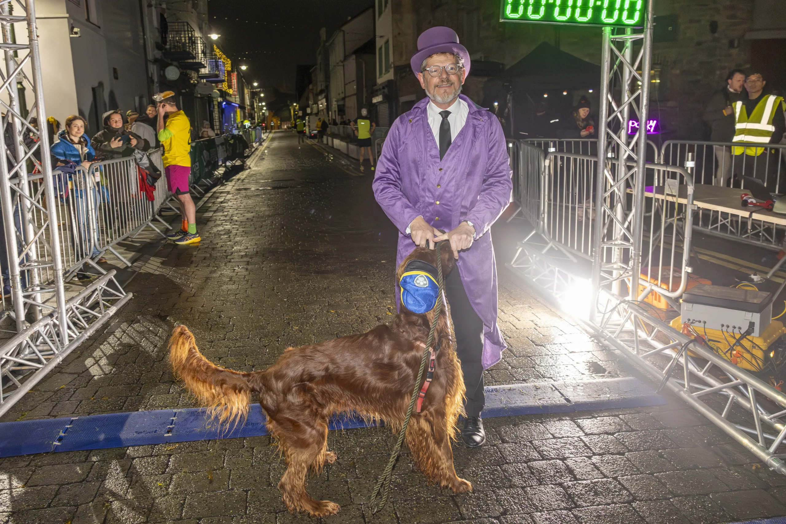 KRB 30-10-2025 LCCC Twilight Thursday -October Twilight Thursdays Halloween fancy dress Limerick Night Run - Mayor of Limerick John Moran and his dog Henri heading - Picture by Kieran Ryan-Benson
