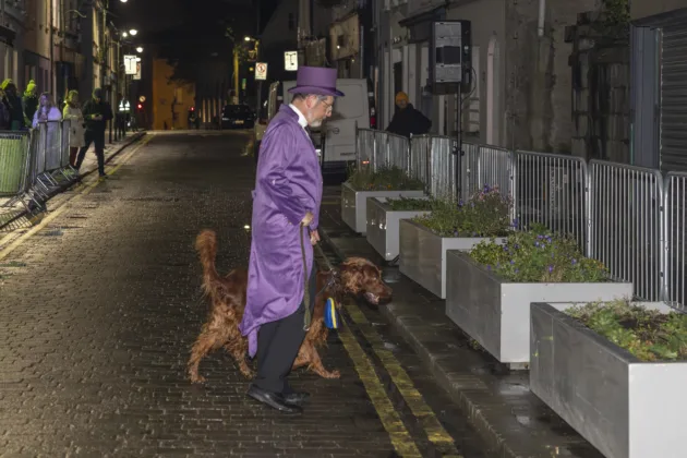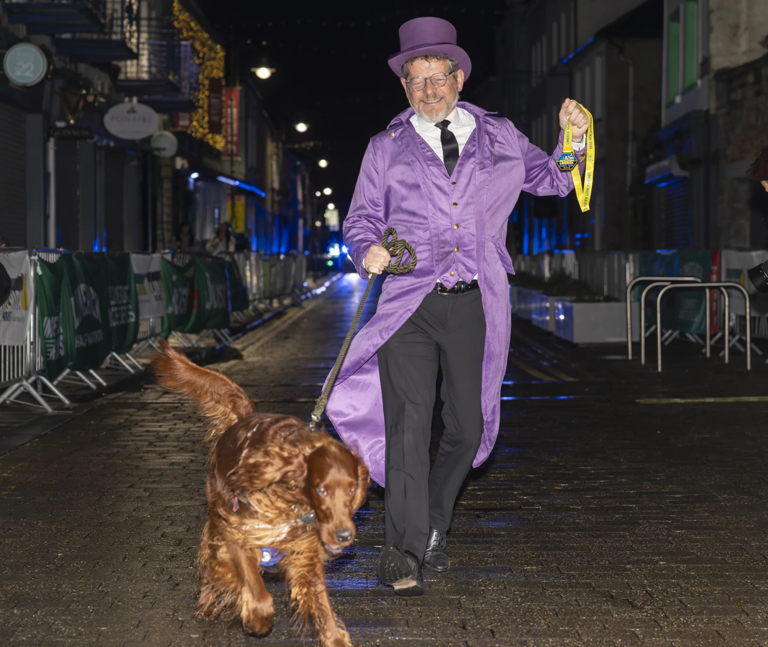KRB 30-10-2025 LCCC Twilight Thursday -October Twilight Thursdays Halloween fancy dress Limerick Night Run - Mayor of Limerick John Moran and his dog Henri sharing a moment with Night Time Economy Advisor Limerick City & County Council Craig Power - Picture by Kieran Ryan-Benson