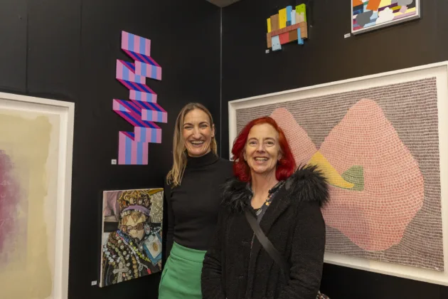 Artist Nickie Harrington from Roscommon with artist Mary Butler from Kilkenny at the Open Submissions exhibition at the Hunt Museum. Photo: Kieran Ryan-Benson.