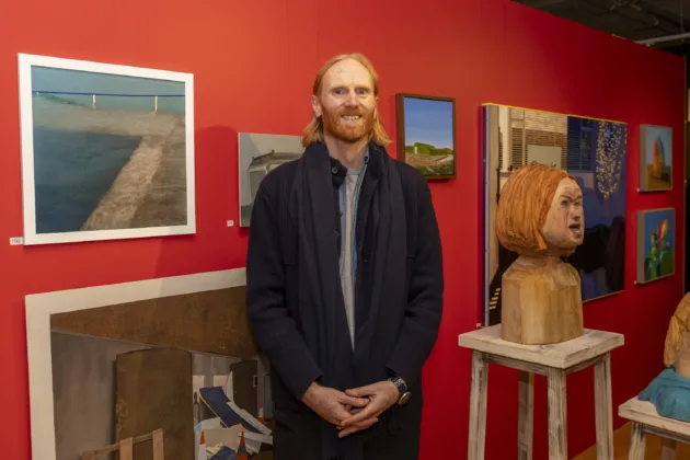 Laurence O’Toole with his self portrait at the Open Submissions exhibition at the Hunt Museum. Photo: Kieran Ryan-Benson.