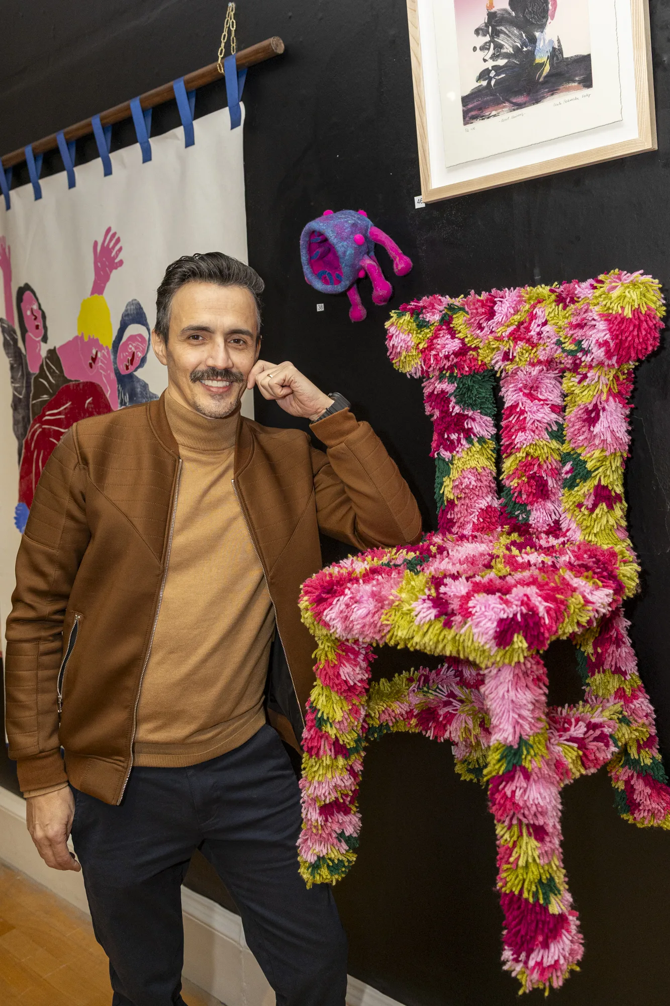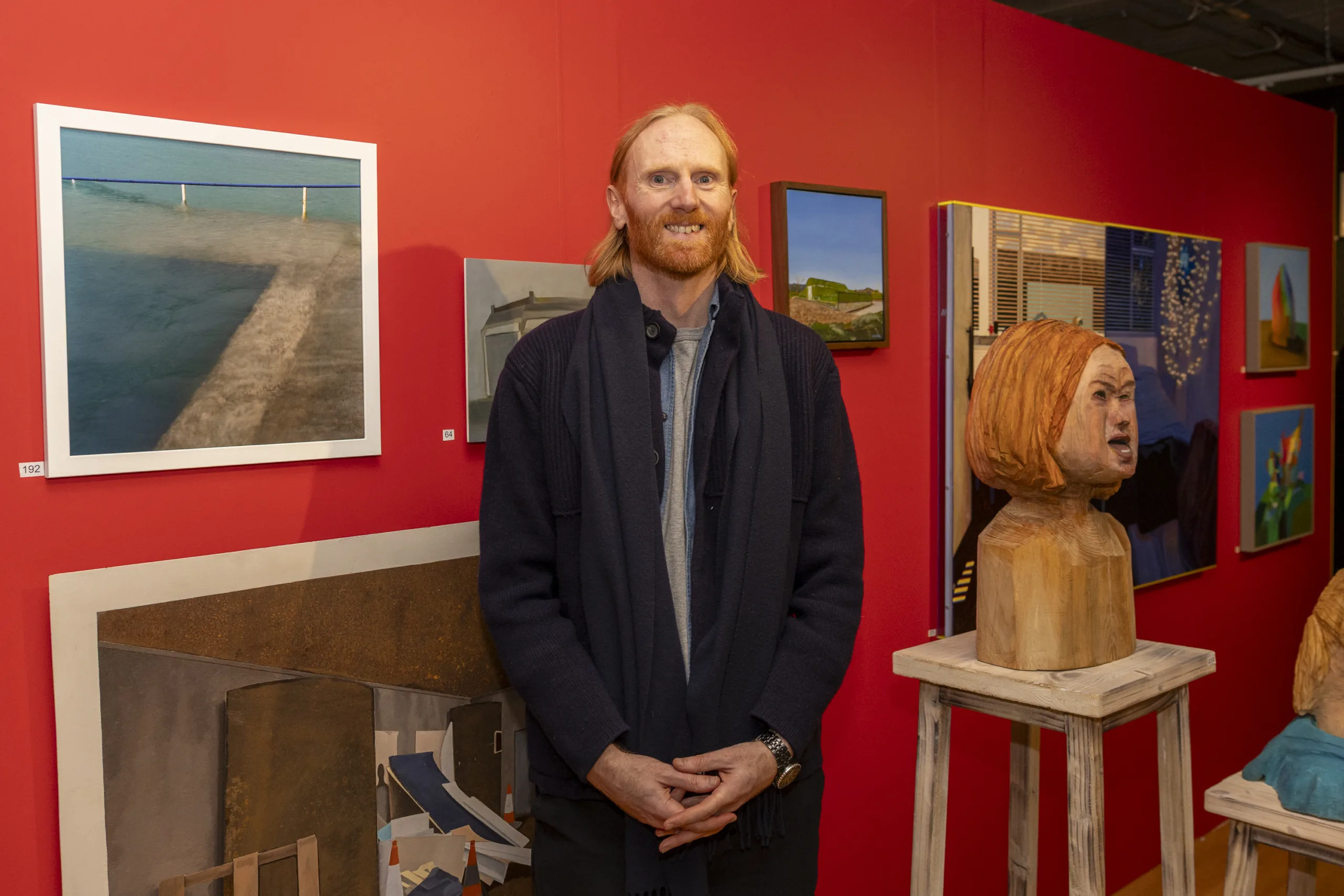 The exhibition features a mix of painting, sculpture, mixed media, and digital art.