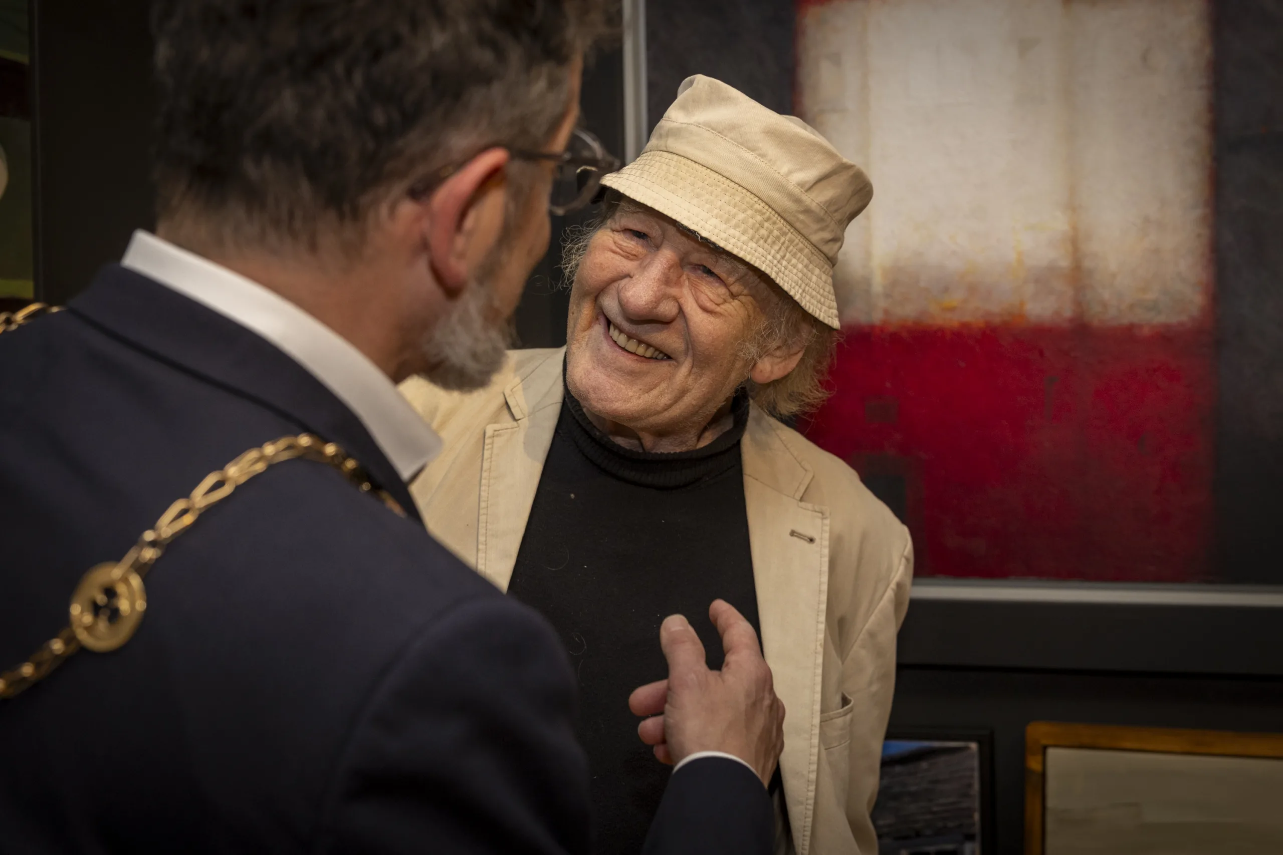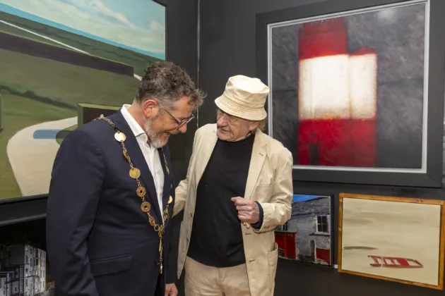 Mayor of Limerick John Moran chatting with artist John Shinnors at the Open Submissions exhibition at the Hunt Museum. Photo: Kieran Ryan-Benson.