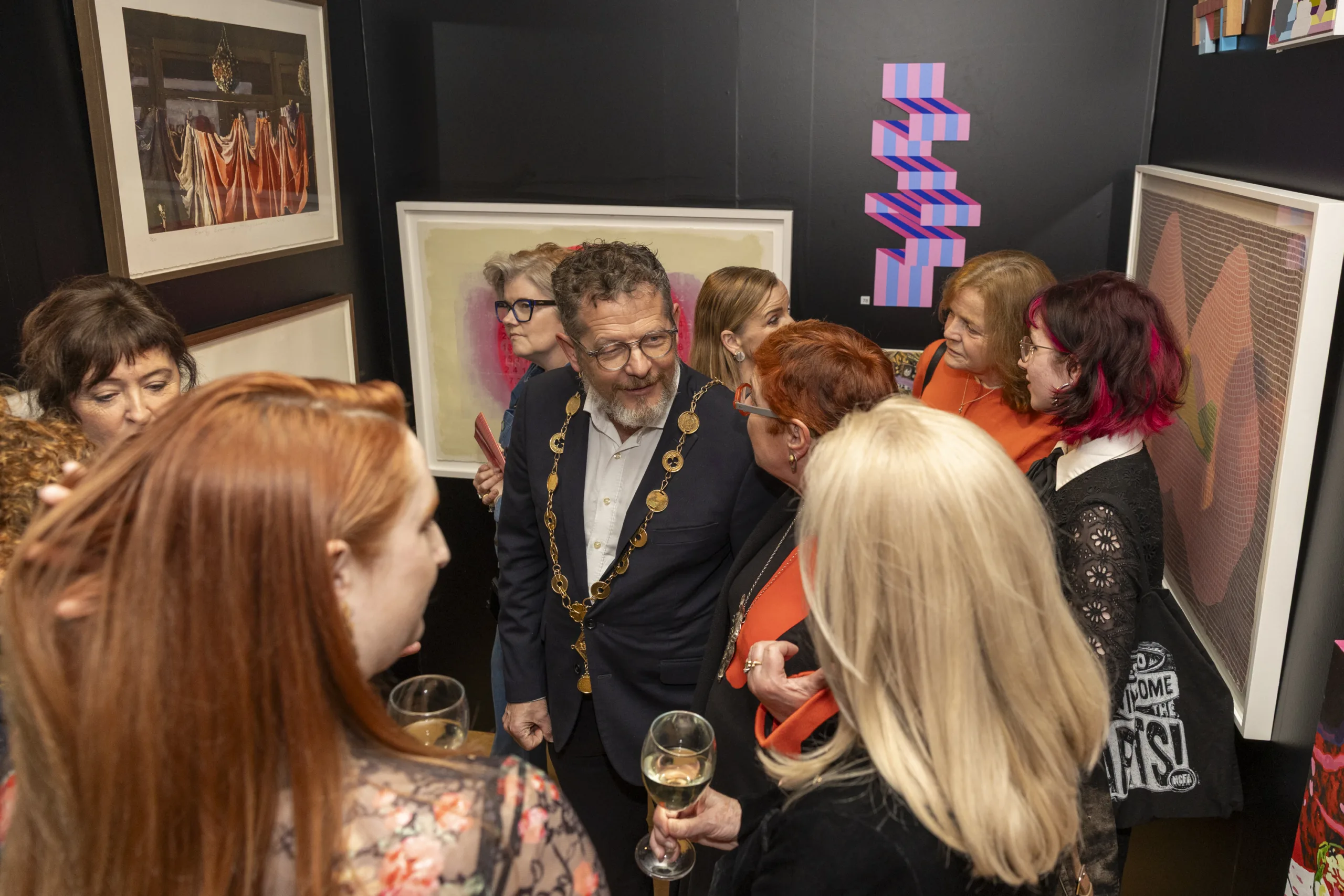 Mayor of Limerick John Moran chatting with artists about their work at the Open Submissions exhibition at the Hunt Museum. Photo: Kieran Ryan-Benson.