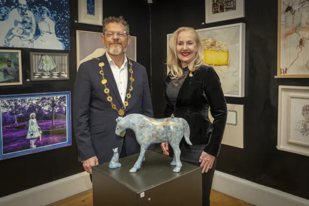 Mayor of Limerick John Moran chatting with artist Stephanie Hess about her work "Parley" in bronze at the Open Submissions exhibition at the Hunt Museum. Photo: Kieran Ryan-Benson.
