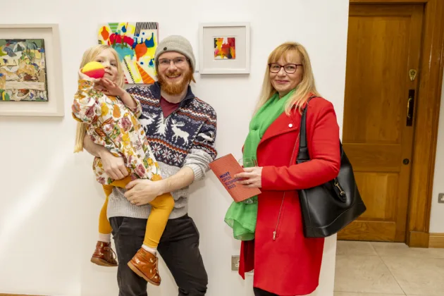 Angela Vaughan with her work and proud son Shane and granddaughter Piper at the Open Submissions exhibition at the Hunt Museum. Photo: Kieran Ryan-Benson.