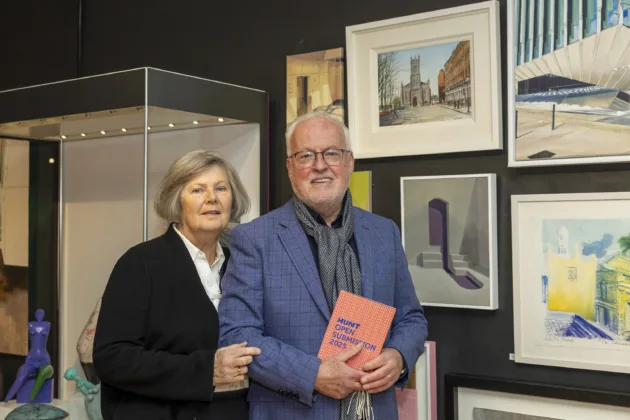 President of Limerick Art Society Jim O'Farrell and his wife Ailish admiring Jim's piece at the Open Submissions exhibition at the Hunt Museum. Photo: Kieran Ryan-Benson.
