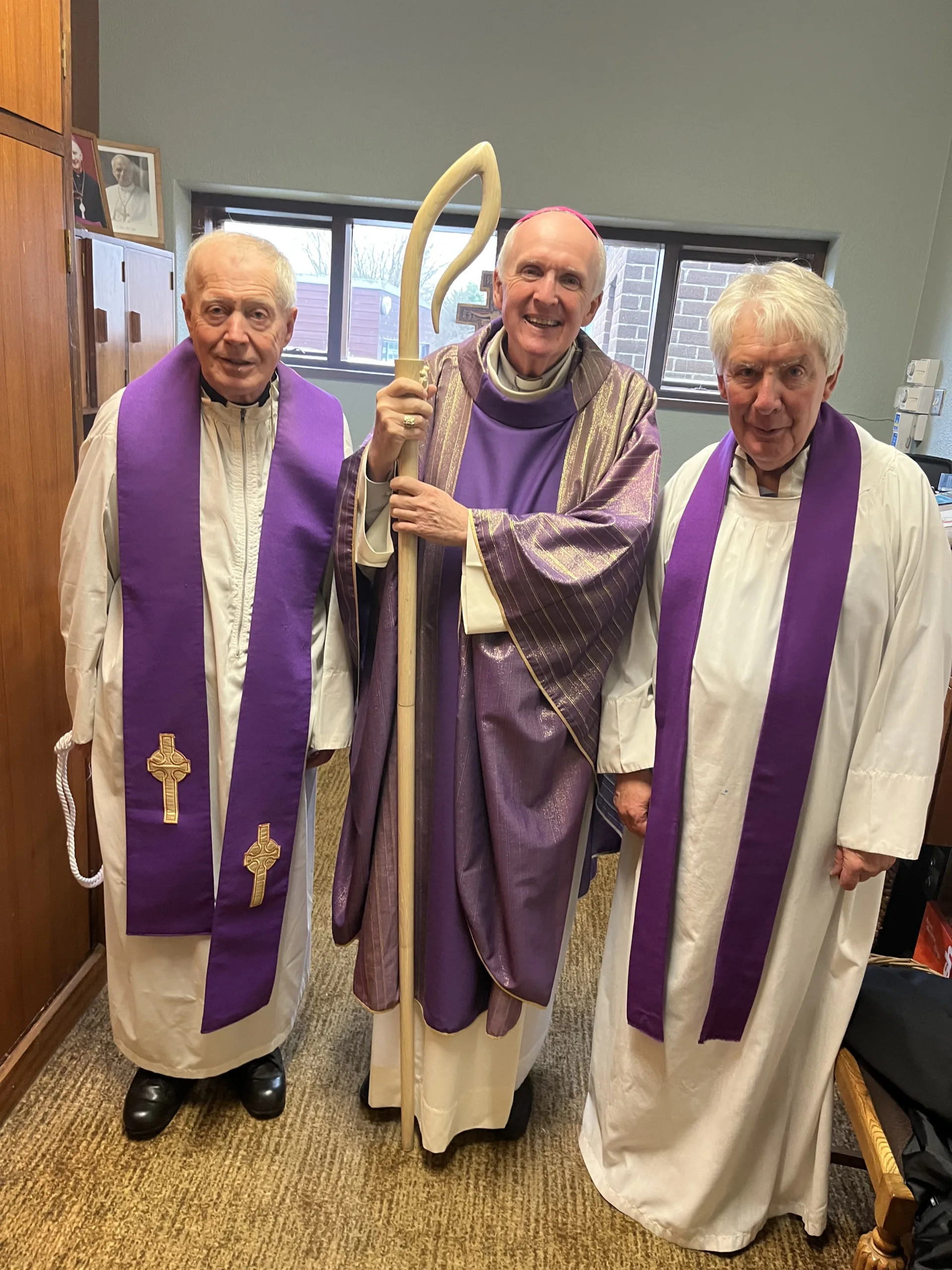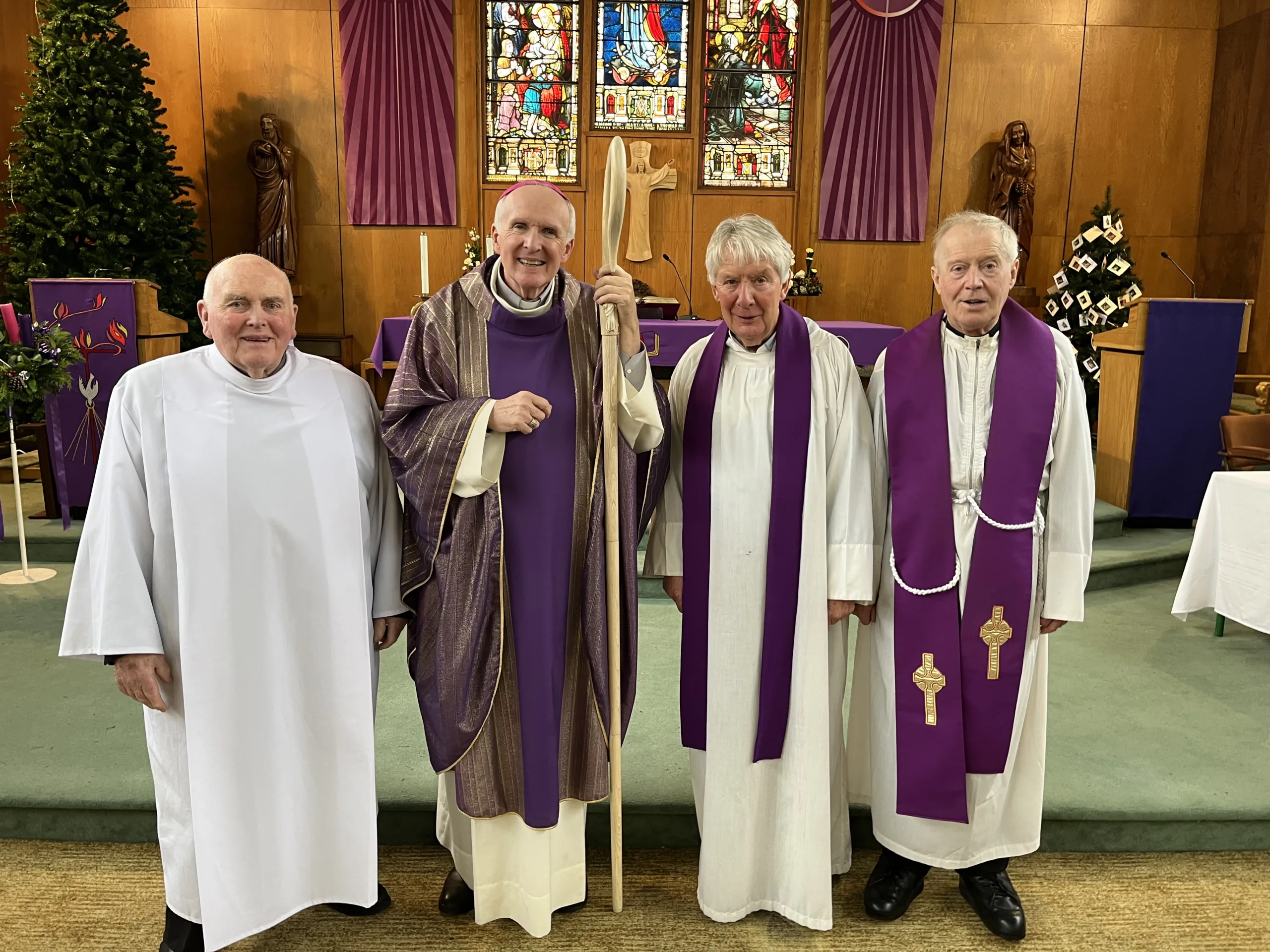 Canon Des McAulliffe, Bishop Brendan Leahy, and Canon John Daly at the Holy Rosary Parish Church 75th anniversary celebrations. Photo: James Dormer.
